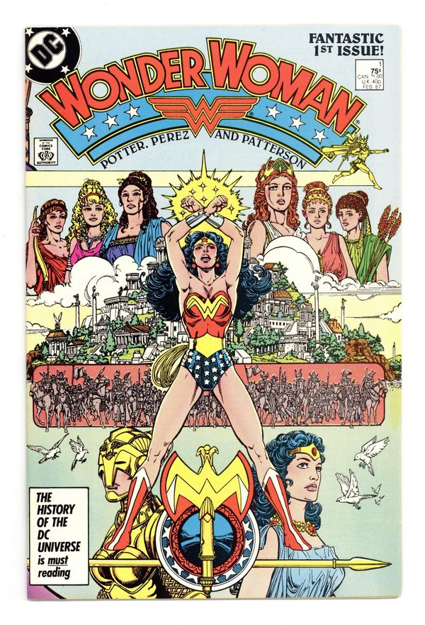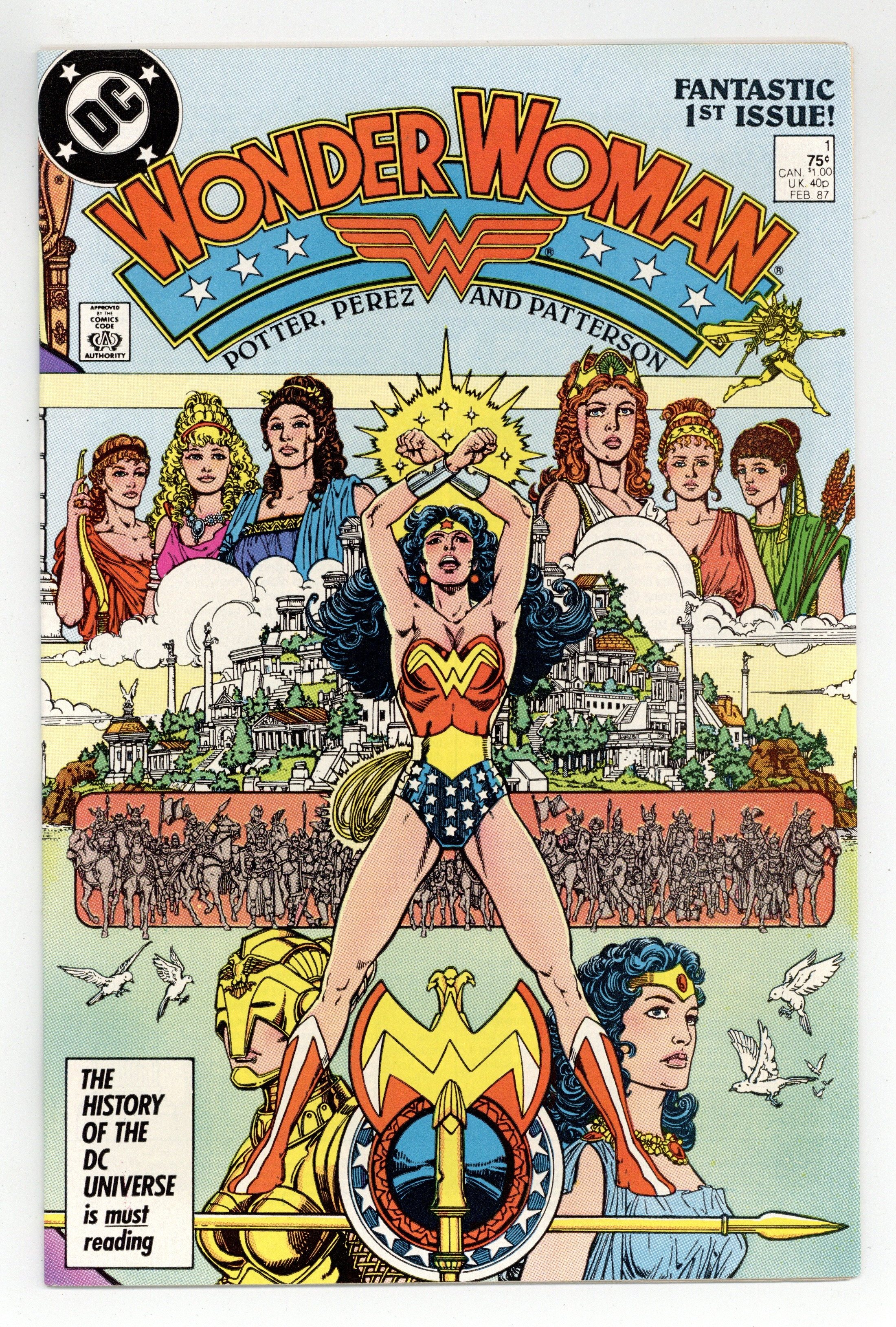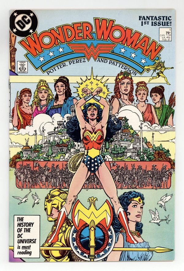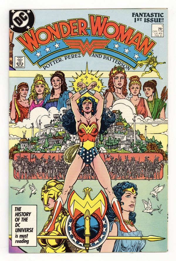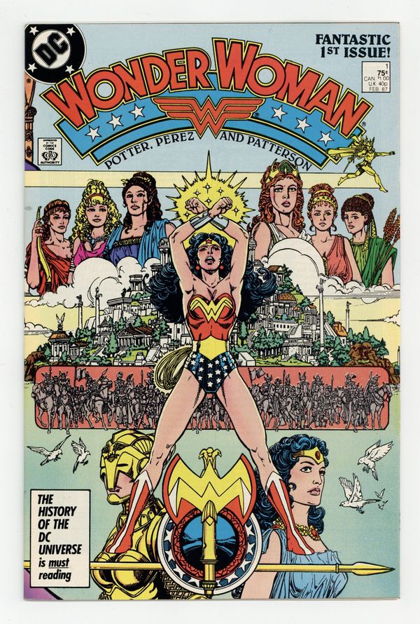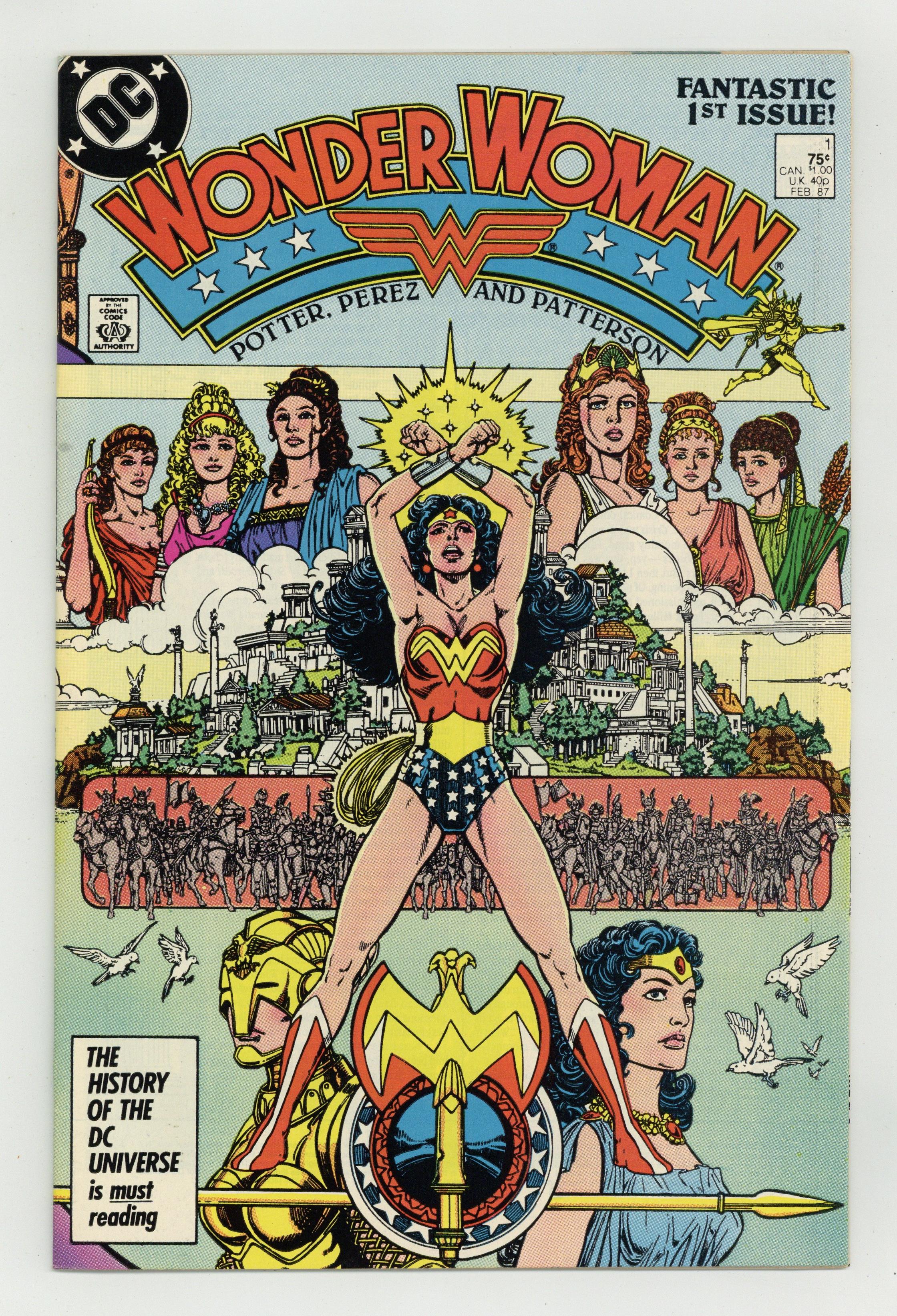 Starts Jan 3 Direct Edition. In this post-Crisis on Infinite Earths re-imagining of the Wonder Woman mythos, Diana is born of clay, growing on Paradise Island to become the champion of the Amazons. "The Princess and the Power!" Part 1 of 6, continued next issue. Script by Greg Potter, co-plot and pencils by George Perez, inks by Bruce Patterson. Perez inks first 2 pages and the final page. Wrap-around cover. No ads. Perez cover. 36 pgs. Cover price $0.75.