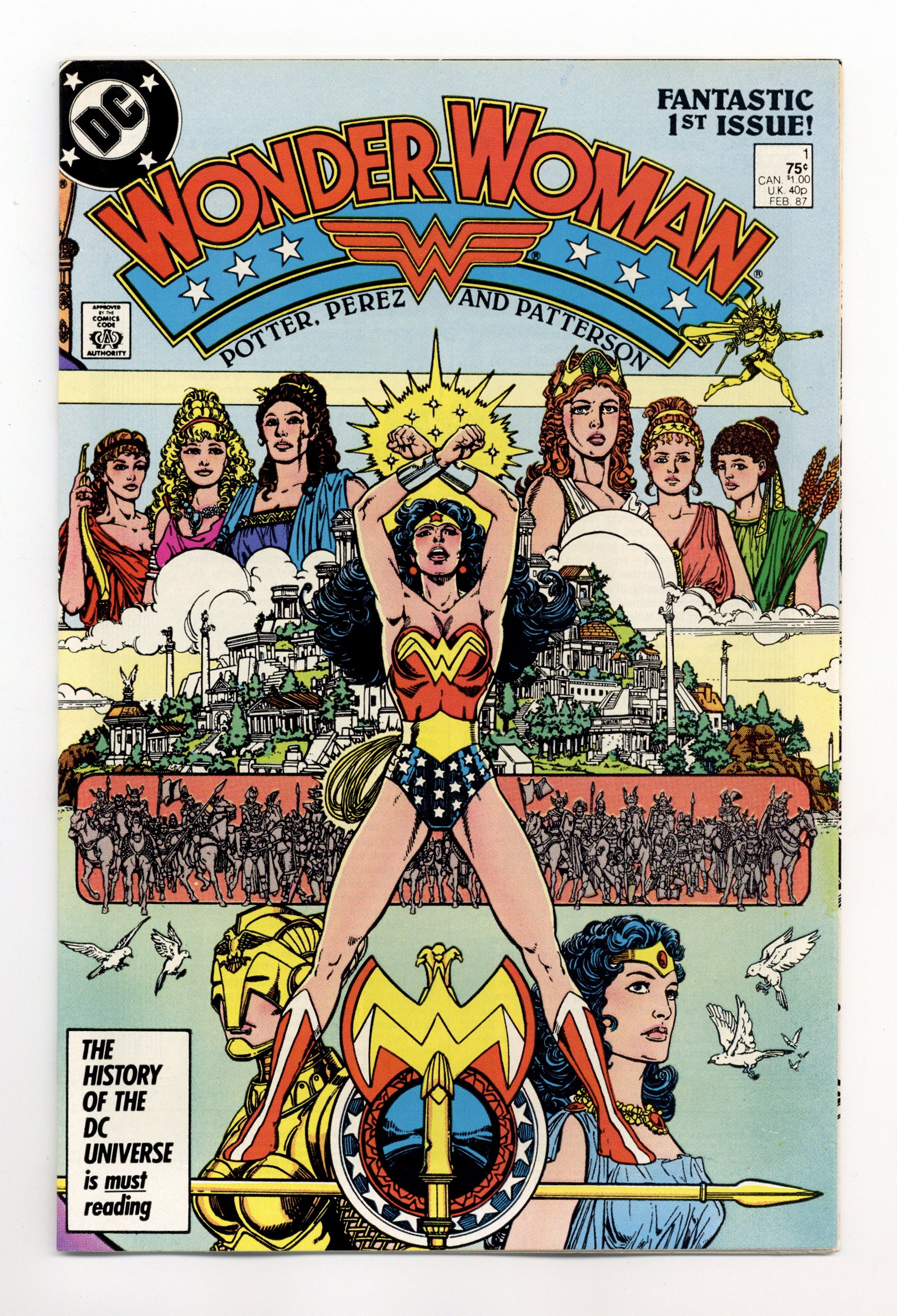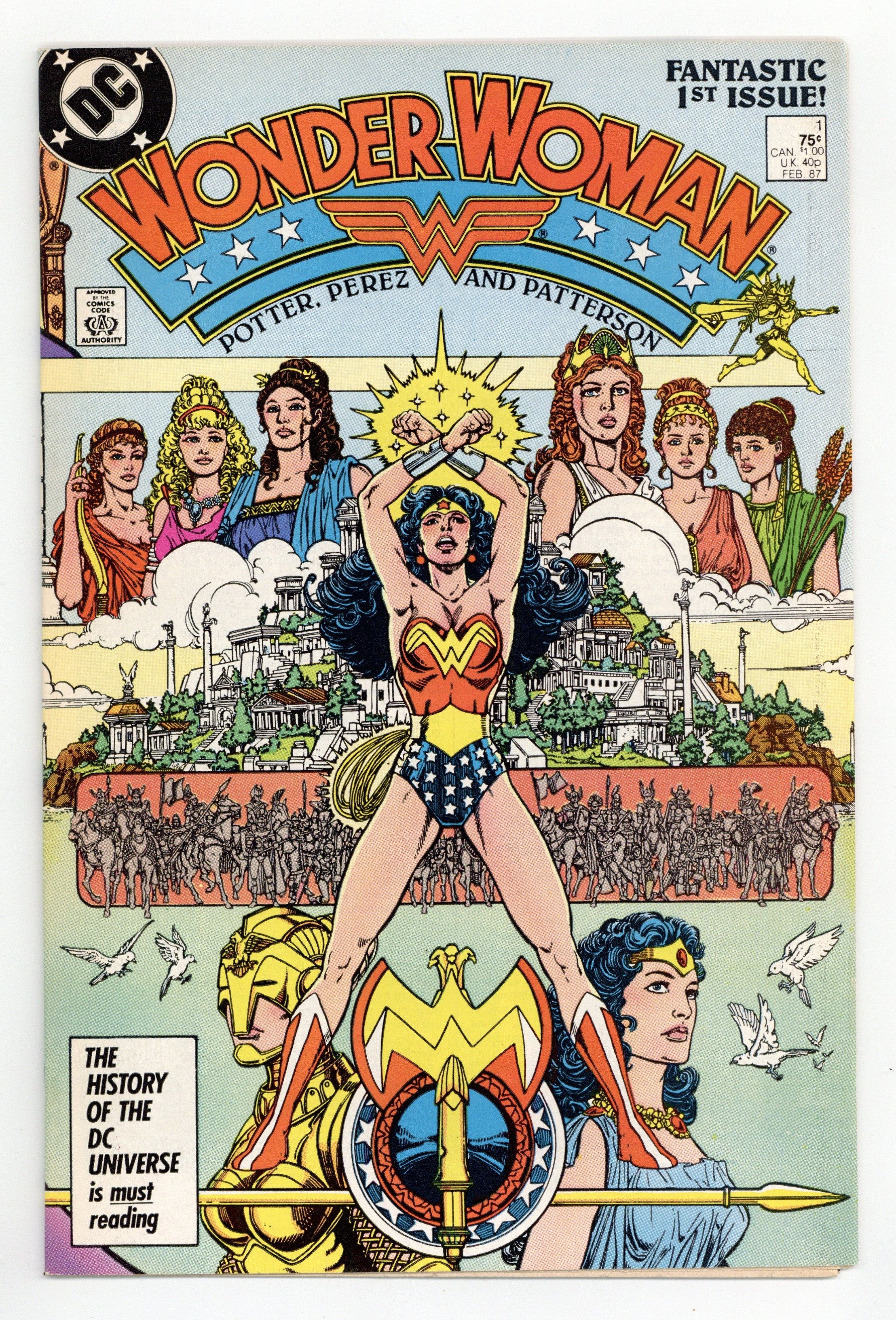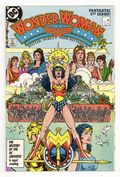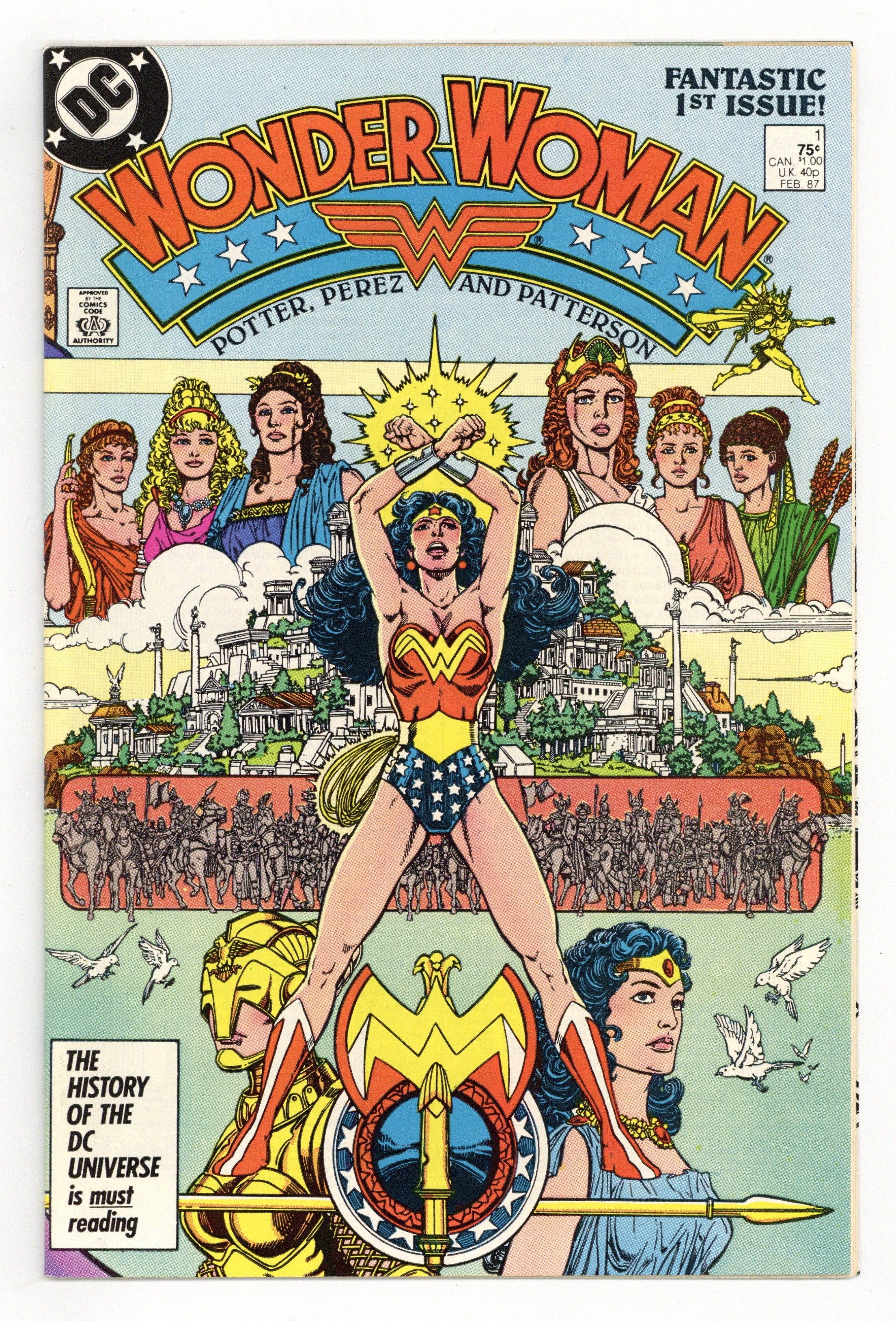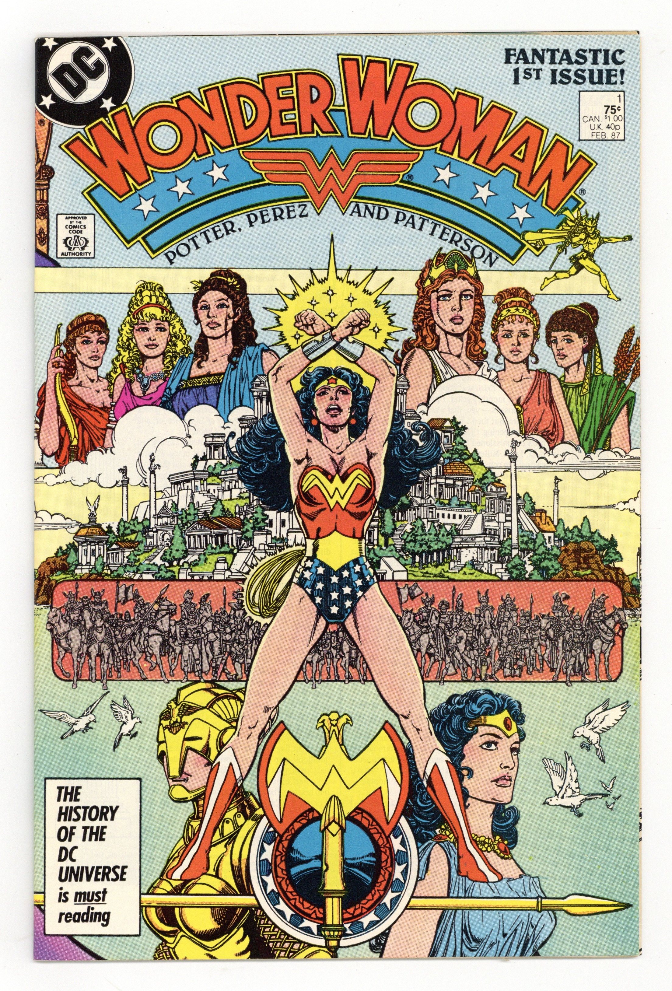 Starts Jan 3 Direct Edition. In this post-Crisis on Infinite Earths re-imagining of the Wonder Woman mythos, Diana is born of clay, growing on Paradise Island to become the champion of the Amazons. "The Princess and the Power!" Part 1 of 6, continued next issue. Script by Greg Potter, co-plot and pencils by George Perez, inks by Bruce Patterson. Perez inks first 2 pages and the final page. Wrap-around cover. No ads. Perez cover. 36 pgs. Cover price $0.75.