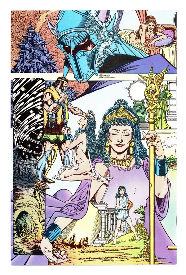 Tags: Wonder Woman$12.50Direct Edition. In this post-Crisis on Infinite Earths re-imagining of the Wonder Woman mythos, Diana is born of clay, growing on Paradise Island to become the champion of the Amazons. "The Princess and the Power!" Part 1 of 6, continued next issue. Script by Greg Potter, co-plot and pencils by George Perez, inks by Bruce Patterson. Perez inks first 2 pages and the final page. Wrap-around cover. No ads. Perez cover. 36 pgs. Cover price $0.75.