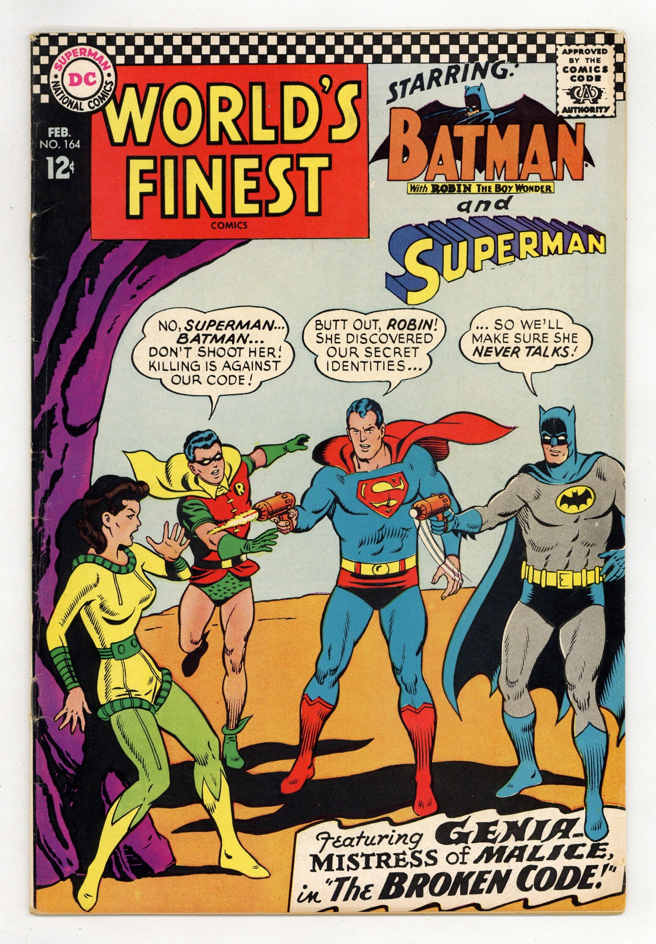 Tags: Superman$15.00Cover pencils by Curt Swan, inks by George Klein. Brainiac's Super Brain-Child starring Superman and Batman, script by Leo Dorfman, pencils by Curt Swan, inks by George Klein; Brainiac creates a female shaped robot and disguises it as Madame Tru, Chairman of the U.N. Security Council. The Brush That Could Haunt Men's Souls--Editors' Round Table: House of Mystery, script by Jack Miller, art by Jim Mooney. 36 Pages, Full Color. Cover price $0.12.