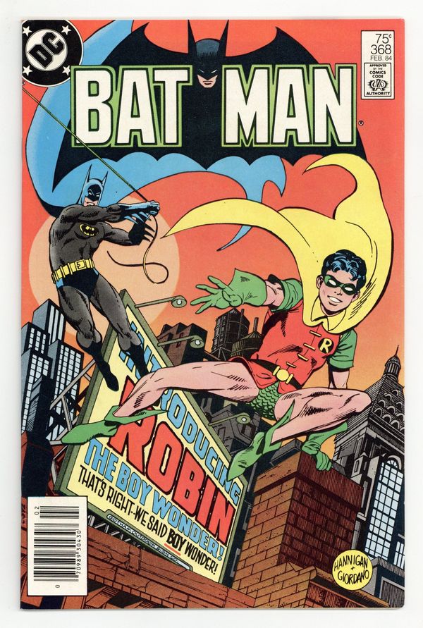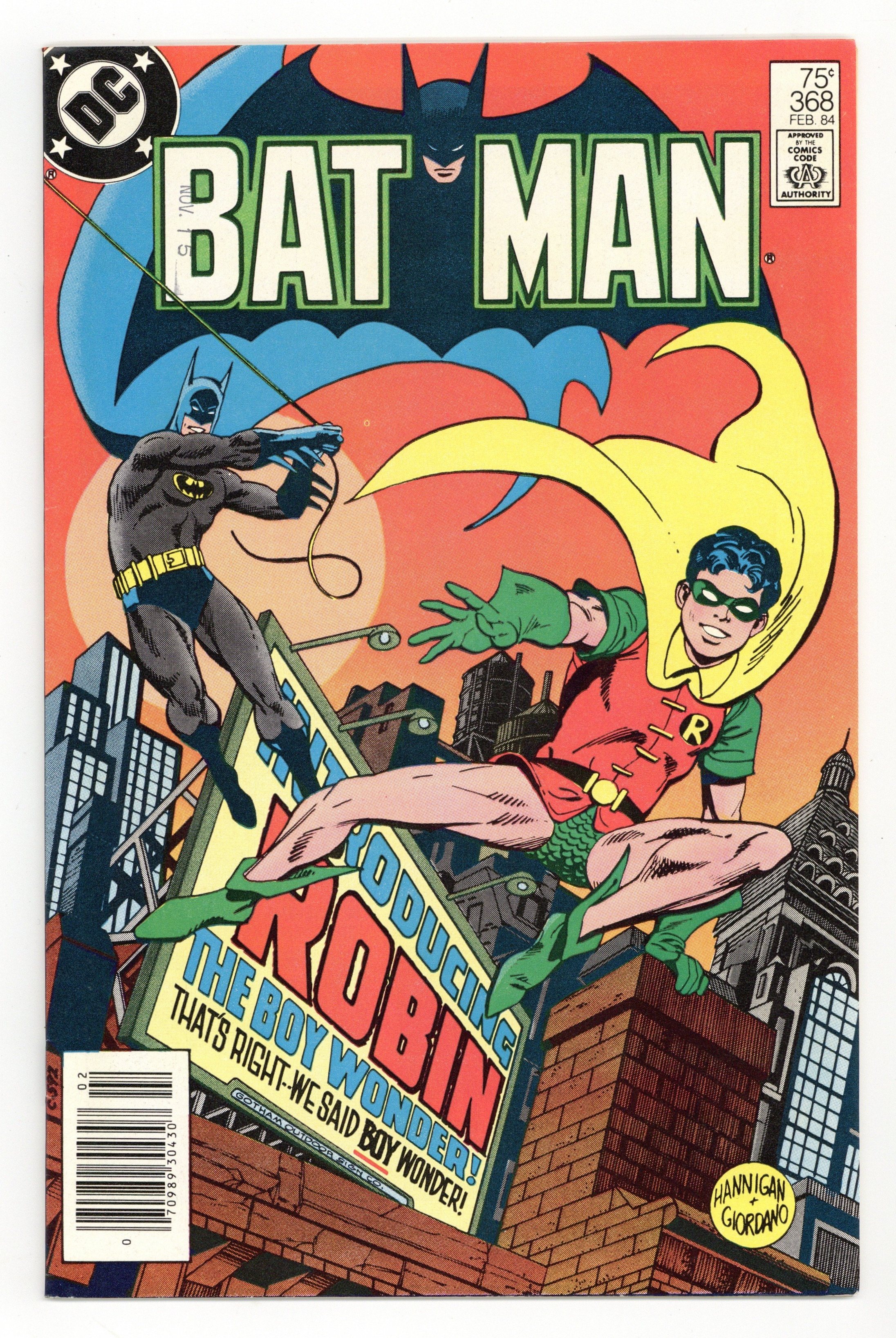 Tags: Batman$42.00Newsstand Edition. Cover pencils by Ed Hannigan, inks by Dick Giordano. In this key issue, Jason Todd begins as the new Robin (with a new costume) in a book-length story titled "A Revenge of Rainbows" starring Batman, Robin, Crazy-Quilt, Dick Grayson, Vicki Vale, Joker (flashback), Two-Face (flashback), Scarecrow (flashback), and Penguin (flashback), script by Doug Moench, pencils by Don Newton, inks by Alfredo Alcala; Dick Grayson officially passes along the mantle of Robin to Jason Todd, who accompanies Batman on a "shakedown cruise" around Gotham. 36 Pages, Full Color. Cover price $0.75.