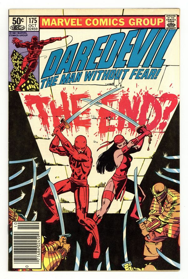 Newsstand Edition. Cover pencils by Frank Miller, inks by Klaus Janson. Gantlet, script by Frank Miller, pencils by Frank Miller (breakdowns) and Klaus Janson (finished art), inks by Klaus Janson; DD is without his radar sense and teamed-up with Elektra against the Hand and their master assassin, Kirigi; While Matt is off fighting ninja, Foggy is defending the Gladiator in court. Full page pin-up ad for Spider-Woman, pencils by Denys Cowan, inks by Al Milgrom. 36 pgs. Cover price $0.50. Cover price $0.50.