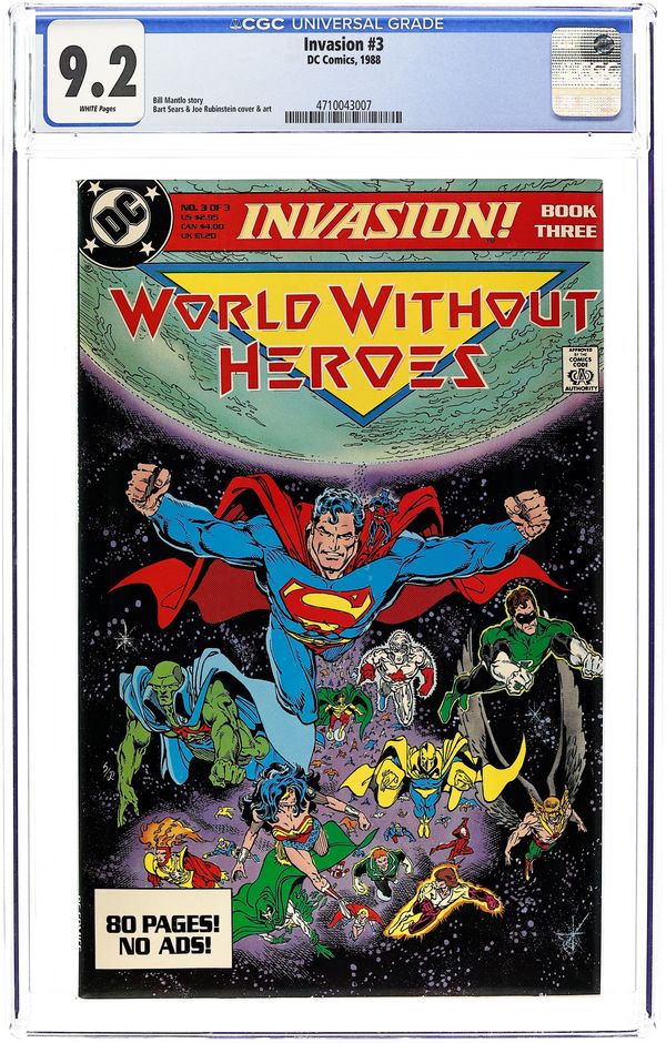 "World without Heroes!" Written by Keith Giffen and Bill Mantlo. Art by Bart Sears, Joe Rubinstein and Tom Christopher. What happens when our heroes fail? Will planet Earth fall under the sinister rule of the alien Dominators? Don't miss the exciting, pulse-pounding conclusion to the DC event of the year! 80 pages, FC. Cover price $2.95.