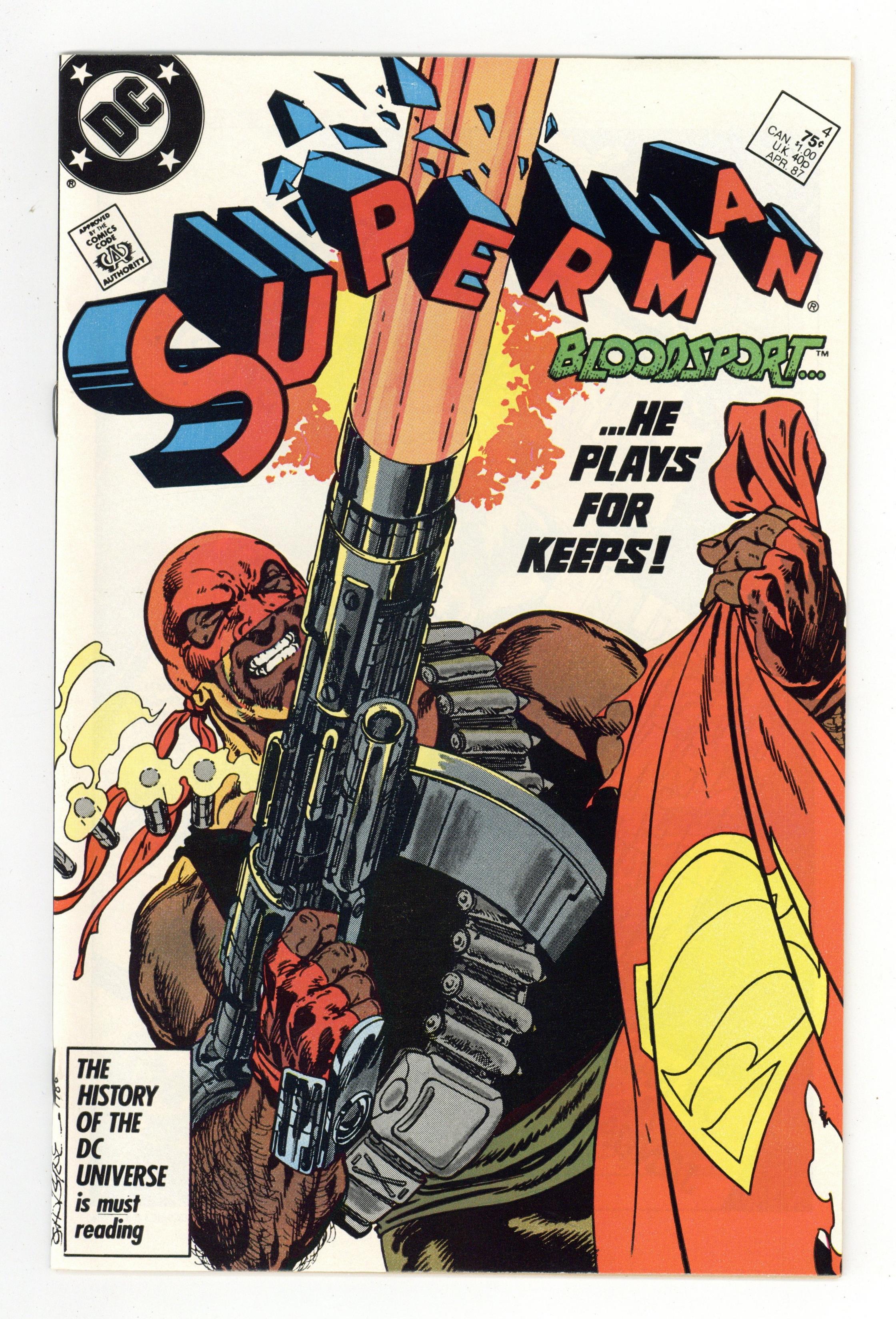 Tags: Superman$6.00Direct Edition. "Superman's Pal, Jimmy Olsen!" Story by John Byrne. Art by John Byrne and Karl Kesel. Imagine the death and destruction a sadistic madman could cause if he were able to have any weapon he could think of appear in his hand simply by wishing it to. Well the man called Bloodsport has this ability. Can Superman stop this maniacal killer before more innocent lives are lost? Featuring Jimmy Olsen. Cover price $0.75.