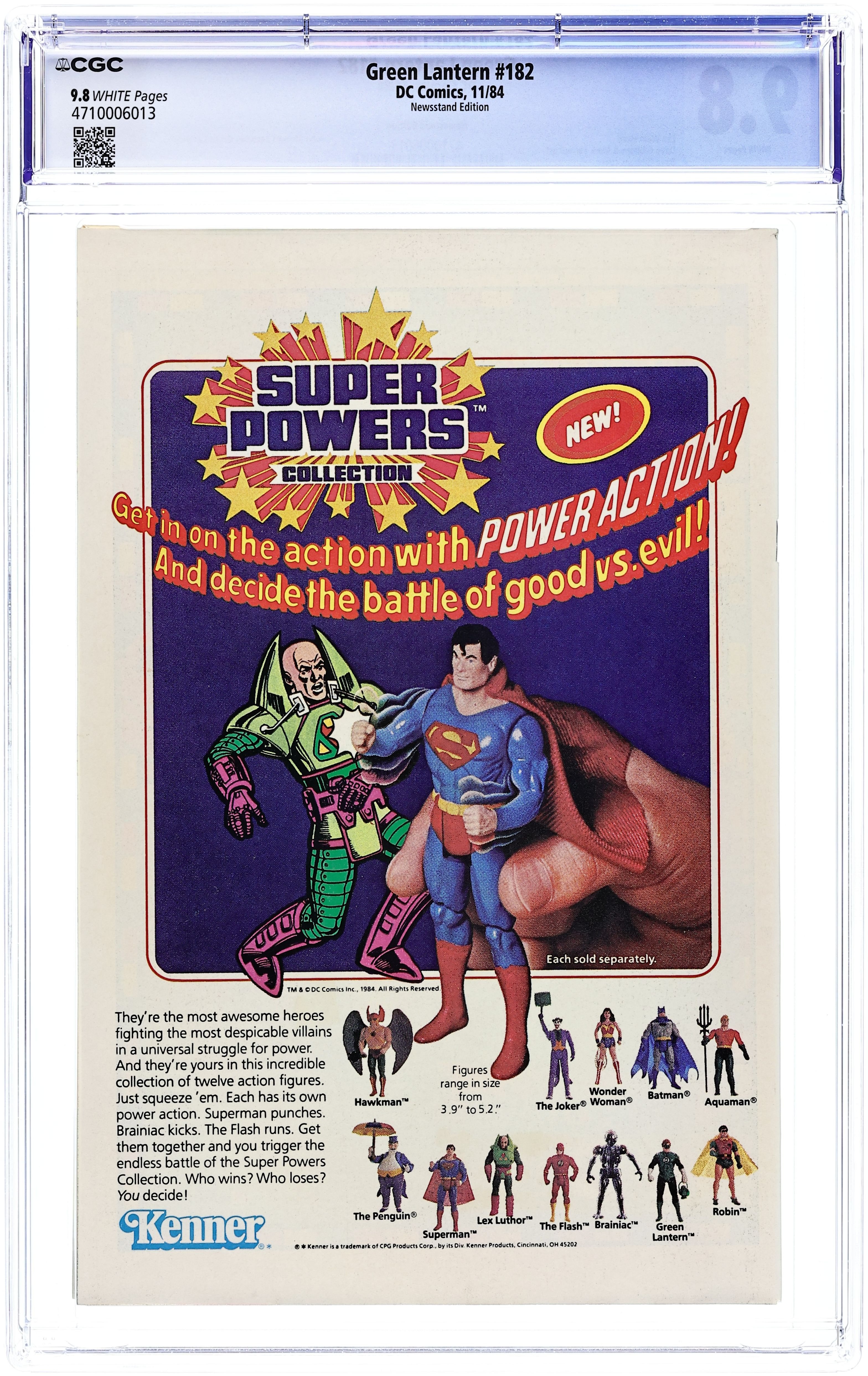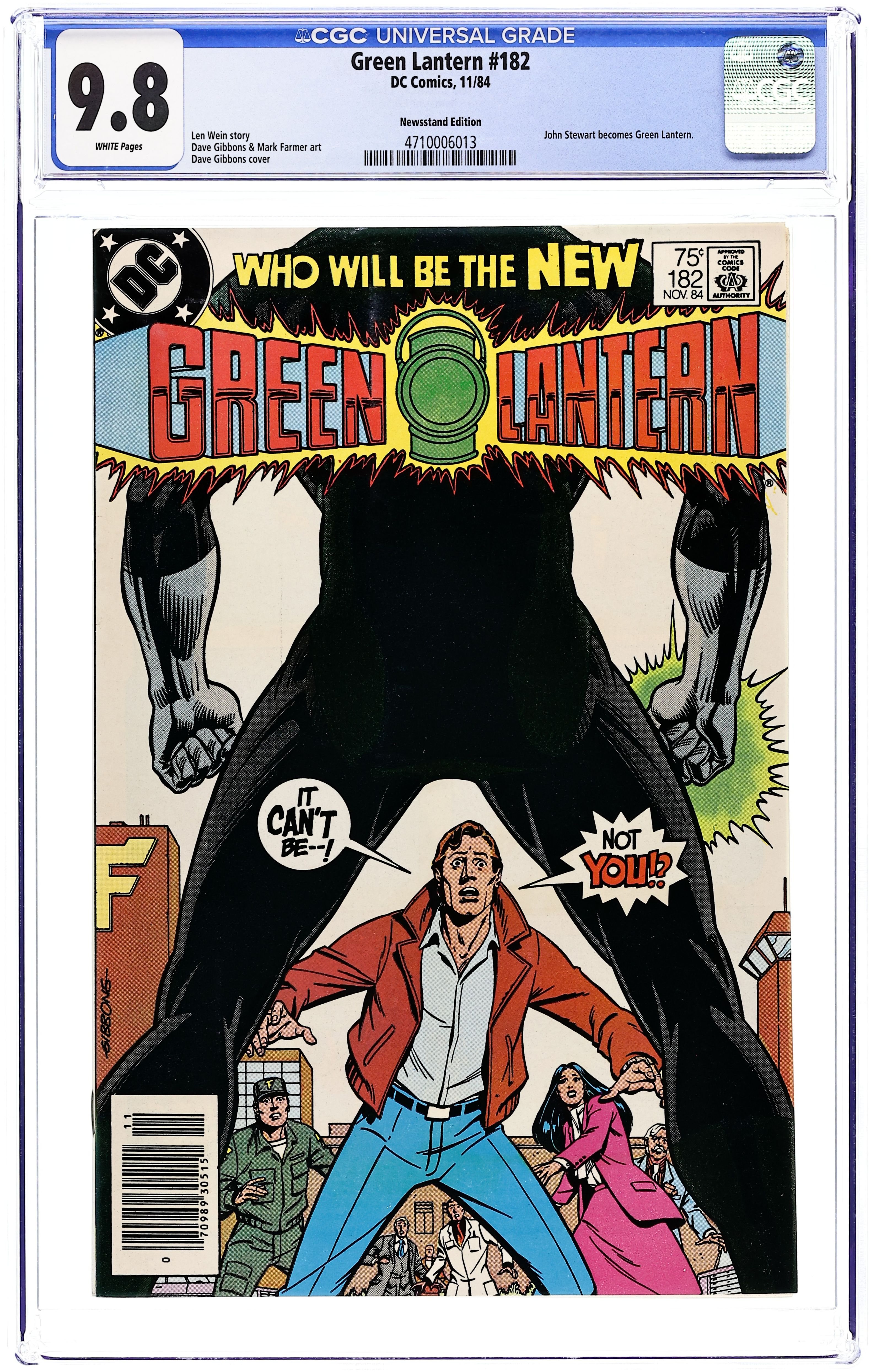 Newsstand Edition. "It's a Dirty Job, But...!" Major Disaster insists on fighting Hal Jordan, but John Stewart has taken over as Green Lantern of Earth. Disaster threatens to destroy Coast City. Script by Len Wein, pencils by Dave Gibbons, inks by Mark Farmer. "I, Lantern" part one. Yron of Grenda becomes a Green Lantern in this Tales of the Green Lantern Corps backup story. Script by Joey Cavalieri, art by Kevin O'Neill. Cover by Gibbons. Cover price $0.75.