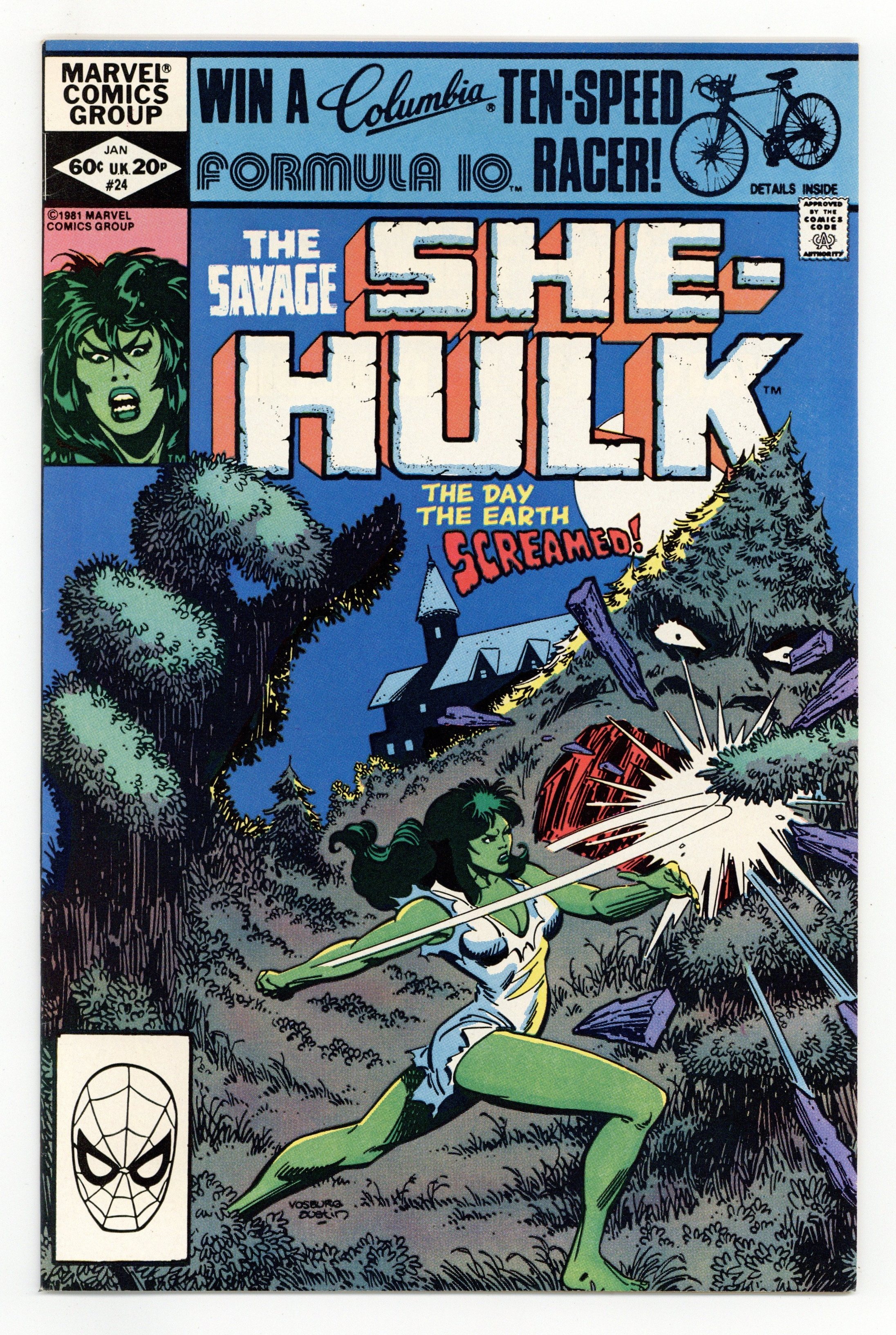 Direct Edition. "The Day the Planet Screamed!" Story by David Anthony Kraft. Art by Mike Vosburg, Al Milgrom, Sal Trapani, Armondo Gil. Tired of the many attempts on her life in resent weeks, the Savage She-Hulk decides to take the fight to Shade. But how can she hope to win when the very ground she walks on rises up to attack her. Cover price $0.60.