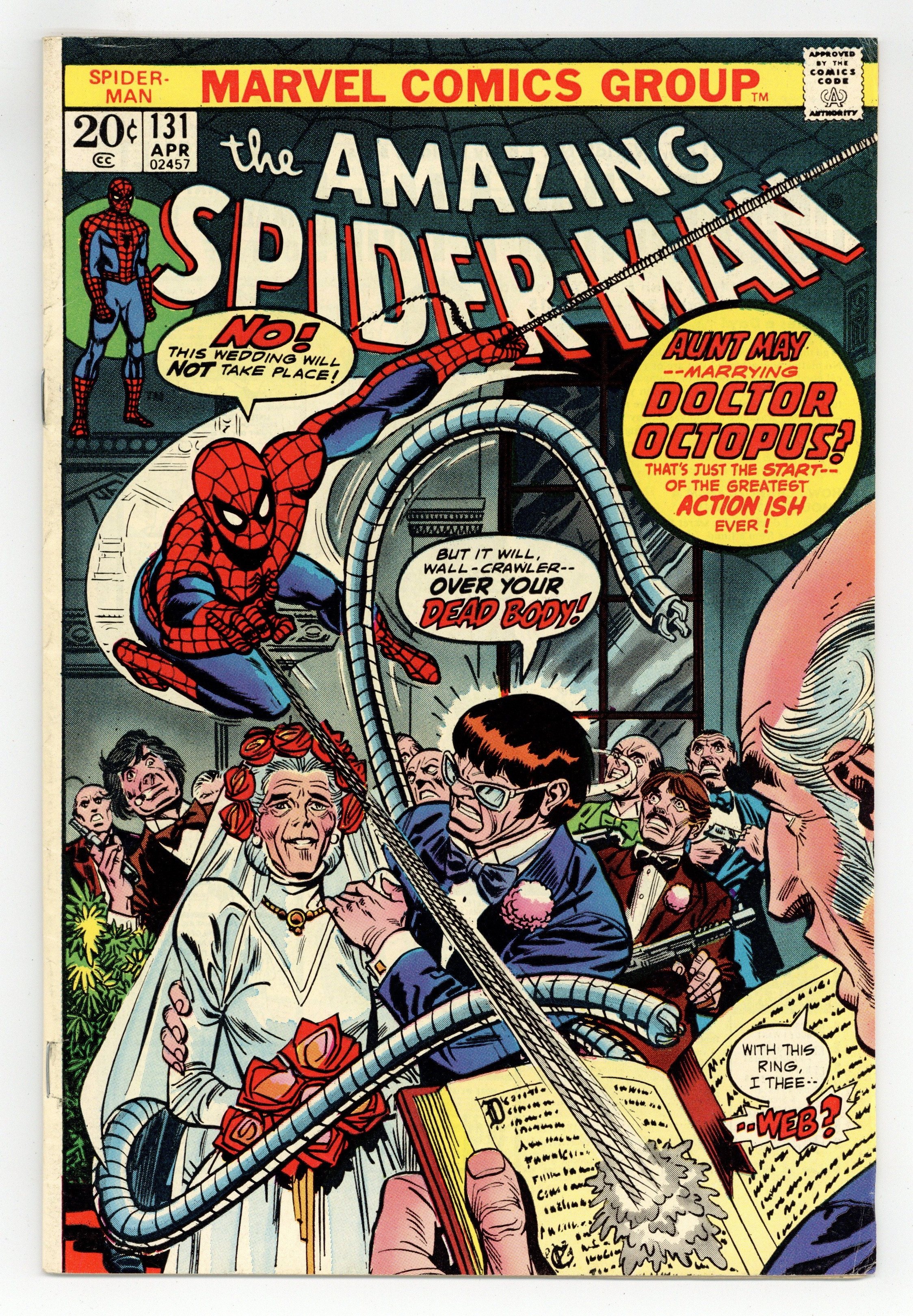"My Uncle...My Enemy?" Part 2 of 2. Script by Gerry Conway. Pencils by Ross Andru. Inks by Frank Giacoia and Dave Hunt (backgrounds). Cover by Gil Kane and Frank Giacoia. In an unbelievable development, Aunt May is about to marry Dr. Octopus! What?! The wondrous wall-crawler rushes to Westchester to crash the wedding! But that won't be necessary, because Hammerhead rends it asunder all by himself! In the chaos that ensues, Doc Ock and Aunt May flee via helicopter to a small Canadian island...that happens to be home to a nuclear power plant! Also, during the mêlée, the quick-thinking web-slinger hitches a ride on Hammerhead's chopper! Eventually all parties arrive north of the border and the final free-for-all begins...right next to the atomic reactor! Oh my, what a disastrous mix! How is the wall-crawler going to prevent a nuclear meltdown much less save his dear Aunt May? Cameo appearances by Mary Jane Watson, Betty Brant, Ned Leeds, Joe Robertson, and J. Jonah Jameson. (Notes: Hammerhead and Dr. Octopus continue their vendetta against each other and the web-slinger in Amazing Spider-Man 157. The letters page includes Marvel Value Stamp series A #34 Mr. Fantastic by Jack Kirby. This story was reprinted in Marvel Tales 108.) 36 pages. 20 cent cover price. Cover price $0.20.