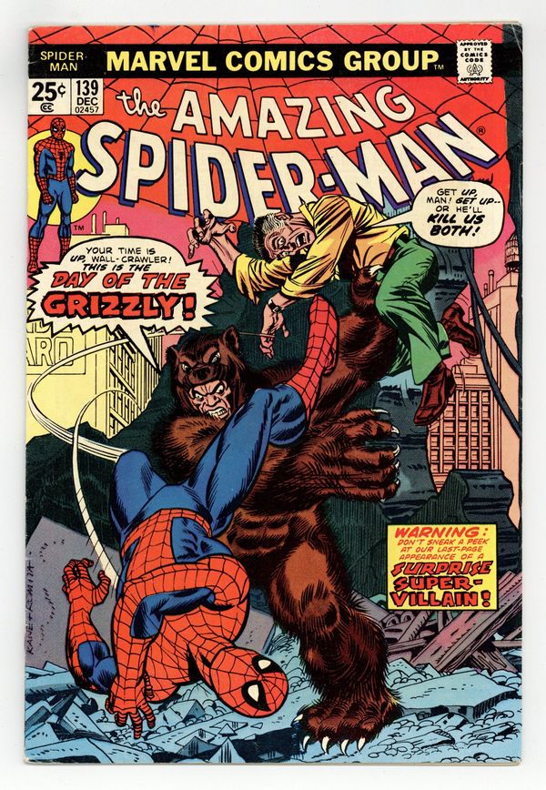 Tags: Marvel Legacy Numbering: Amazing Spider-Man (part 139), Spider-Man$15.00"Day of the Grizzly!" Part 1 of 2. Script by Gerry Conway. Pencils by Ross Andru. Inks by Frank Giacoia and Dave Hunt (backgrounds). Cover by Gil Kane (pencils) and John Romita Sr. (inks). Peter Parker finds a new place to live at 410 Chelsea Street! And when he stops by the Daily Bugle to tell his friends...the Grizzly attacks! Whoa, were did this 9-foot super-villain come from? There's no time for questions or answers as the web-slinger leaps into action! But the Grizzly is loaded for bear and then some! All the amazing one can do is save J. Jonah Jameson while the Grizzly escapes! However courtesy of the Jackal, the rematch is coming next issue! First appearance of the Grizzly. Cameo appearances by Betty Brant, Liz Allan, and Joe Robertson. (Notes: The letters page includes Marvel Value Stamp series A #42 Man-Wolf by Gil Kane and Mike Esposito. This story was reprinted in Marvel Tales 116.) 36 pages. 25c cover price. Cover price $0.25.