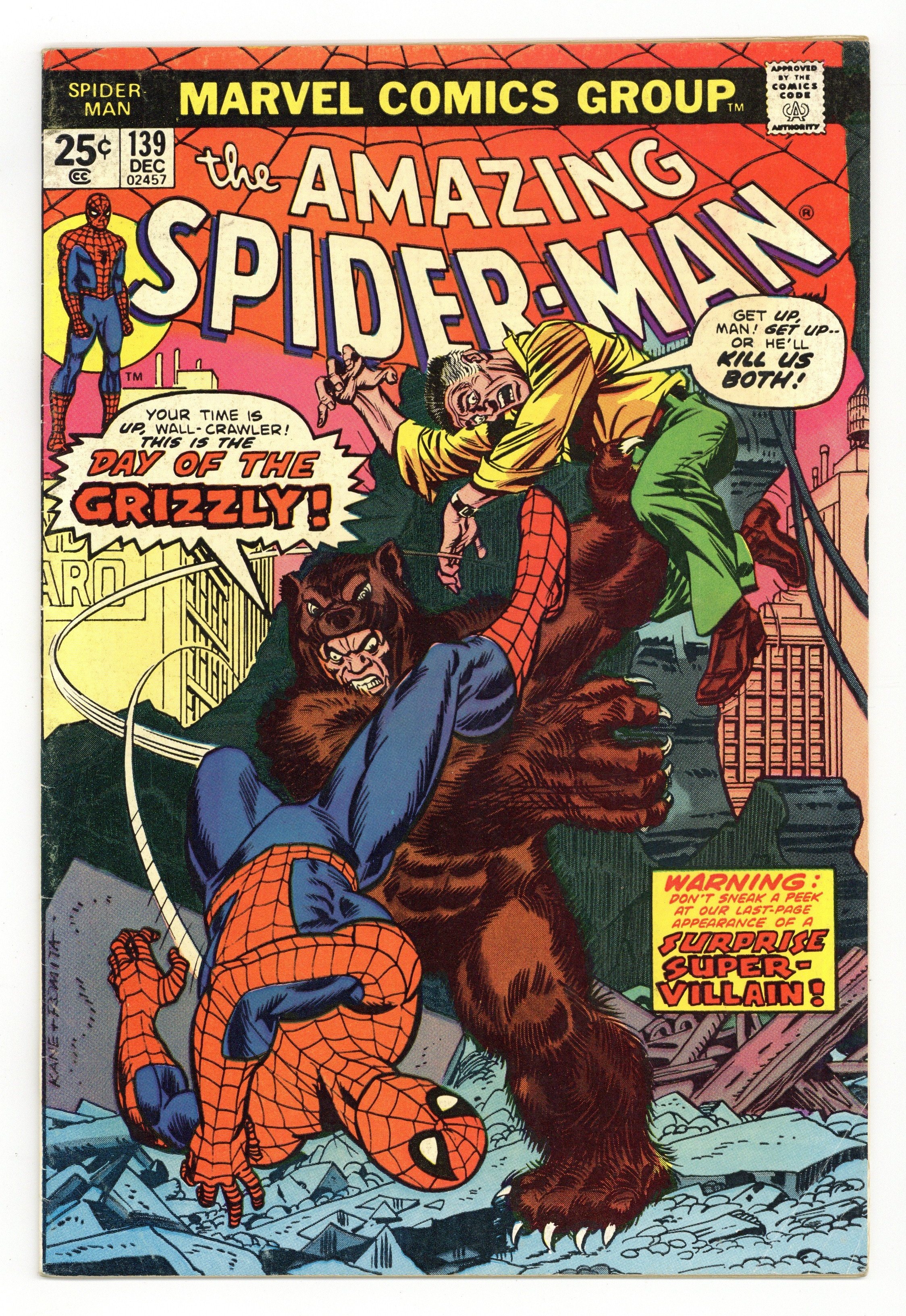 "Day of the Grizzly!" Part 1 of 2. Script by Gerry Conway. Pencils by Ross Andru. Inks by Frank Giacoia and Dave Hunt (backgrounds). Cover by Gil Kane (pencils) and John Romita Sr. (inks). Peter Parker finds a new place to live at 410 Chelsea Street! And when he stops by the Daily Bugle to tell his friends...the Grizzly attacks! Whoa, were did this 9-foot super-villain come from? There's no time for questions or answers as the web-slinger leaps into action! But the Grizzly is loaded for bear and then some! All the amazing one can do is save J. Jonah Jameson while the Grizzly escapes! However courtesy of the Jackal, the rematch is coming next issue! First appearance of the Grizzly. Cameo appearances by Betty Brant, Liz Allan, and Joe Robertson. (Notes: The letters page includes Marvel Value Stamp series A #42 Man-Wolf by Gil Kane and Mike Esposito. This story was reprinted in Marvel Tales 116.) 36 pages. 25c cover price. Cover price $0.25.