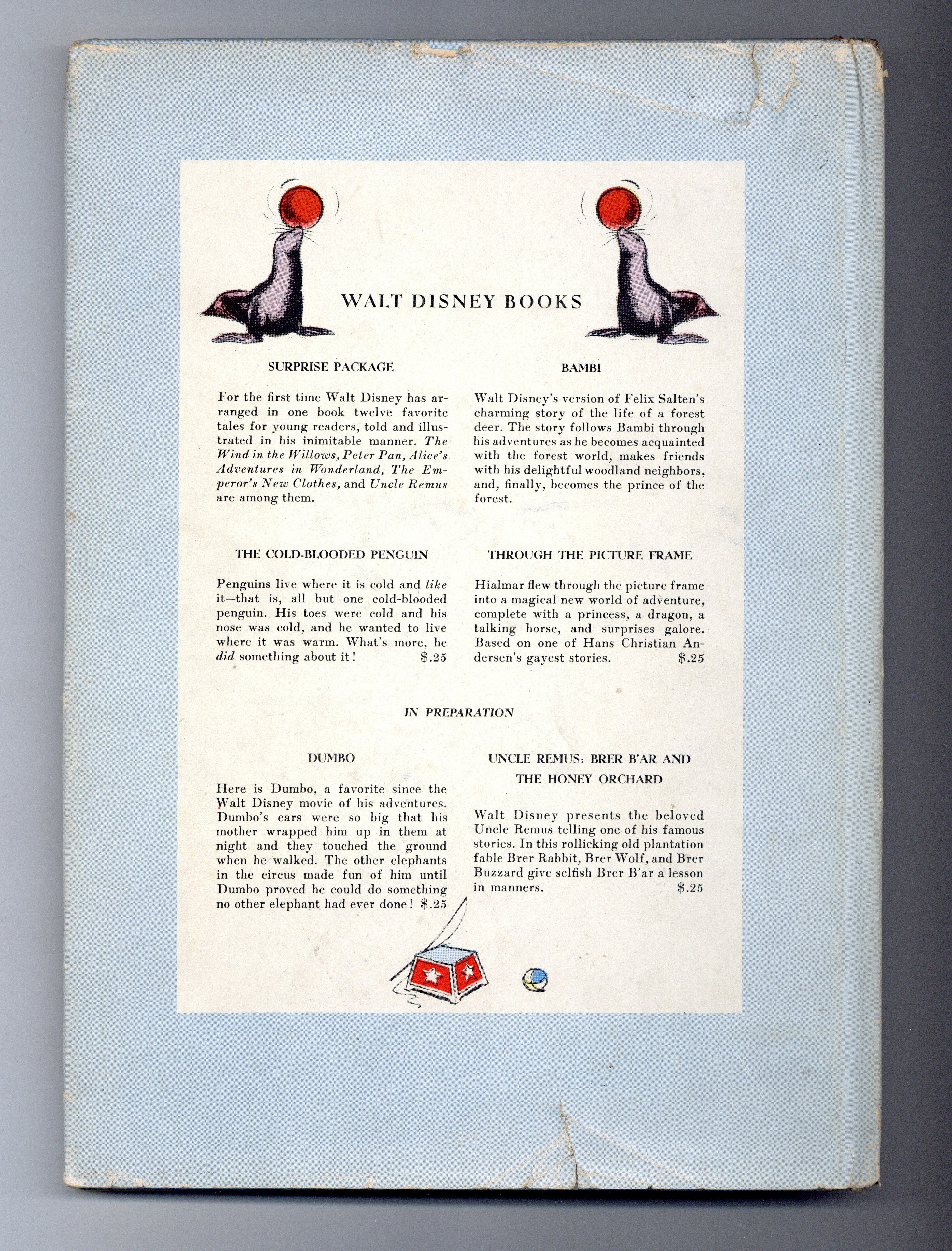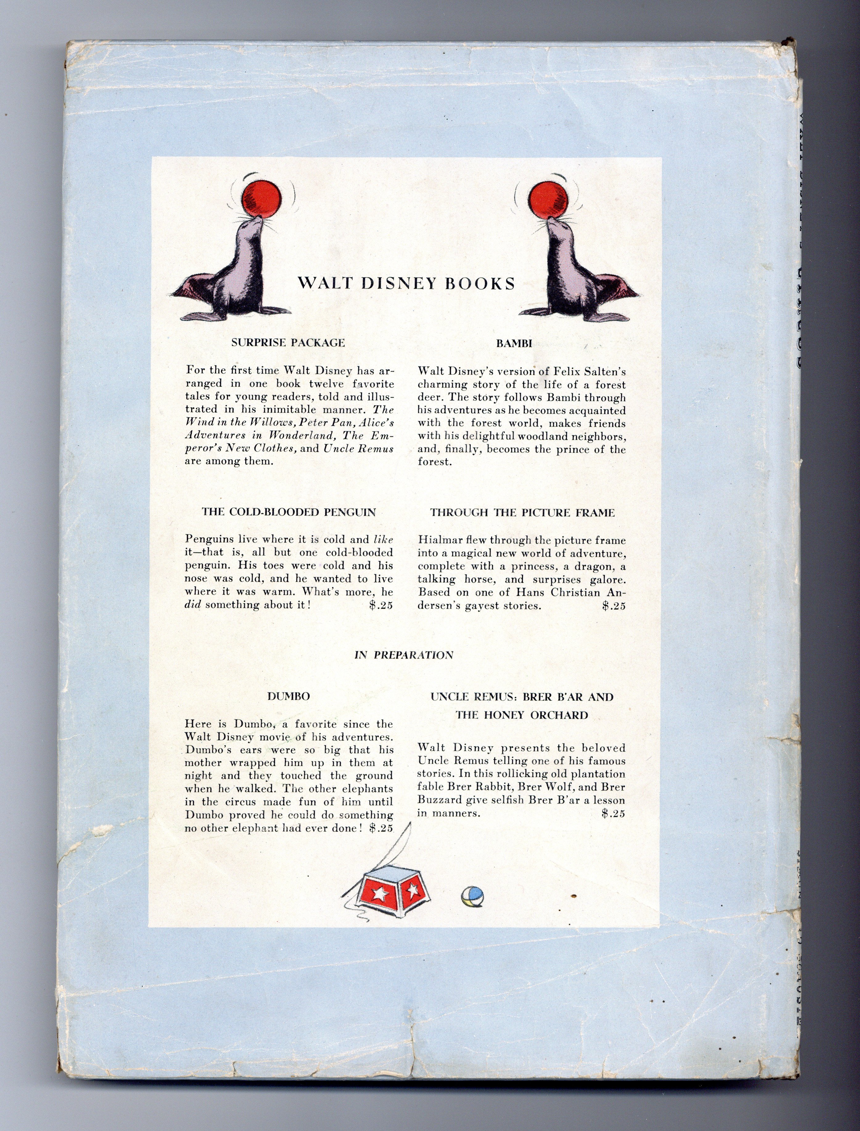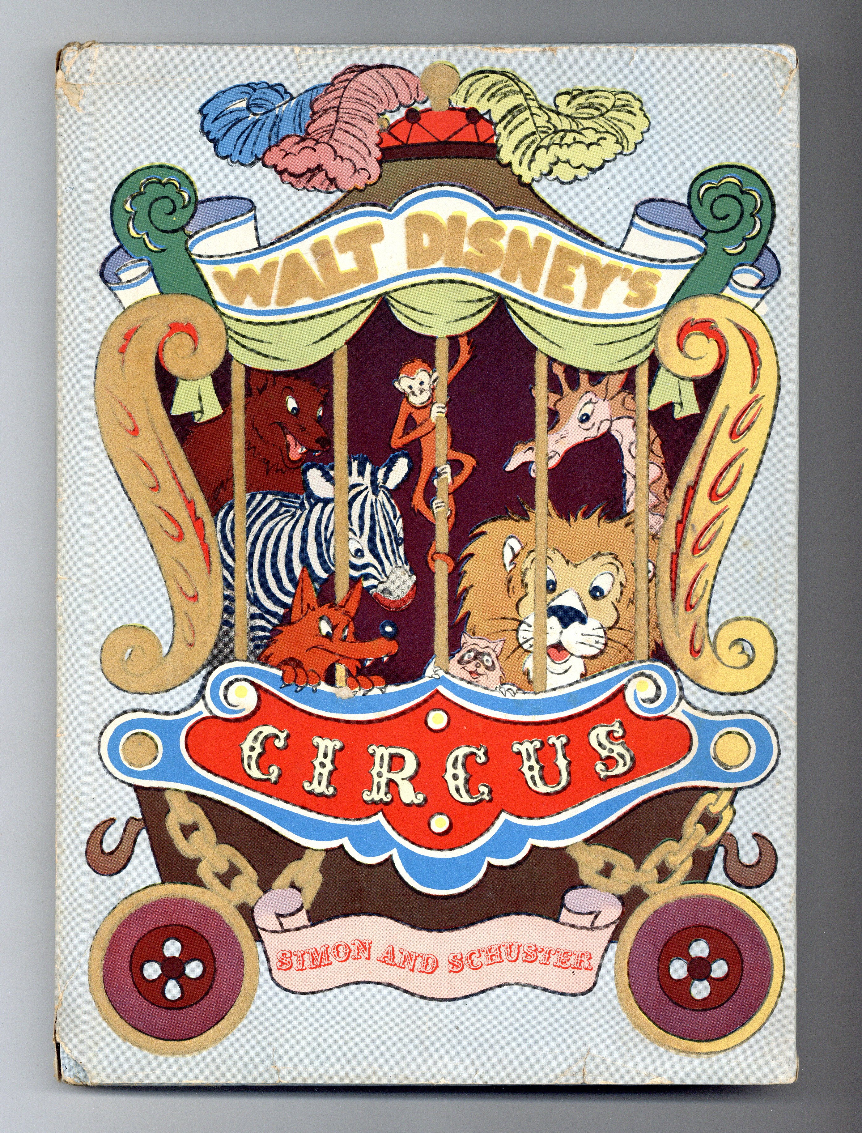 First Edition - 1944. Step right this way, boy and girls, for the gayest, funniest circus you have ever seen - all pictured in bright, jolly colors. A whole trainload of Walt Disney's own matchless animals are here to perform for you. Illustrated in color throughout, including flocking to 12 pages and the front of both the book and dust jacket. Hardcover with dust jacket, 8" x 11.25", 32 pages, full color. Cover price $1.00.