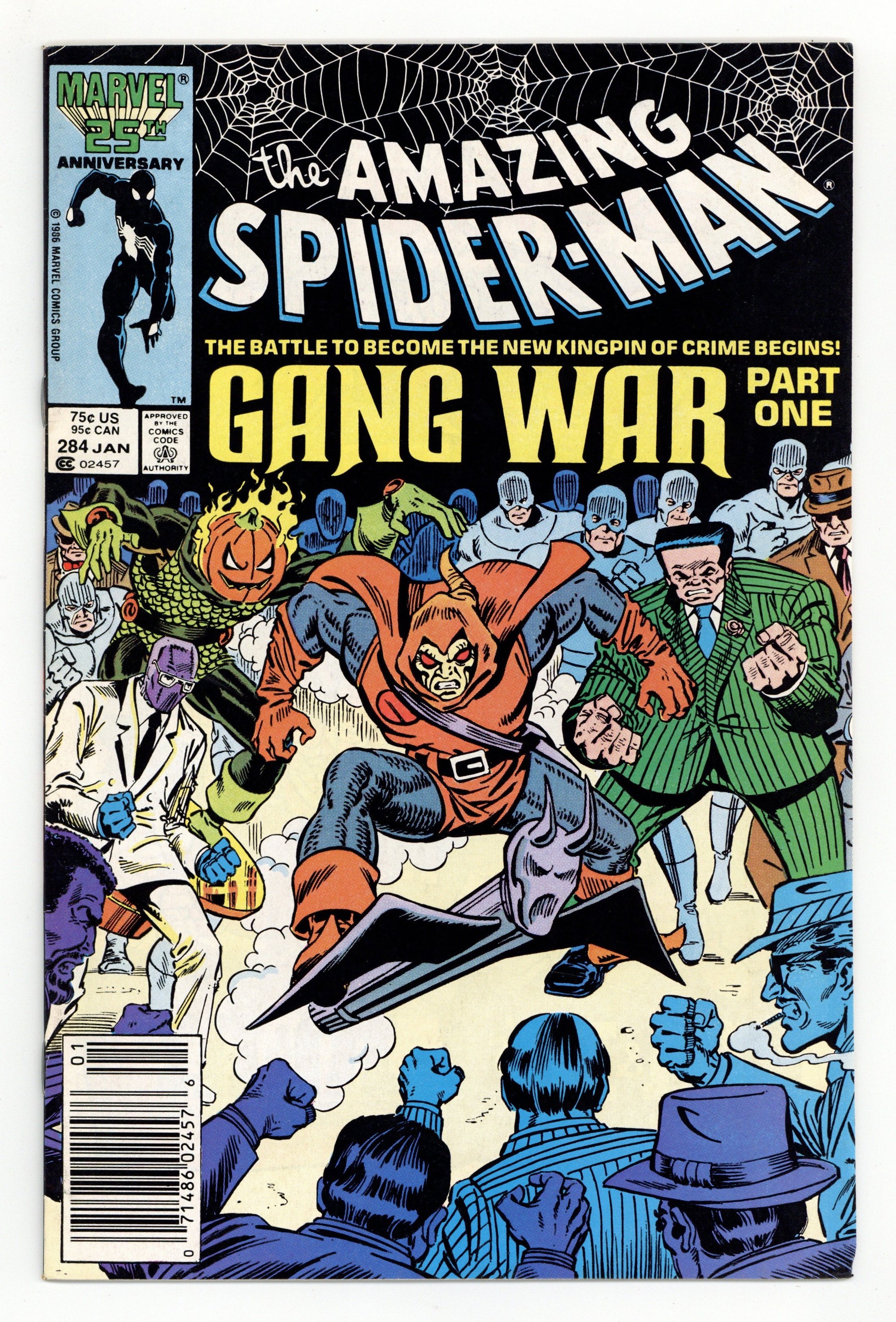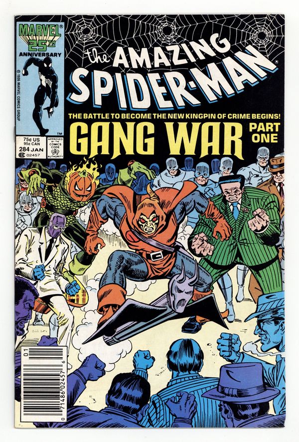 Newsstand Edition. Gang War: Part 1 of 5 -- "And Who Shall Stand Against Them...?" Plot by Tom DeFalco. Script by Jim Owsley. Art by Ron Frenz (layouts), Brett Breeding (pencils), and Joe Rubinstein (inks). Cover by Ron Frenz. The Kingpin has left New York! And now every crime boss, large or small, is vying for the top spot in the Big Apple! It's a bloodbath in the streets as the Hobgoblin, Rose, Jack O'Lantern, Hammerhead, Silvermane, and the Arranger battle for supremacy! And of course your friendly neighborhood Spider-Man is caught in the crossfire! But this gang war is so big, the web-slinger may get help from other super-heroes (or anti-heroes)...whether he wants it or not! Cameo appearances by Betty Leeds, Flash Thompson, Ben Urich, Lance Bannon, Roderick Kingsley, J. Jonah Jameson, Joe Robertson, Aunt May, Mary Jane Watson, and the Punisher. Flashback cameos by Daredevil and the Kingpin. 36 pages. Cover price $0.75.
