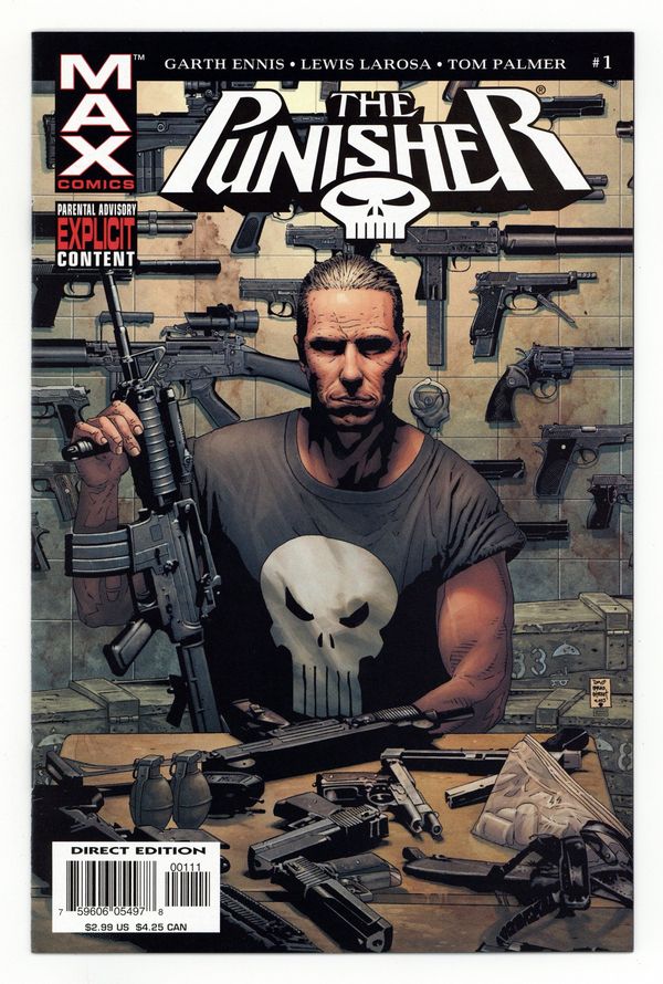 Written by GARTH ENNIS Pencils by LEWIS LAROSA Covers by TIM BRADSTREET "IN THE BEGINNING" pt. 1 of 6?Garth Ennis finally lets loose to take Punisher to the MAX ? literally ? as the hunter becomes the hunted! No more pulled punches, no more dialing it down. One of comics' most provocative writers takes one of comics' most provocative characters in a new direction ? ANY direction he wants! 32 PGS. PARENTAL ADVISORY $2.99 Cover price $2.99.