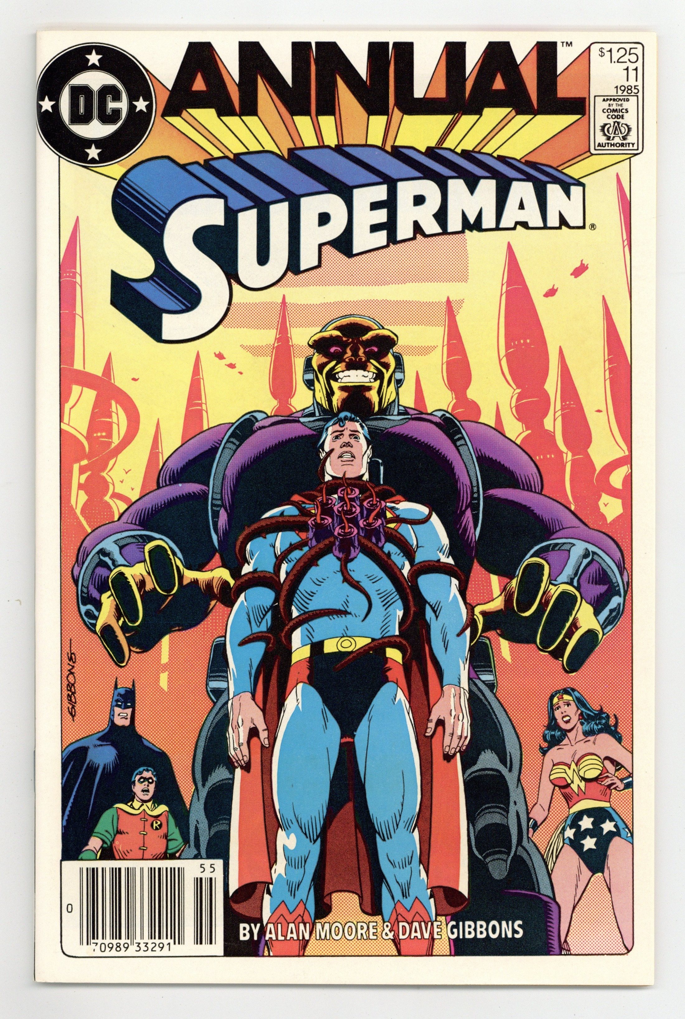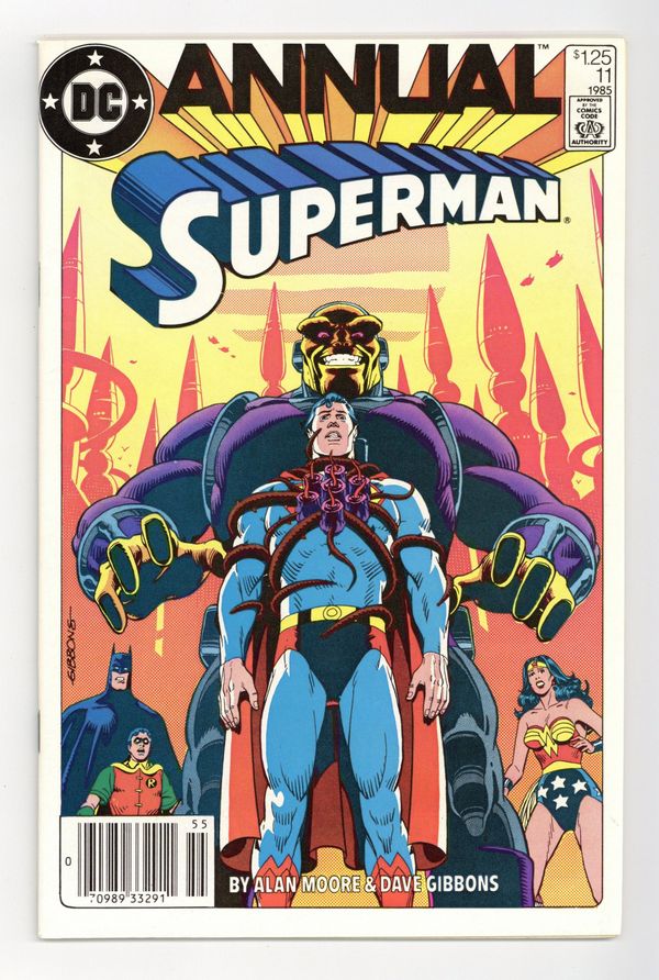 Newsstand Edition. "For the Man Who Has Everything!" Guest-starring Wonder Woman, and Batman and Robin. Written by Alan Moore. Art by Dave Gibbons. The amazing creative team that brought you Watchmen deliver one of the all-time great Superman tales. When Batman and Wonder Woman arrive at the Fortress of Solitude for Superman's birthday, they soon discover the evil Mongul has beat them there and enslaved the Man of Steel within a prison of his own mind. How can they possibly hope to defeat this monstrous alien menace without the help of Superman? 48 pages, FC. Cover price $1.25.