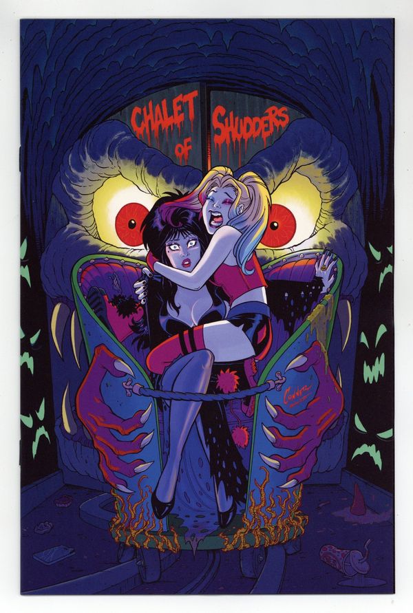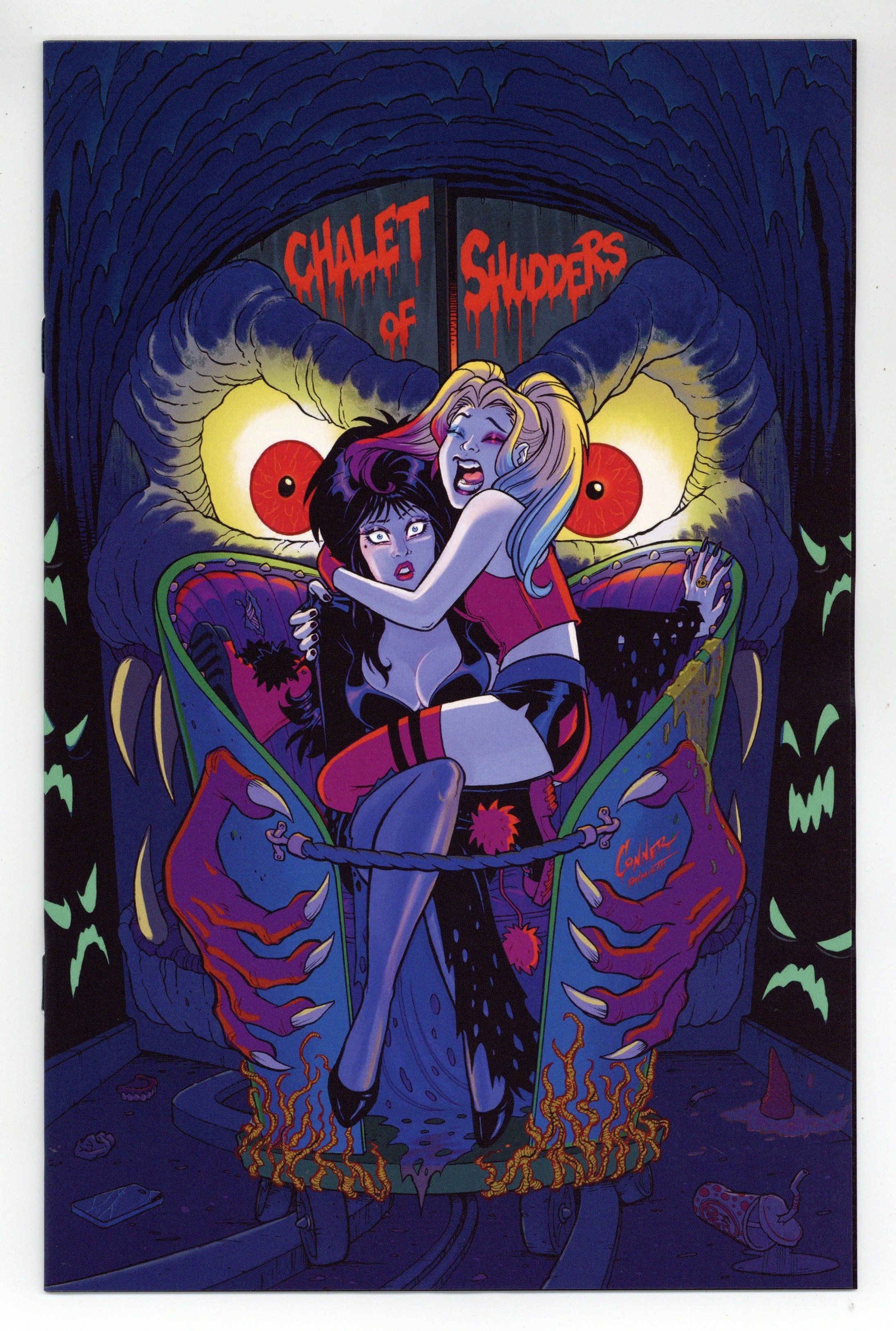 Tags: Harley QuinnPublished Oct 2025 by Dynamite Entertainment.$18.00Limited 1 for 50 Retailer Incentive Variant Cover. (W) Amanda Conner, Jimmy Palmiotti (A) Amanda Conner, Juan Samu (CA) Amanda Conner THE MISTRESS OF THE DARK MEETS DADDY'S LITTLE MONSTER! What happens when the Clown Princess of Crime gets bored? Shenanigans, hijinks, grievous bodily harm… the possibilities are endless! Now add in a certain macabre-minded TV host who seems to attract trouble like crypts attract vampires, and the stage is set for the greatest team-up since Frankenstein met his Bride! With her beloved show on the chopping block following a corporate takeover, Elvira needs to come up with a plan to get things back in the black - and her new friend Harley Quinn has an idea that's just crazy enough to work! Together, they're going to throw the greatest Halloween party Brooklyn has ever seen - whether the borough likes it or not! Written by AMANDA CONNER and JIMMY PALMIOTTI - the world-famous tag-team of all things Harley Quinn - this crossover event for the ages from Dynamite and DC Comics also showcases Amanda's fan-favorite artistic chops, with each issue featuring two (count 'em, two) Conner covers. And that's not all (certainly not!) - she's also joining interior artist (and Elvira favorite) JUAN SAMU to provide selected story pages for the series! But wait, there's more! This premier issue also includes darkly captivating covers from JOSEPH MICHAEL LINSNER, CHAD HARDIN, BEN CALDWELL, and best-selling Mark Spears Monsters creator MARK SPEARS! Cover price $4.99.