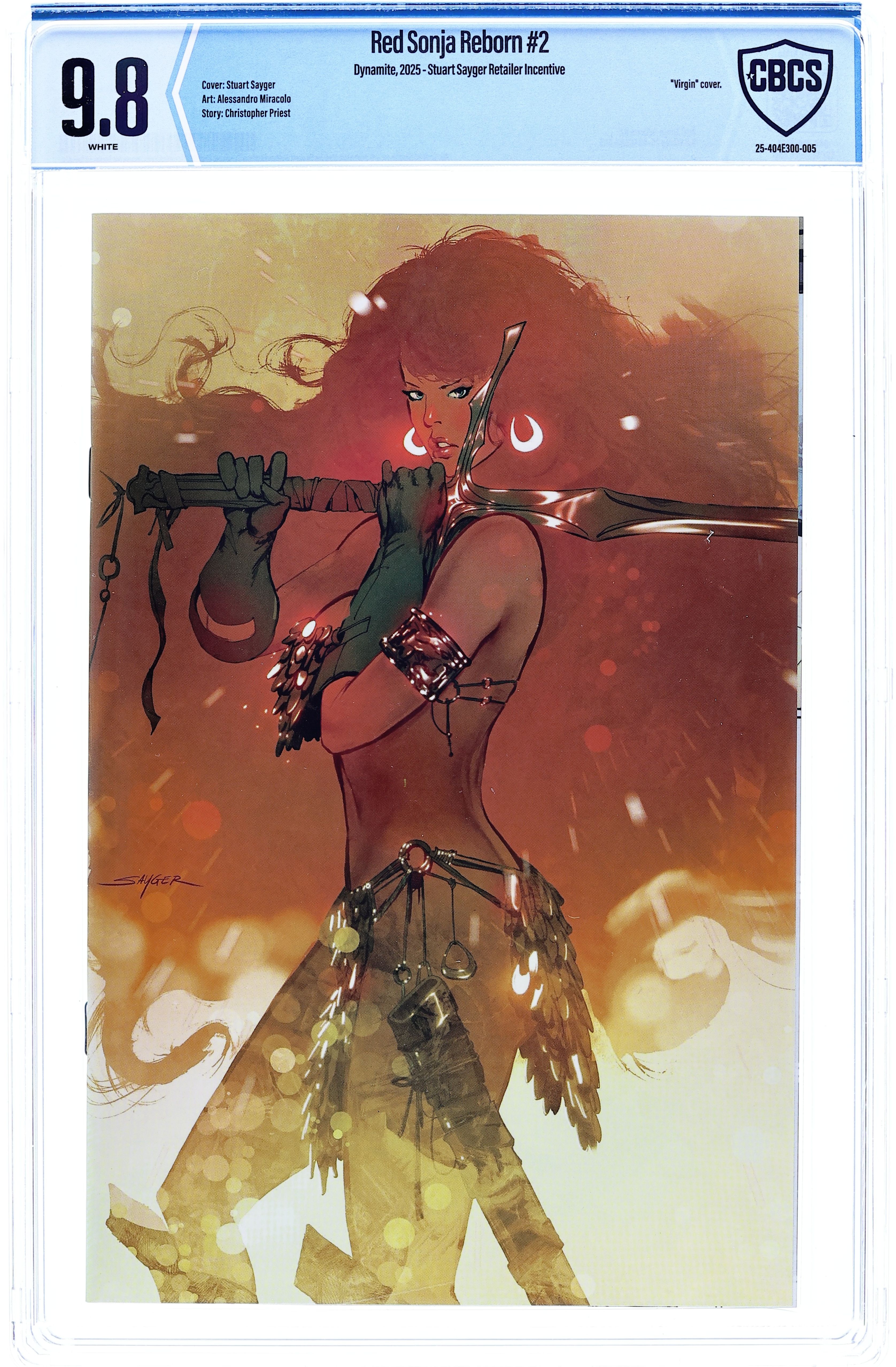 Limited 1 for 20 Retailer Incentive Variant Cover. (W) Christopher Priest (A) Alessandro Miracolo (CA) Stuart Sayger Convinced she is either dreaming, hallucinating, or possibly dead, the recently reconstituted Red Sonja (formerly Maggie Sutherland, late of the UK) decides that her best shot at escaping her apparent nightmare is to simply permit the worst to happen. This places her young squire and ersatz teacher-slash-tour-guide Faolán at great risk, as it falls to him to wake Sonja up to the fact this is really happening before she succeeds at getting both of them killed! Master storyteller CHRISTOPHER PRIEST and acclaimed artist ALESSANDRO MIRACOLO turn up the heat on their all-new She-Devil With a Sword in Sonja Reborn #2 stoked by combustible covers from STJEPAN SEJIC, STUART SAYGER, CHAD HARDIN, GREG LAND, and cosplay by ANI-MIA! 32 pages, full color, rated teen. Cover price $4.99.