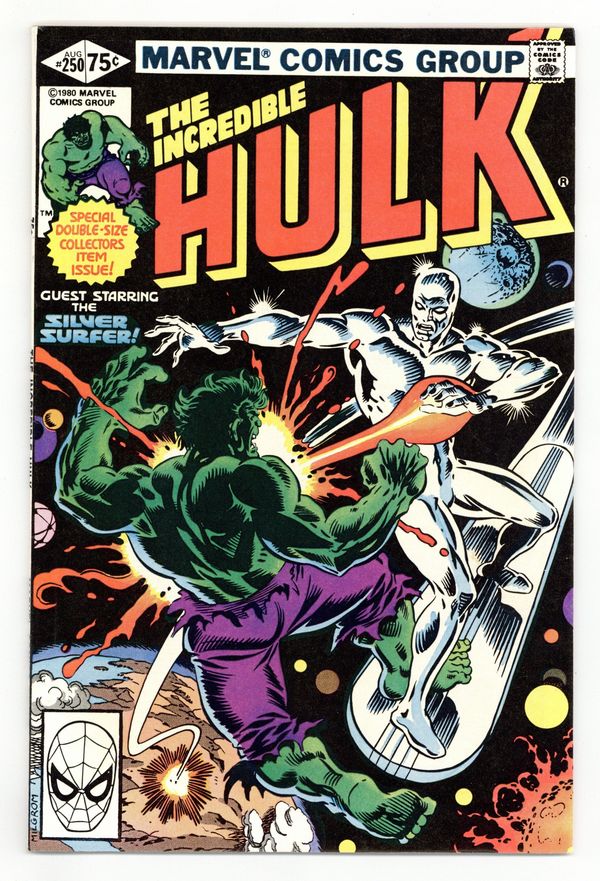 Direct Edition. Special giant-sized issue. Guest-starring Silver Surfer. A 250th celebration brought to you by Bill Mantlo and Sal Buscema. The Earth trembles when titans clash. It's the nigh unstoppable Incredible Hulk vs. the former Herald of Galactus, the Silver Surfer. Imprisoned on Earth by his former master, the Silver Surfer intends to add the immeasurable power of the Hulk to his own and break the barrier that keeps him from his home Zenn-La and his beloved. The only problem is, the Hulk has never been known for his generosity. 52 pages. Cover price $0.75.