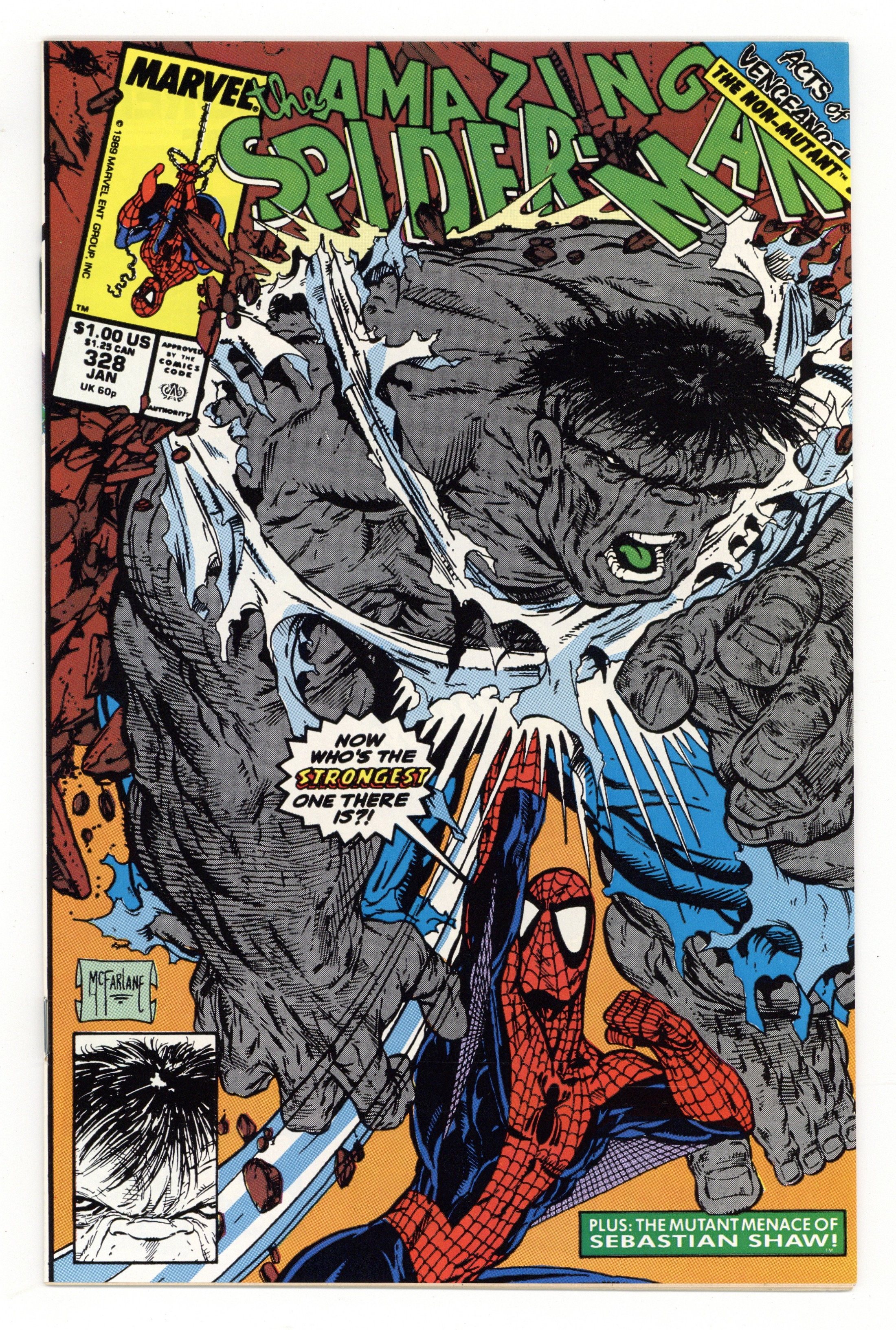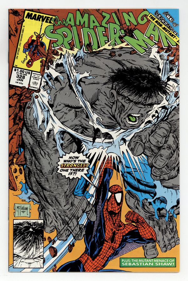 Direct Edition. "Shaw's Gambit" Acts of Vengeance crossover. Guest-starring the Hulk. Script by David Michelinie. Art by Todd McFarlane. Cover by Todd McFarlane. Plot continues from Web of Spider-Man 60. The powerful cabal masterminding the Acts of Vengeance is still trying to kill the web-slinger despite his new cosmic powers! And the next super-villain gunning for Spidey is Sebastian Shaw! However the Hellfire Club's Black King likes to fight by proxy! And who better to use than the Hulk! Shaw picks up the former Green Goliath in the Nevada desert and drops him in the middle of Manhattan! And the battle is joined! The cosmic-powered wall-crawler and the gamma-radiated Hulk throw down from Times Square to the Roosevelt Island ruins! An out-of-this-world ending! Plot continues in Spectacular Spider-Man 160. Cameo appearances by Mary Jane Watson and Flash Thompson. (Notes: This issue completes Todd McFarlane's dynamic 2-year run as the penciler of the Amazing Spider-Man series -- highlighted by the co-creation of Venom (aka Eddie Brock) and the initial Venom story arcs in issues 298-300 and 315-317. This story was reprinted in 1993 in the trade paperback: Spider-Man -- The Cosmic Adventures.) 32 pages. Cover price $1.00.