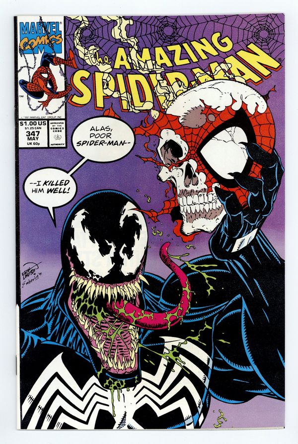 Tags: Marvel Legacy Numbering: Amazing Spider-Man (part 347), Spider-Man$28.00Direct Edition. "The Boneyard Hop!" Part 2 of 2. Script by David Michelinie. Pencils by Erik Larsen. Inks by Randy Emberlin. Cover by Erik Larsen and Randy Emberlin. On a deserted island, the Amazing Spider-Man wages a desperate battle for survival vs. the vicious Venom! The wall-crawler is fighting for his life! While Venom is fighting for his death! And this time there isn't any help or rescue on the way! As shown on the twisted cover, Venom plans to quote Hamlet once the battle is over! If the spectacular one doesn't want to play the part of Yorick; he better move fast! To thine own self be true, web-slinger! Cameo appearances by Mary Jane Watson, Willie Lumpkin, Aunt May, Flash Thompson, and the Black Cat. (Notes: Venom appears next in Darkhawk 13 & 14. This two-part story was reprinted in the trade paperbacks: Spider-Man: Venom Returns (1993) and Spider-Man: The Vengeance of Venom (2011).) 36 pages. Cover price $1.00. Cover price $1.00.