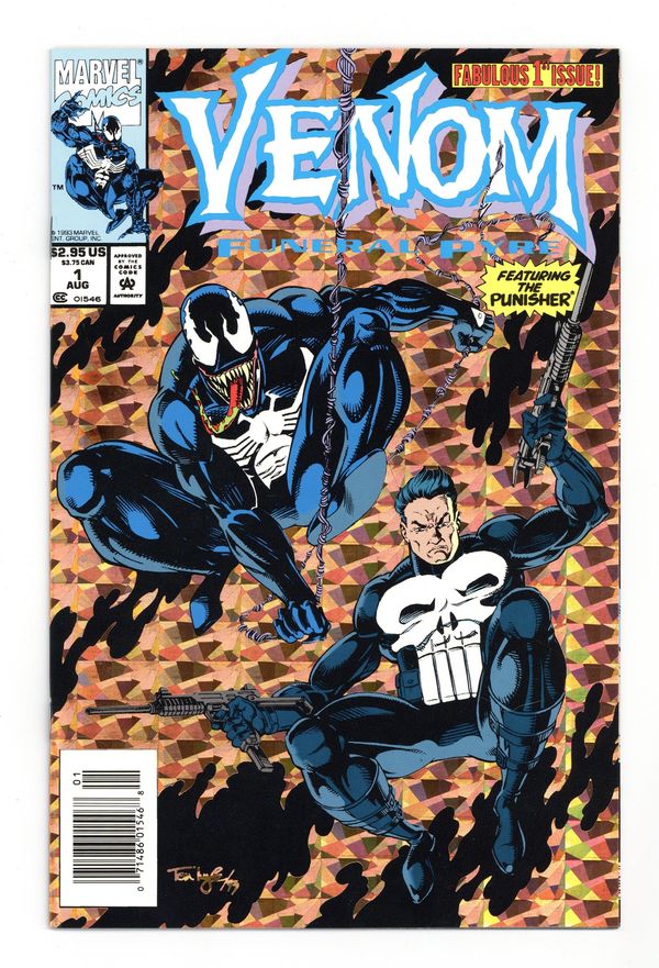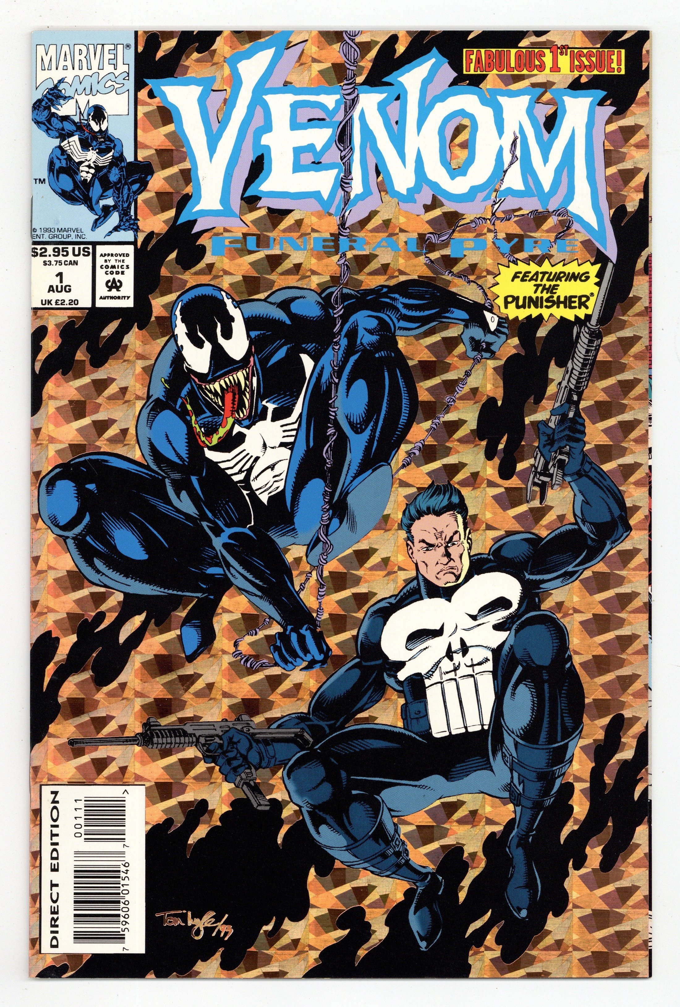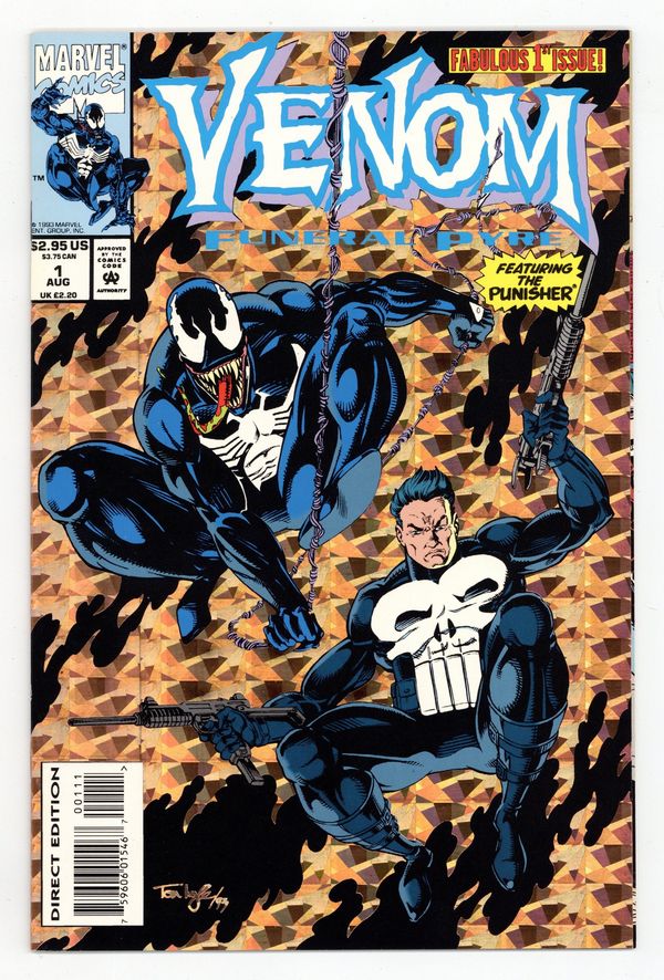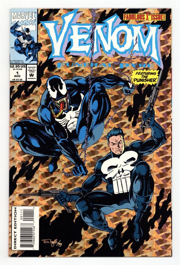 Direct Edition. Gold holographic cover. The Punisher guest stars in this 3-issue limited series, and the team up of two of Marvel's most popular characters is commemorated with a cover enhanced with flaming holografx foil that simulates the flickering effect of real fire. Then meet an all new villain! Written by Carl Potts. Art by Tom Lyle, Joe Rubinstein, Scott Hanna and Al Milgrom. Cover by Tom Lyle. Cover price $2.95.