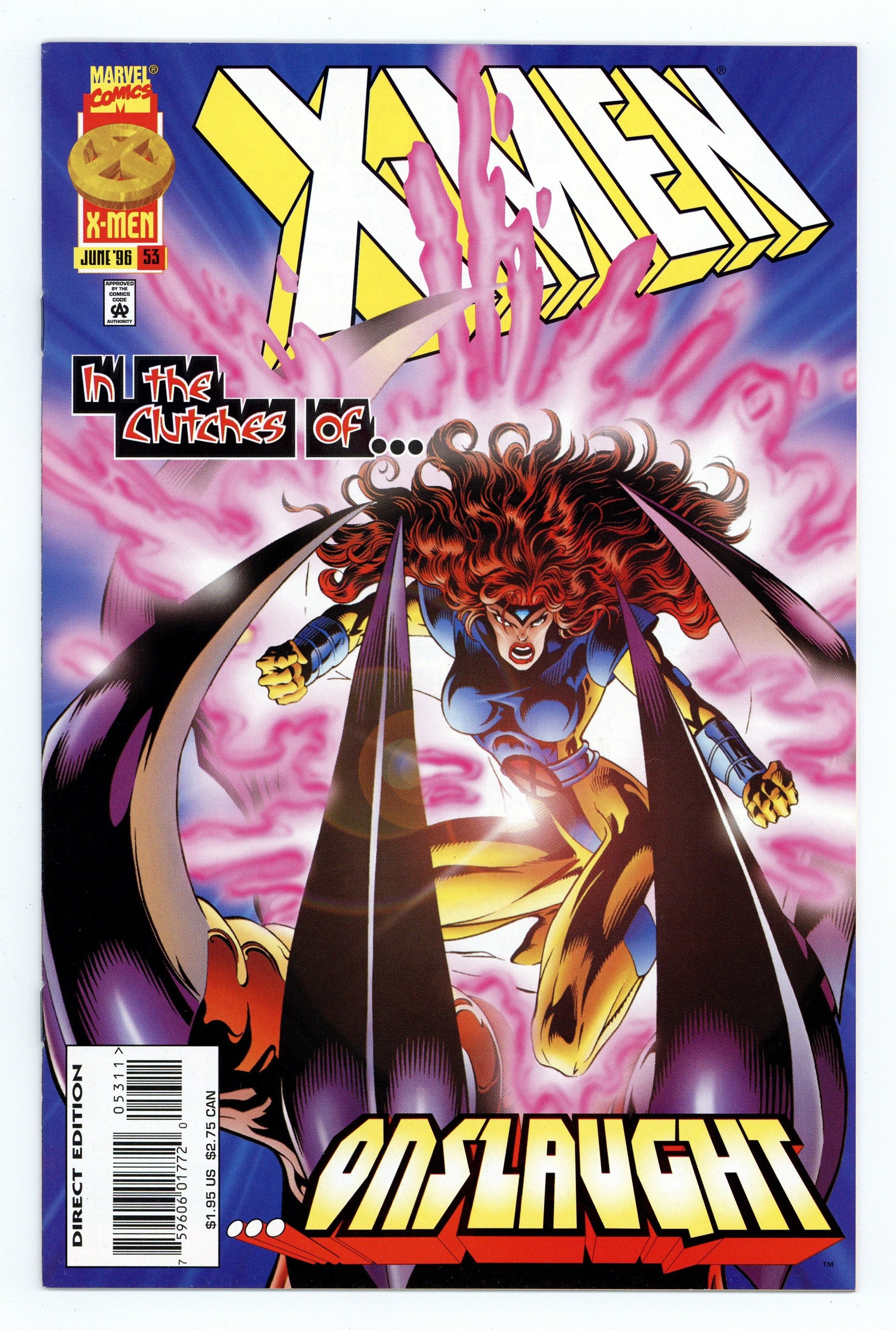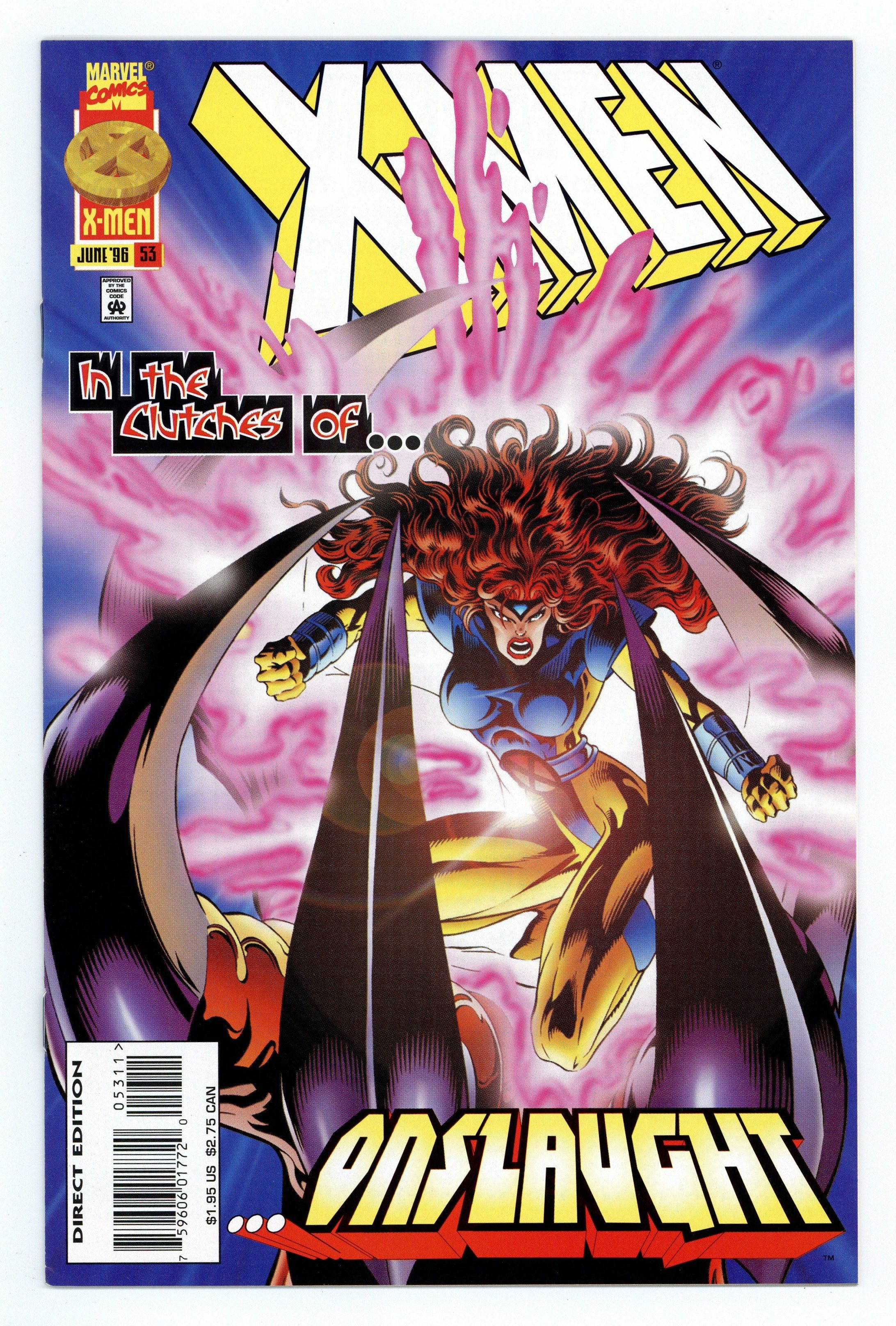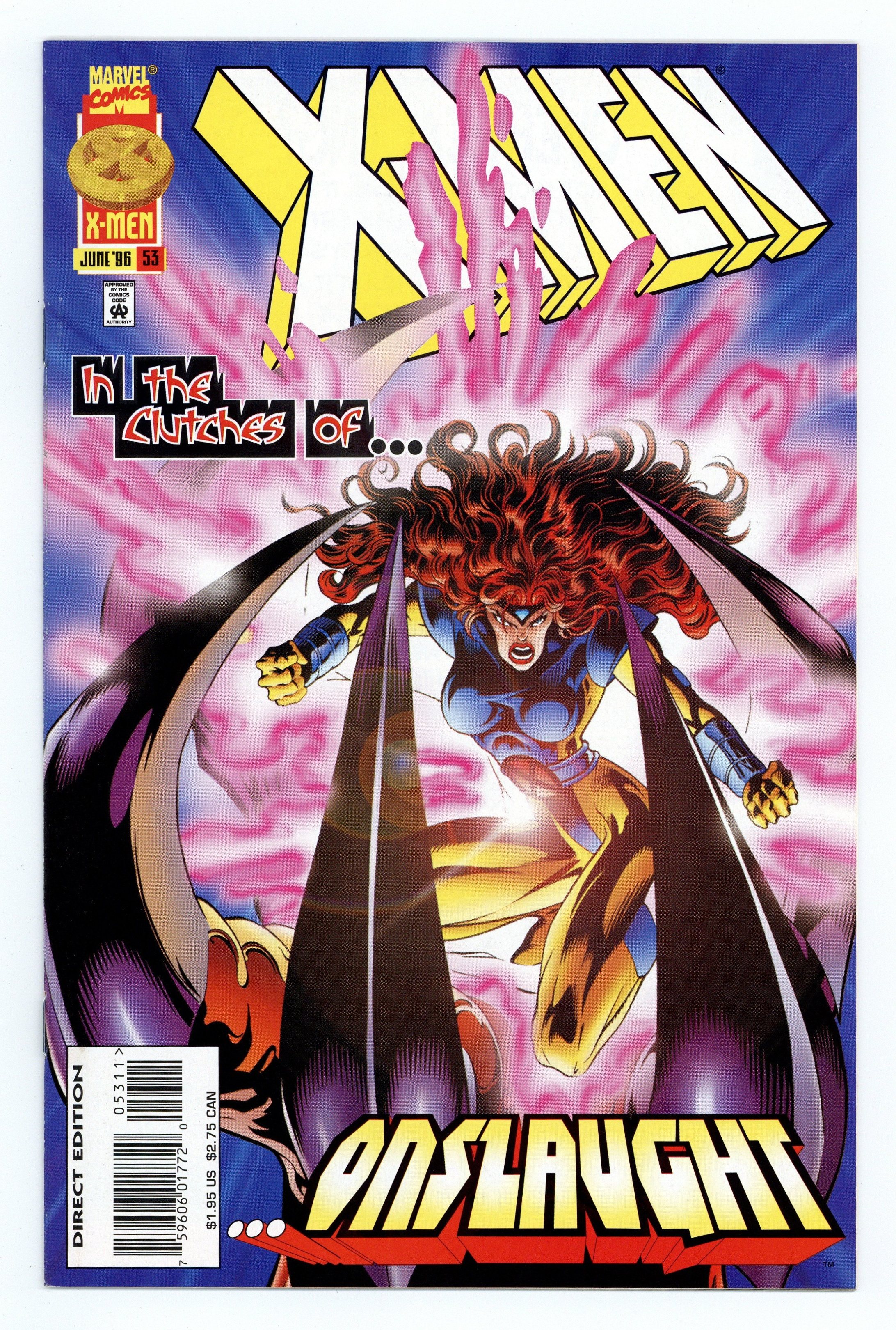 Direct Edition. Cover pencils by Andy Kubert, inks by Cam Smith. False Fronts, script by Mark Waid, pencils by Andy Kubert, inks by Cam Smith and John Dell (pg. 6); Onslaught pulls Jean into the astral plane and casts aspersions on Xavier's character and his dream; Jean refuses to join him (of course) which makes the mysterious villain in Magneto like costume very mad indeed; Cont. in Uncanny X-Men #334. Cover price $1.95.
