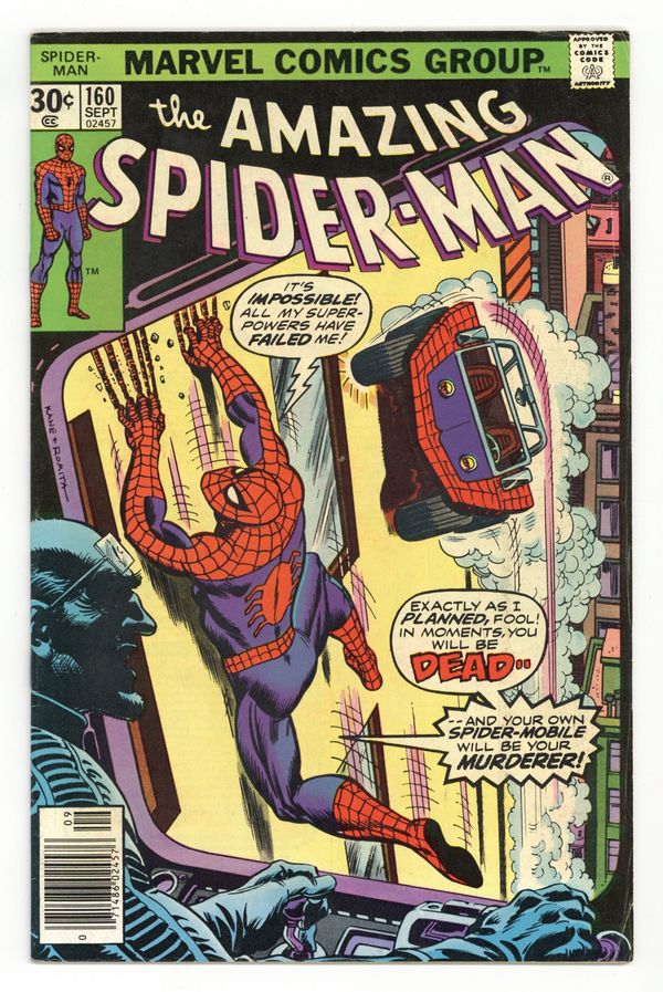 Tags: Marvel Legacy Numbering: Amazing Spider-Man (part 160), Spider-Man$15.00"My Killer, The Car!" Script by Len Wein. Art by Ross Andru (breakdowns), Mike Esposito (finishes), and Dave Hunt (backgrounds). Cover by Gil Kane and John Romita. After a lengthy pit stop, the Spider-Mobile is back on the road! And zooming down the streets trying to run over Spider-Man! Whoa, why is Spidey's cool car doing that? Because the Terrible Tinkerer is behind the wheel! Can the web-slinger slam on the brakes and send his Spider-Mobile to the salvage yard? It's a hit and run! Cameo appearances by Toy, Aunt May, Mary Jane Watson, Harry Osborn, Liz Allan, Joe Robertson, and J. Jonah Jameson. First 30¢ issue. (Notes: The Terrible Tinkerer previously appeared way back in Amazing Spider-Man 2. The letters page includes a letter from comics publisher Dean Mullaney.) 36 pages. Cover price $0.30.