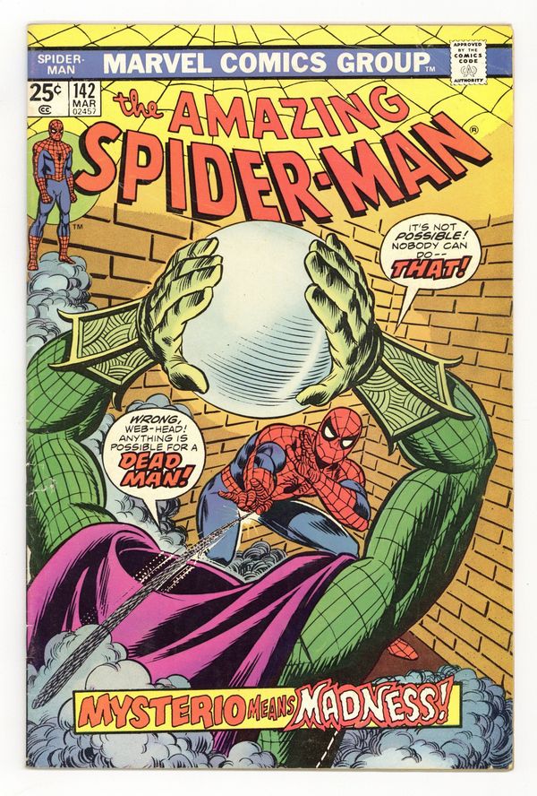 Tags: Marvel Legacy Numbering: Amazing Spider-Man (part 142), Spider-Man Clone Saga (part 00B)$19.50"Dead Man's Bluff" Part 2 of 2. Script by Gerry Conway. Art by Ross Andru (breakdowns), Frank Giacoia (finishes), and Dave Hunt (backgrounds). Cover by John Romita. An angry wall-crawler scours Manhattan looking for Mysterio! The web-slinger's long-time foe has made the grave mistake of using the late Gwen Stacy as one of his illusions! And that's stepping way over the line! But what if Peter's sighting of Gwen was genuine? Hold on, that's impossible! Gwen died several months ago! Or did she? Your friendly neighborhood Spider-Man will dive into that mystery soon enough! But in the meantime, he's giving a piece of his mind to Mysterio! First (cameo) appearance of the Gwen Stacy clone. Cameo appearances by Mary Jane Watson, Aunt May, Glory Grant, Betty Brant, Ned Leeds, Joe Robertson, and J. Jonah Jameson. (Note: This story was reprinted in Marvel Tales 119.) 36 pages. 25c cover price. Cover price $0.25.