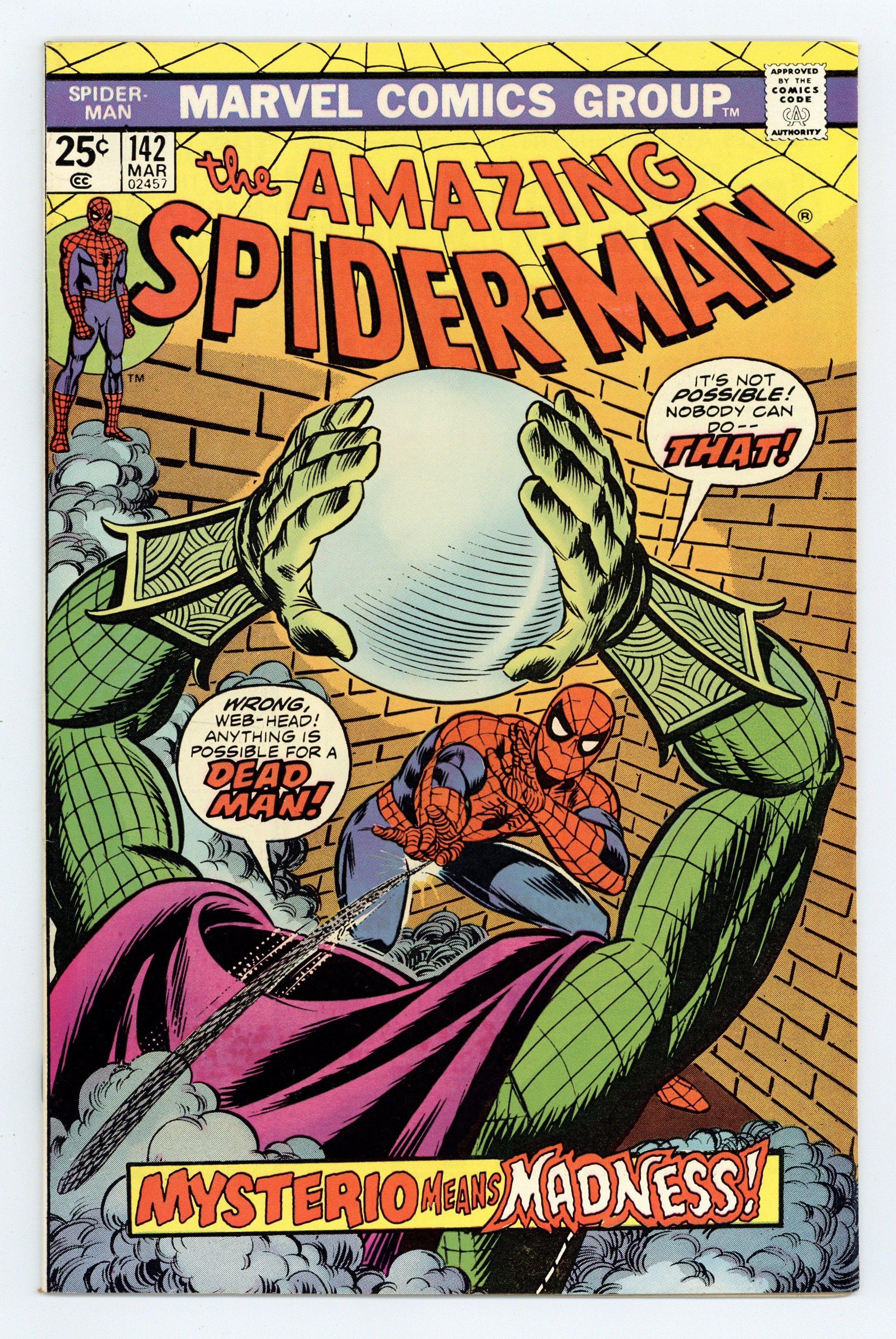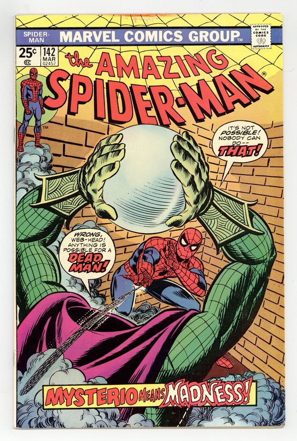 "Dead Man's Bluff" Part 2 of 2. Script by Gerry Conway. Art by Ross Andru (breakdowns), Frank Giacoia (finishes), and Dave Hunt (backgrounds). Cover by John Romita. An angry wall-crawler scours Manhattan looking for Mysterio! The web-slinger's long-time foe has made the grave mistake of using the late Gwen Stacy as one of his illusions! And that's stepping way over the line! But what if Peter's sighting of Gwen was genuine? Hold on, that's impossible! Gwen died several months ago! Or did she? Your friendly neighborhood Spider-Man will dive into that mystery soon enough! But in the meantime, he's giving a piece of his mind to Mysterio! First (cameo) appearance of the Gwen Stacy clone. Cameo appearances by Mary Jane Watson, Aunt May, Glory Grant, Betty Brant, Ned Leeds, Joe Robertson, and J. Jonah Jameson. (Note: This story was reprinted in Marvel Tales 119.) 36 pages. 25c cover price. Cover price $0.25.