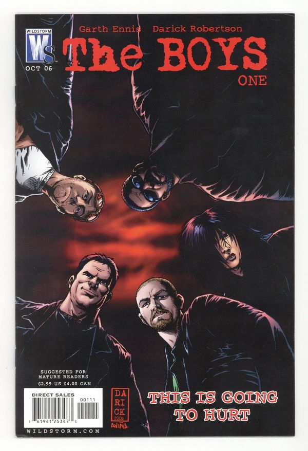 Published Oct 2006 by DC/Dynamite.$70.00Written by Garth Ennis. Art and covers by Darick Robertson. 'This book will out-PREACHER PREACHER.' - Garth Ennis (Preacher) and Darick Robertson (Transmetropolitan), co-creators of two of the most thought-provoking comics of the last decade, introduce their first original collaboration for a new monthly series: THE BOYS - a dark, twisted look at super powers, super-people, and the men and women who make sure the world's 'heroes' never go too far. With a quarter-million super-powered beings in the world, someone's got to watch what's going on beneath all those masks and capes. In a U.S.A. uncomfortably like our own, that task falls to The Boys, a government-funded group of operatives dedicated to keeping the 'supes' in line. Team leader Billy Butcher, described by a confidential C.I.A. report as 'the most lethal individual ever encountered by this agency,' is on the hunt for new recruits - but it takes something special to join this outfit. You have to be smart. You have to be strong. And you have to hate supes with every ounce of black passion in your heart. Cover price $2.99.