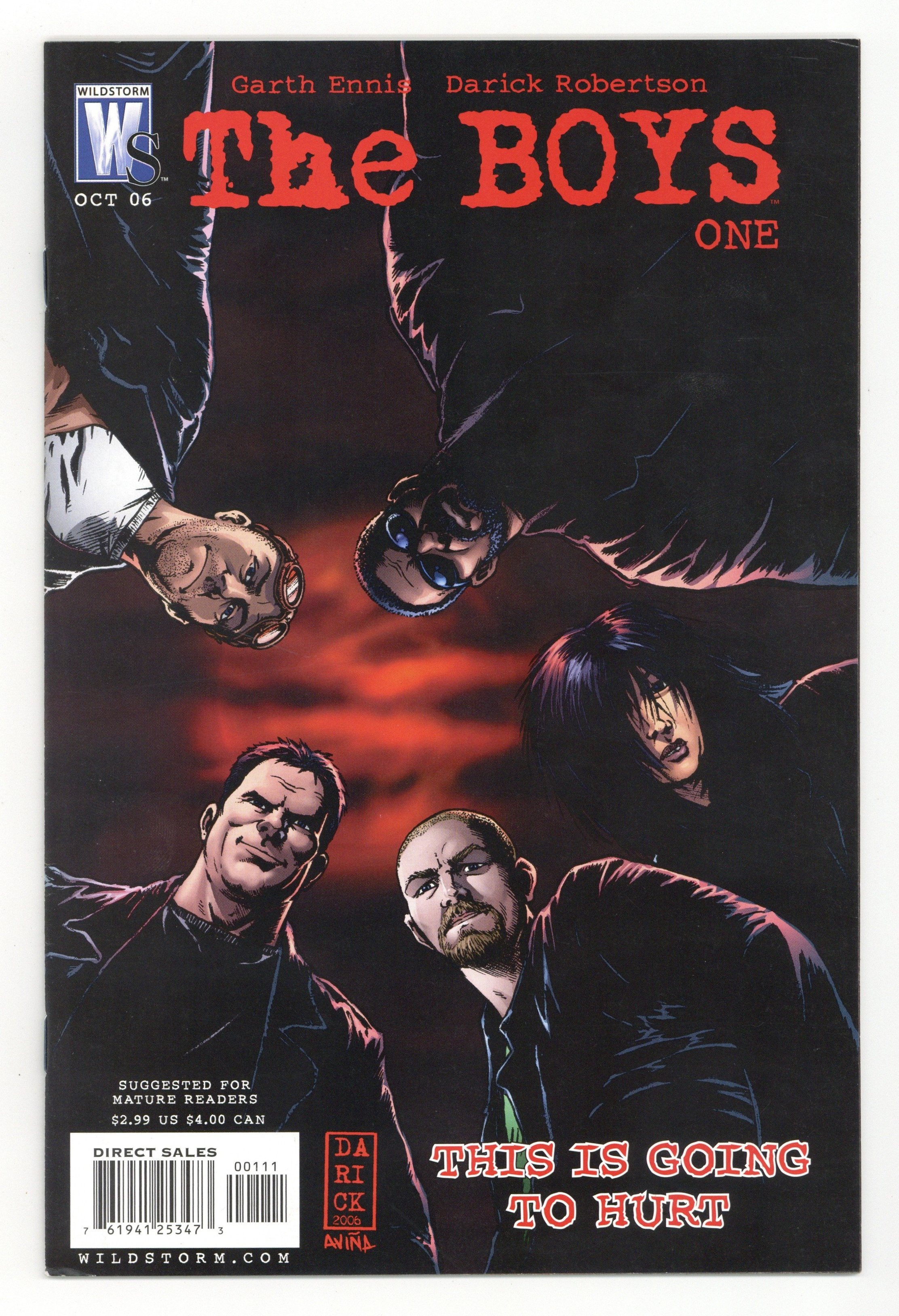 Written by Garth Ennis. Art and covers by Darick Robertson. 'This book will out-PREACHER PREACHER.' - Garth Ennis (Preacher) and Darick Robertson (Transmetropolitan), co-creators of two of the most thought-provoking comics of the last decade, introduce their first original collaboration for a new monthly series: THE BOYS - a dark, twisted look at super powers, super-people, and the men and women who make sure the world's 'heroes' never go too far. With a quarter-million super-powered beings in the world, someone's got to watch what's going on beneath all those masks and capes. In a U.S.A. uncomfortably like our own, that task falls to The Boys, a government-funded group of operatives dedicated to keeping the 'supes' in line. Team leader Billy Butcher, described by a confidential C.I.A. report as 'the most lethal individual ever encountered by this agency,' is on the hunt for new recruits - but it takes something special to join this outfit. You have to be smart. You have to be strong. And you have to hate supes with every ounce of black passion in your heart. Cover price $2.99.