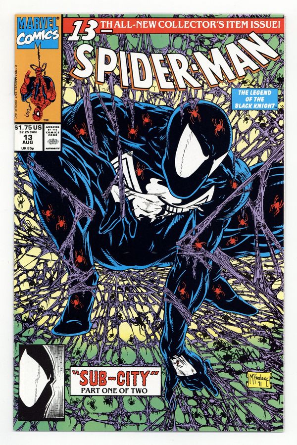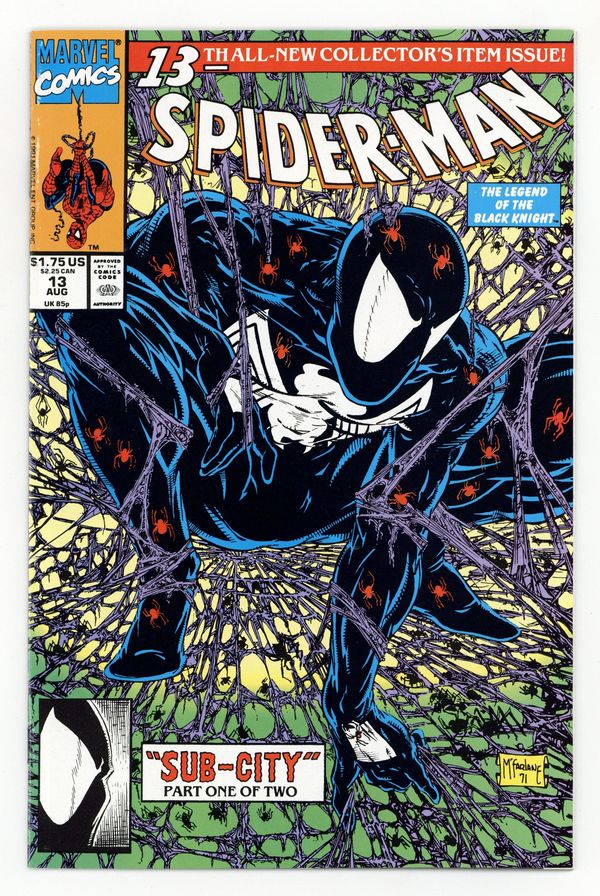 $20.00Direct Edition. Sub-City Part 1 of 2. Script and art by Todd McFarlane. Cover by Todd McFarlane. In Midtown Manhattan homeless people are disappearing off the streets. And a Daily Bugle reporter suspects foul play! The wall-crawler decides to stake out the area...and wait for something or someone suspicious to show up. And sure enough...a strange creature does -- right out of the sewer system! Spider-Man wants to follow into the sewers to investigate further, but he needs to wear his old black costume for camouflage. However that's a major nonstarter for Mary Jane...since she hates Spidey's black costume! What is a married web-slinger to do? Cameo appearances by J. Jonah Jameson and Morbius. (Note: The cover is an homage to Spider-Man (1990) issue #1.) 32 pages. Cover price $1.75.
