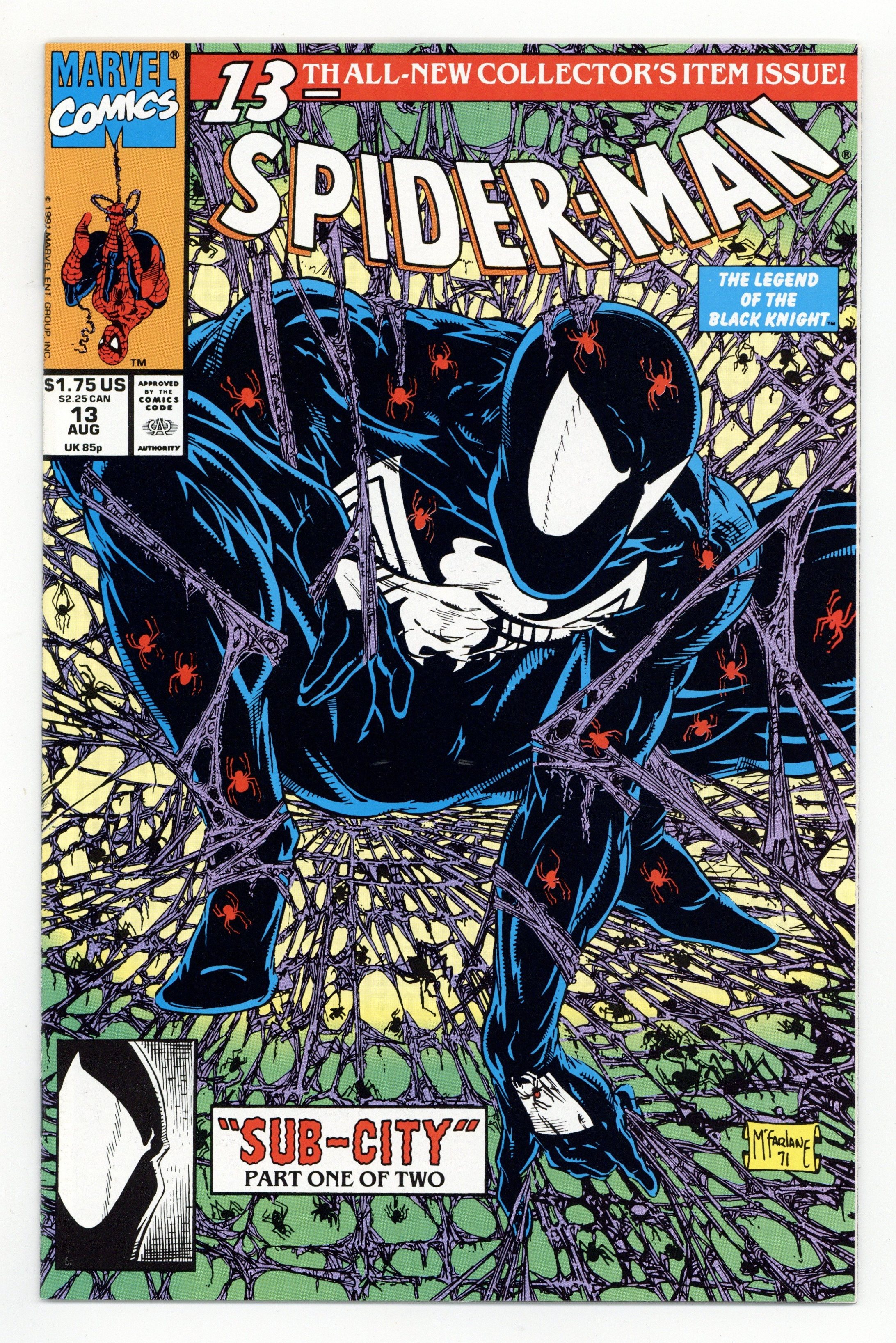 Direct Edition. Sub-City Part 1 of 2. Script and art by Todd McFarlane. Cover by Todd McFarlane. In Midtown Manhattan homeless people are disappearing off the streets. And a Daily Bugle reporter suspects foul play! The wall-crawler decides to stake out the area...and wait for something or someone suspicious to show up. And sure enough...a strange creature does -- right out of the sewer system! Spider-Man wants to follow into the sewers to investigate further, but he needs to wear his old black costume for camouflage. However that's a major nonstarter for Mary Jane...since she hates Spidey's black costume! What is a married web-slinger to do? Cameo appearances by J. Jonah Jameson and Morbius. (Note: The cover is an homage to Spider-Man (1990) issue #1.) 32 pages. Cover price $1.75.