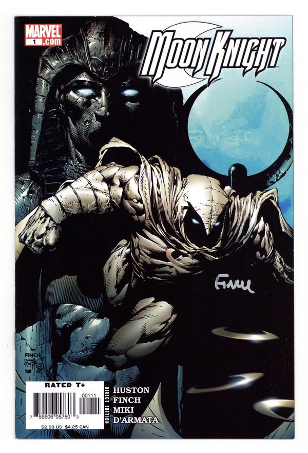Written by CHARLIE HUSTON. Pencils & Cover by DAVID FINCH. "THE BOTTOM." Part 1 (of 6). The Fist of Khonshu is back and badder than ever, courtesy of acclaimed novelist Charlie Huston (Caught Stealing, Six Bad Things) and red-hot, fan-favorite artist David Finch (NEW AVENGERS). Marc Specter used to talk to God. His god anyway. Khonshu -- God of the Moon, God of Vengeance -- saved Spector's life, brought him to glory, made him a hero. Made him Moon Knight. But what Khonshu gives, he also takes away. And once he takes, he takes for good. Spector learned this the hard way, spiraling into madness, depression and worse. But he also remembers. Remembers what it felt like to jump off the top of a six-story tenement, cloak spread behind him. Remembers the feel of cartilage and bone exploding beneath his fists. Remembers the fun stuff. Now Specter wants back in the game. Will Khonshu hear his prayer? 32 PGS./Rated T+ SUGGESTED FOR TEENS AND UP Cover price $2.99.