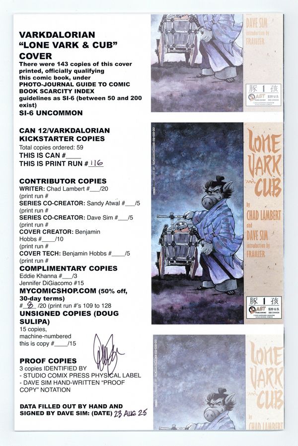 Published Aug 2025 by Aardvark-Vanaheim.$24.00Offered previously on Kickstarter, all copies signed and numbered by Dave Sim! Limited to ONLY 143 copies! Written by Chad Lambert. Art by Dave Sim. Cerebus in Hell? issue 84 raids the load pans of two mostly famous sci-fi franchises and one long forgotten, but still hazily remembered 1970s television program (everybody remembers the lovely ladies). SWKRPST, indeed. Sim and Birdsong admit they never read the comics or saw the show, but the young folks assure us that Lucasfilms TOTALLY ripped off Kazuo Koike and Goseki Kojima! We're taking it back! 24 Pgs, B&W. Cover price $20.00.