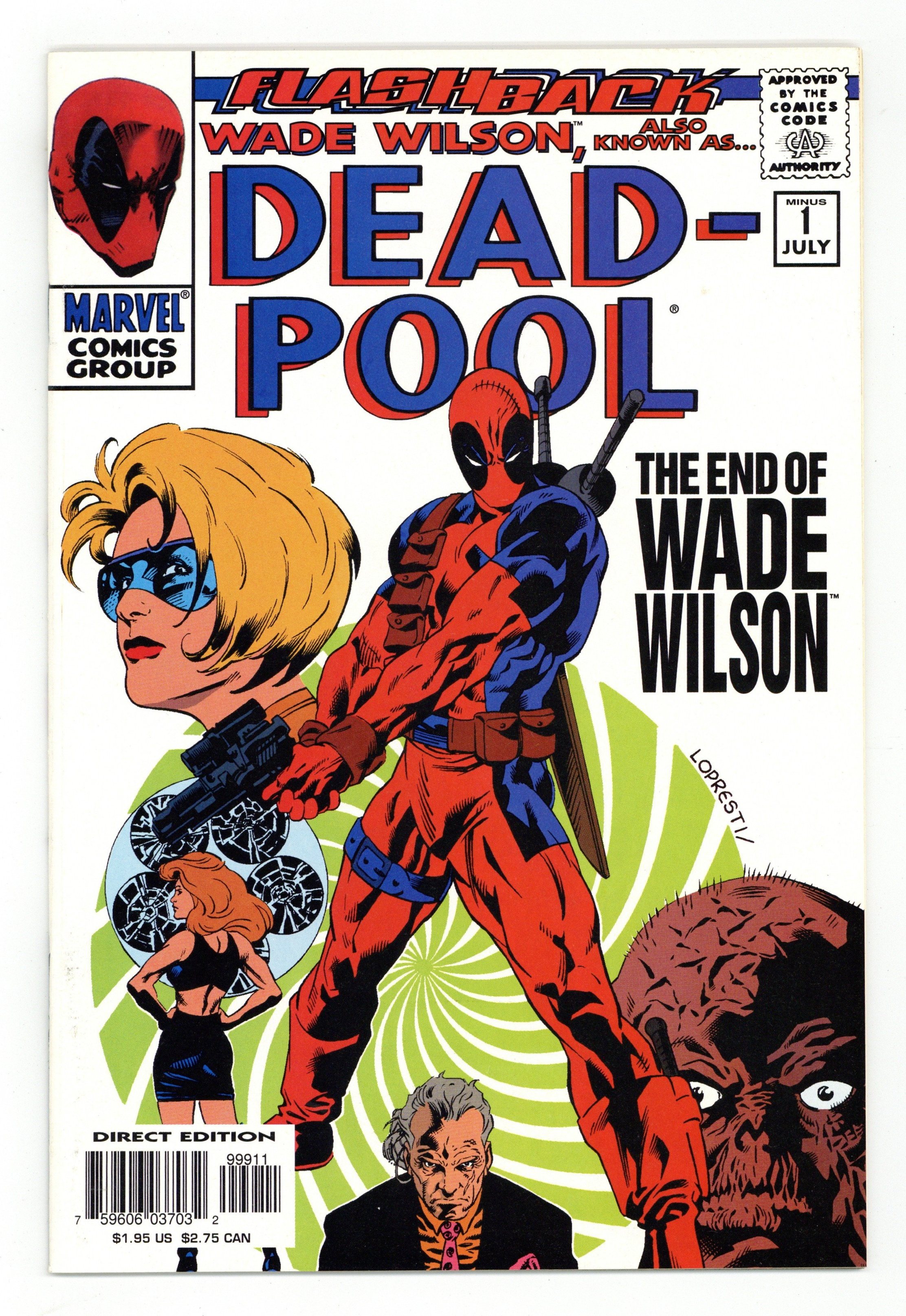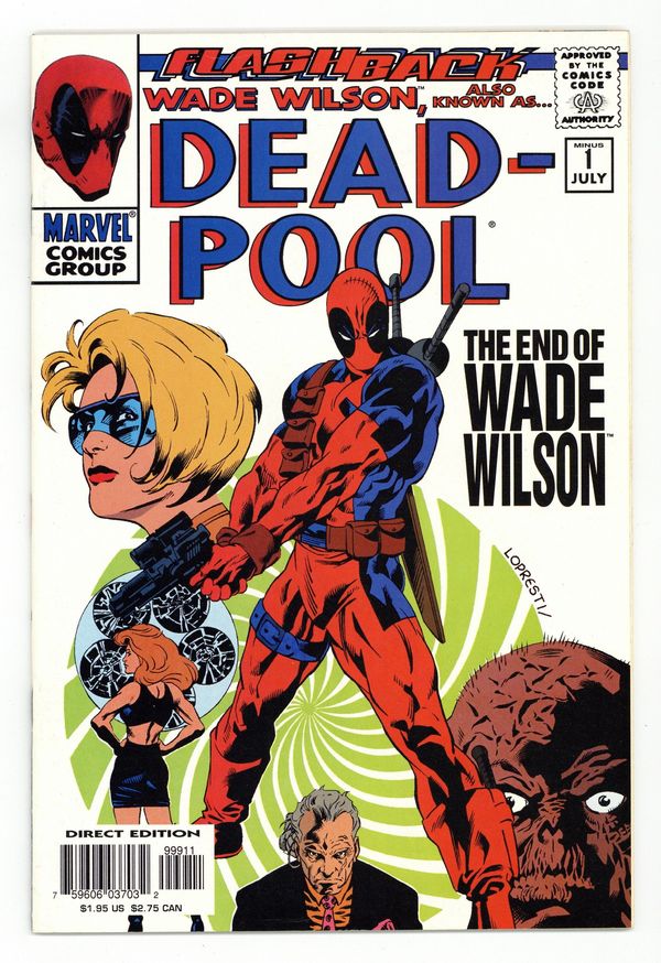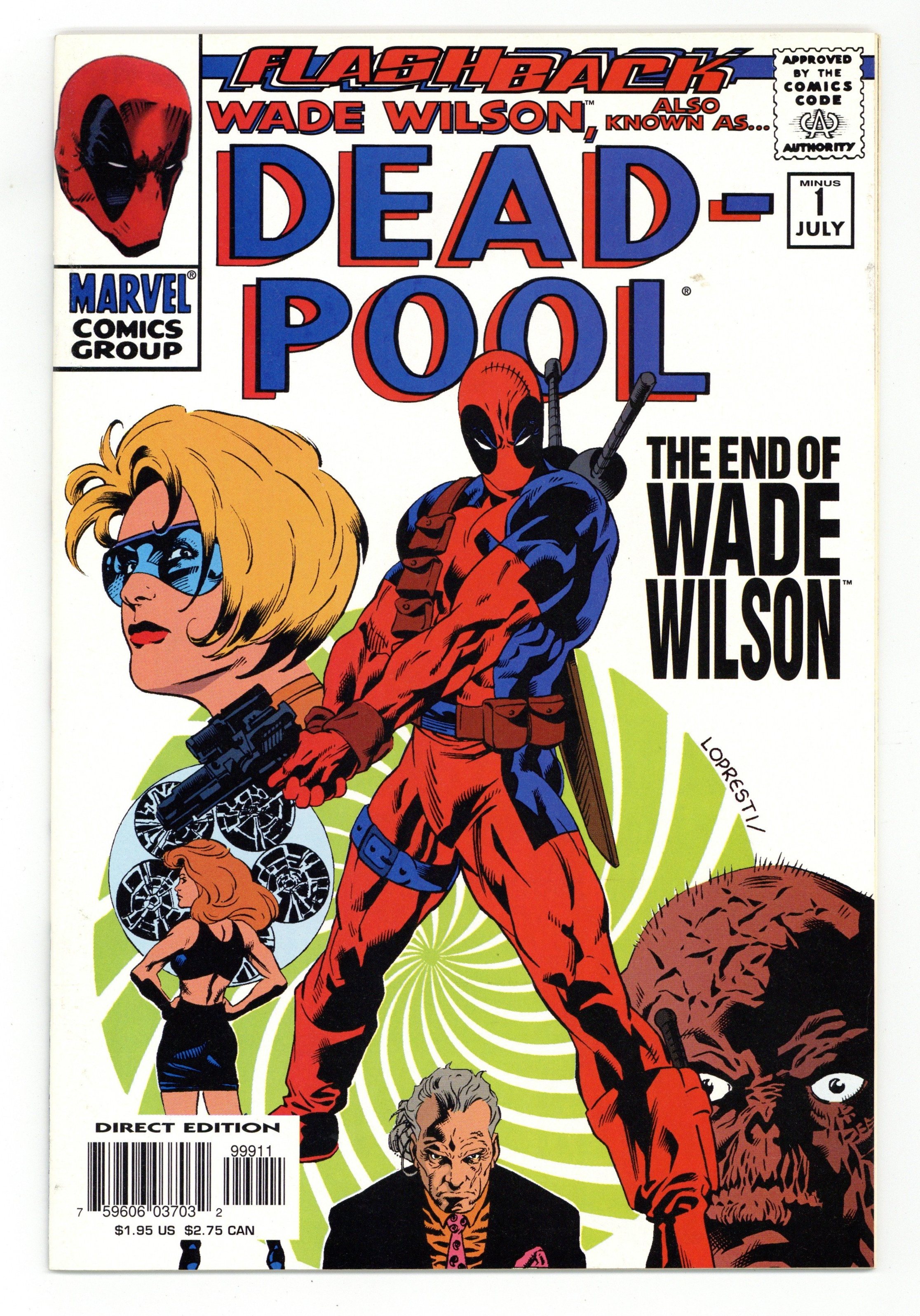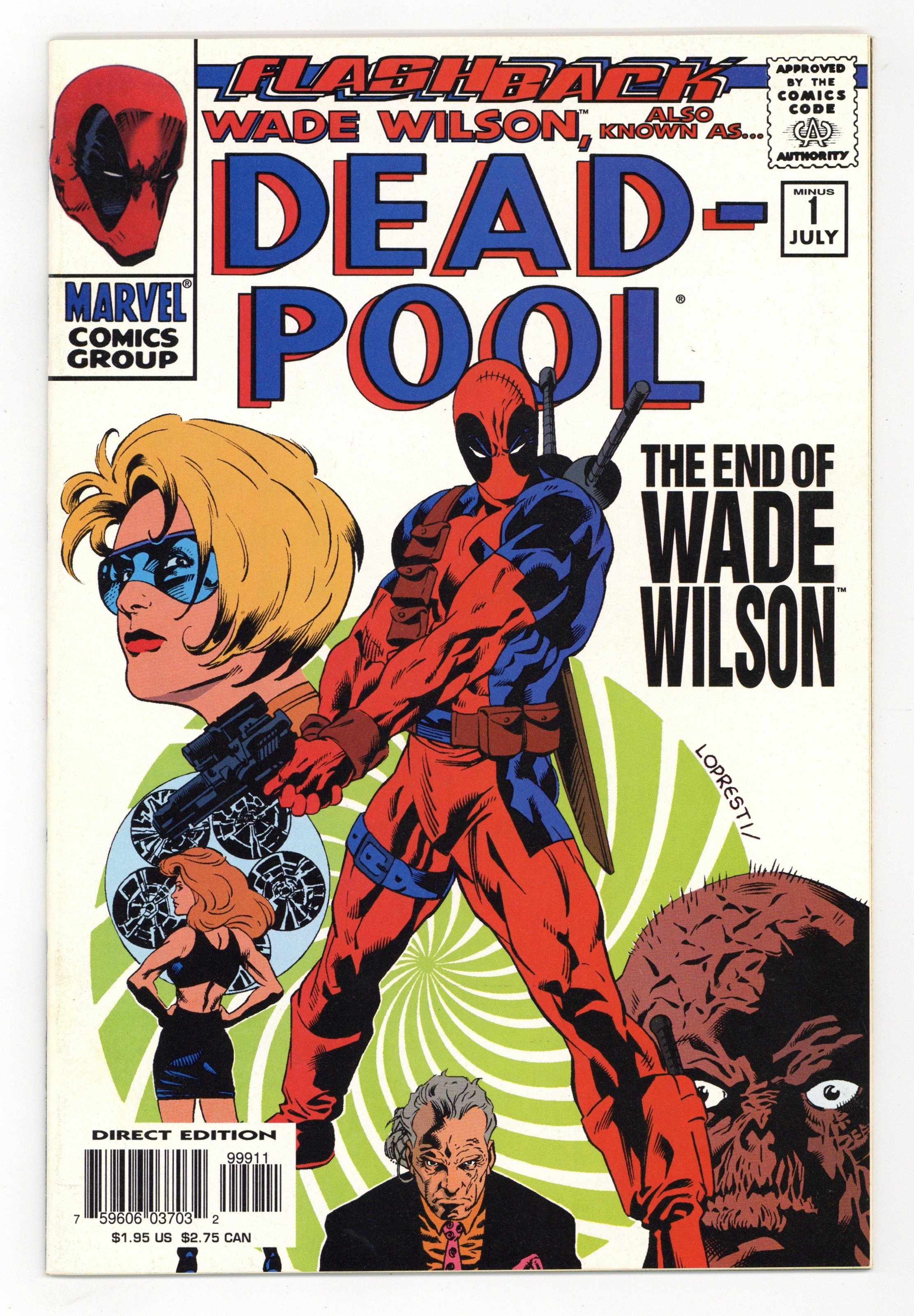 Paradigm Lost - Written by Joe Kelly. Art by Aaron Lopresti & Rachel Dodson. Cover pencils by Aaron Lopresti. Flashback! Before he became Deadpool, psycho killer, he was just Wade Wilson, psycho! Want to know when Landau, Luckman & Lake first started observing Wade? Be there for the pivotal moments that led to the creation of the fruitcake we like to call Deadpool! 40 pages, full color. Cover price $1.95.