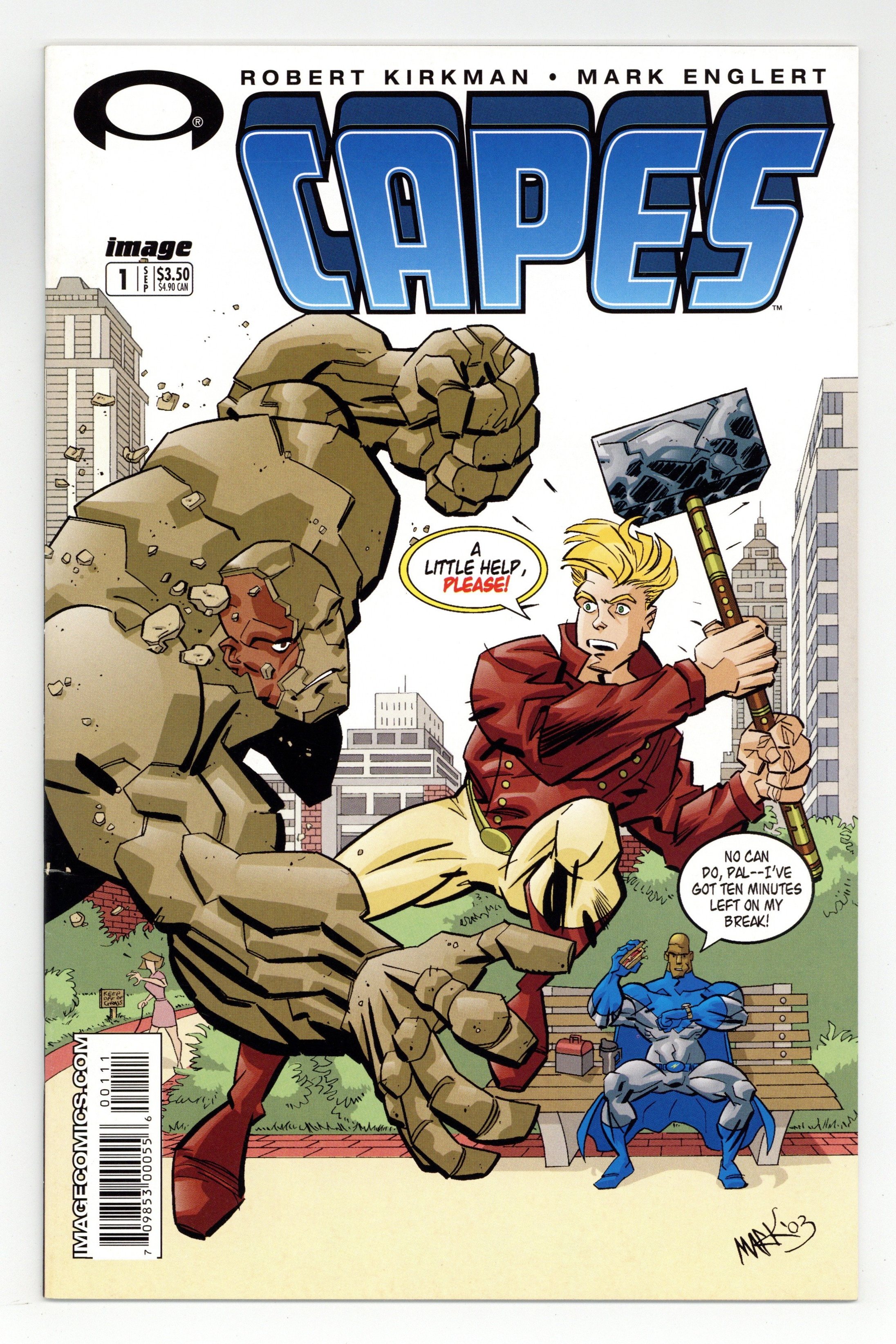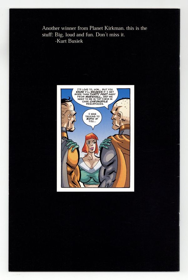 Written by Robert Kirkman, art and cover by Mark Englert. #1 in a three issue mini-series. Join Bruce Bolt, the Meteor Twins, Big Brain, the American Champion, his cheating wife Freedom, and the rookie Kid Thor, as they try to make a business out of being super. This issue features a preview of Kirkman's hit "The Walking Dead" series, making this the series' first appearance. Cover price $3.50.