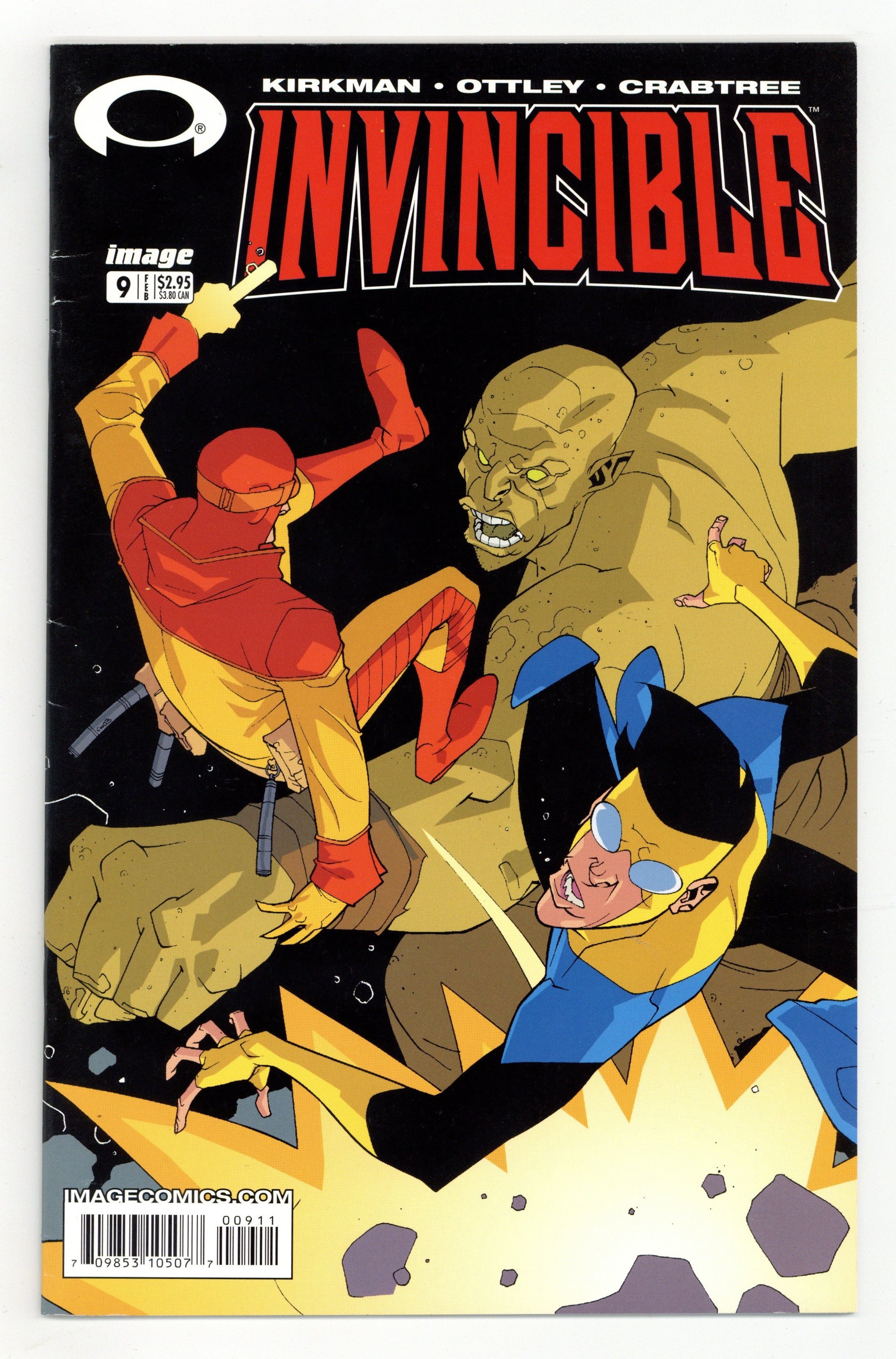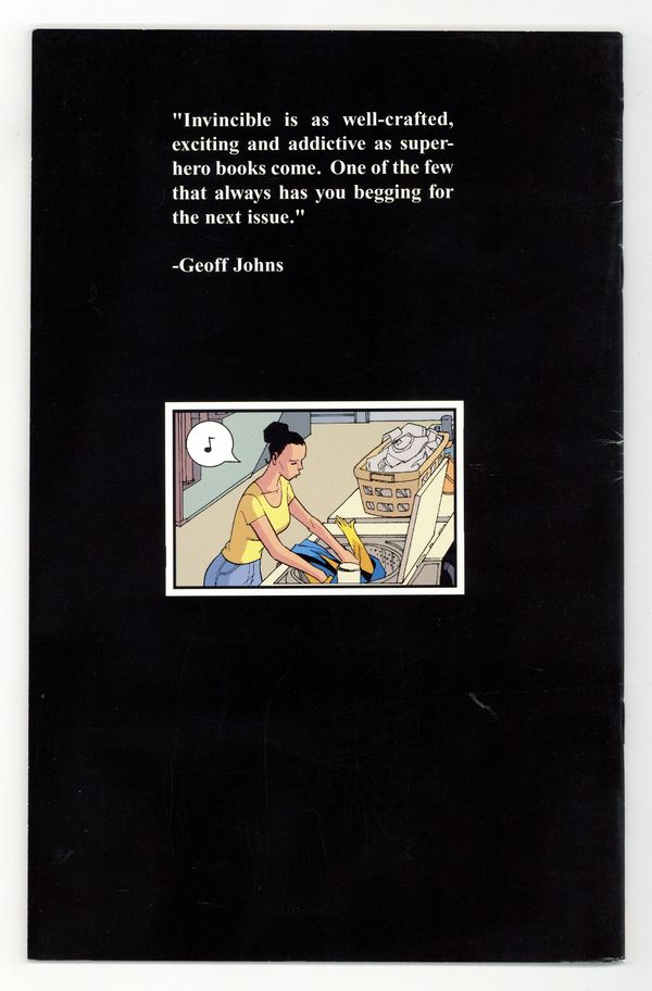 $190.00(W) Robert Kirkman (A) Ryan Ottley FC 32pp $2.95 Monthly ongoing series In stores the week of November 26th. THE CONCEPT: Mark Grayson is just like most everyone else his age. He's a senior at a normal American high School. He has a crappy part time job after school and on weekends. He likes girls quite a bit. but doesn't quite understand them. He enjoys hanging out with his friends, and sleeping late on Saturdays. at least until the good cartoons come on. The only difference between Mark and everyone else is that his father is the most powerful superhero on the planet, and as of late, he seems to be inheriting his father's powers. Which sounds okay at first, but how do you follow in your father's footsteps when you know you will never live up to his standards? THIS ISSUE: PERFECT STRANGERS PART ONE-Beginning of a brand new story arc, a perfect jumping-on point for new readers! Male bonding time! Mark teams up with former Teen Team member Rex Plode to thwart some evil, but how can the two effectively fight the bad guy when they really want to fight each other? Meanwhile events start to unfold that will lead up to the big issue 12 spectacular! If you've ever thought about picking up Invincible now is the time. Cover price $2.95.