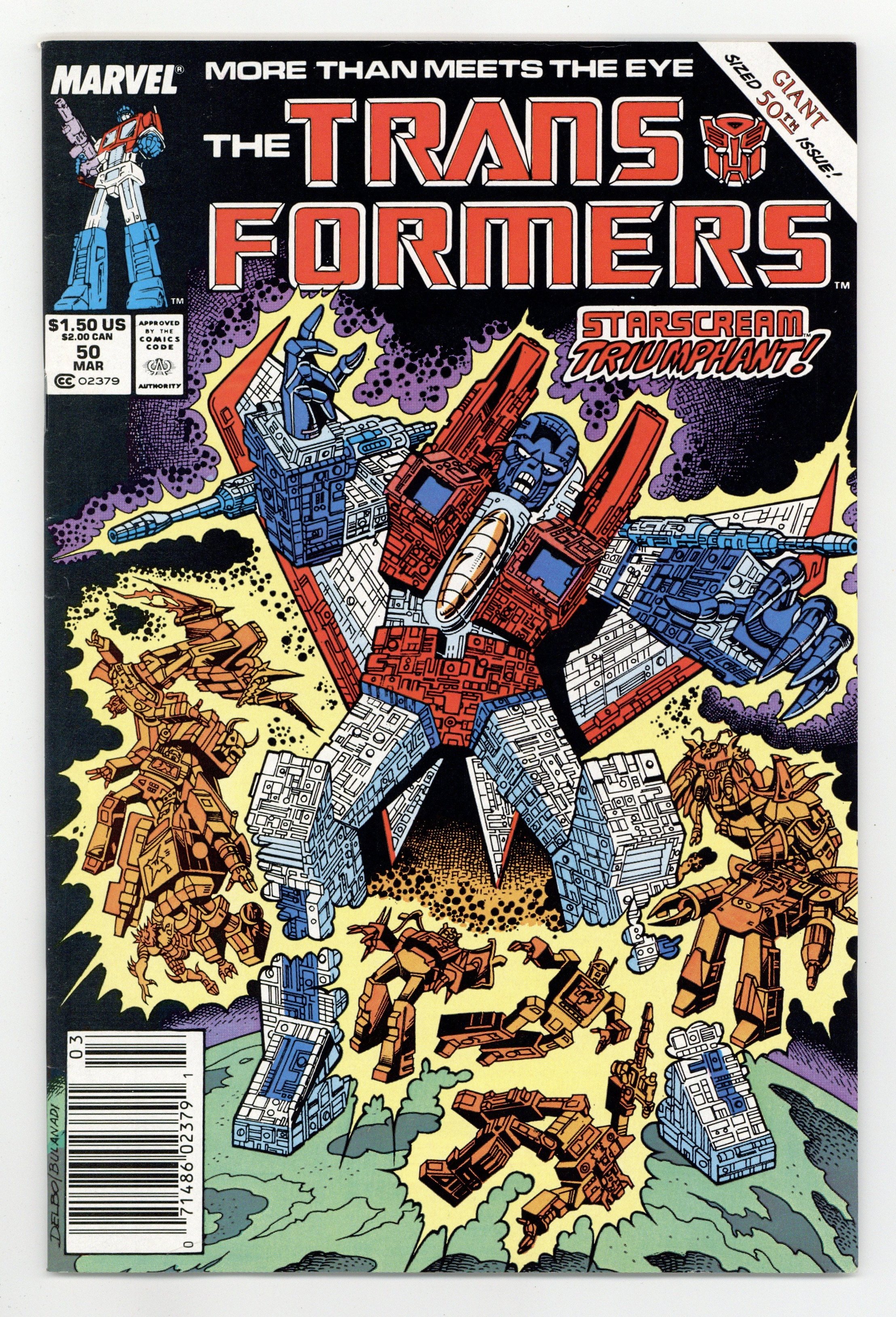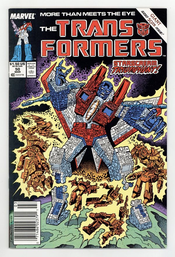 Newsstand Edition. Double size issue featuring the conclusion of the Underbase Saga in which the Decepticon Starscream unleashes a plan to keep both the Decepticons and Autobots occupied while he obtains the Underbase, which contains more knowledge and power than any known object in the universe, and is heading toward Earth in "Dark Star." Script by Bob Budiansky and art by Jose Delbo & Dave Hunt. Cover by Jose Delbo and Danny Bulanadi. Cover price $1.50.