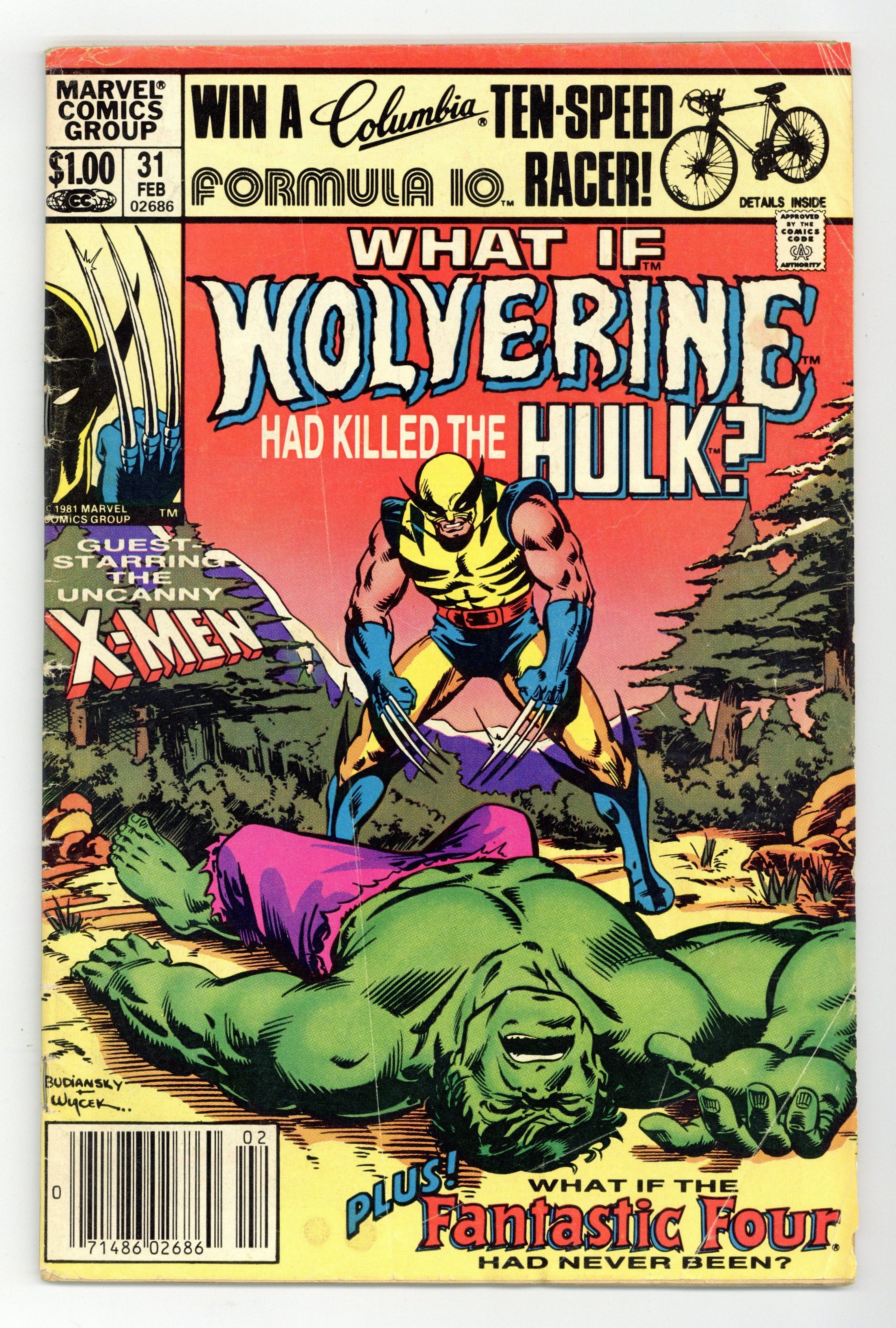 Newsstand Edition. Cover pencils by Bob Budiansky, inks by Bob Wiacek. "What If Wolverine Had Killed the Hulk?" Script by Rich Margopoulos, pencils by Bob Budiansky, inks by Mike Esposito; Wolverine kills the Hulk and joins Magneto's Brotherhood of Evil Mutants; Co-starring the X-Men, Magneto, and the Brotherhood of Evil Mutants; Cameos by Spider-Man, the Avengers, Daredevil, the Fantastic Four, and the Sentinels; Based on The Incredible Hulk #181. Dungeons & Dragons ad. "What If There Was No Fantastic Four?", script by Roger Stern (based on a plot by Bill Mantlo), pencils by Alan Kupperberg, inks by Frank Giacoia; The Thing never joins the team which has repercussions throughout the Marvel Universe. "Daredevil's Longest Fight!" ad for Hostess Fruit Pies. 52 pgs. Cover price $1.00.