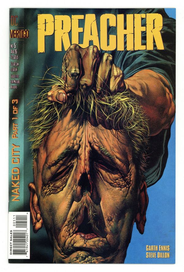 Painted cover by Glenn Fabry. Say A Prayer For Seven Bullets (Naked City Part 1), script by Garth Ennis, art by Steve Dillon; Cassidy, Custer and Tulip journey to New York to begin their search for God. 36 pgs. $2.50. Cover price $2.50.