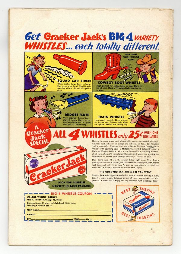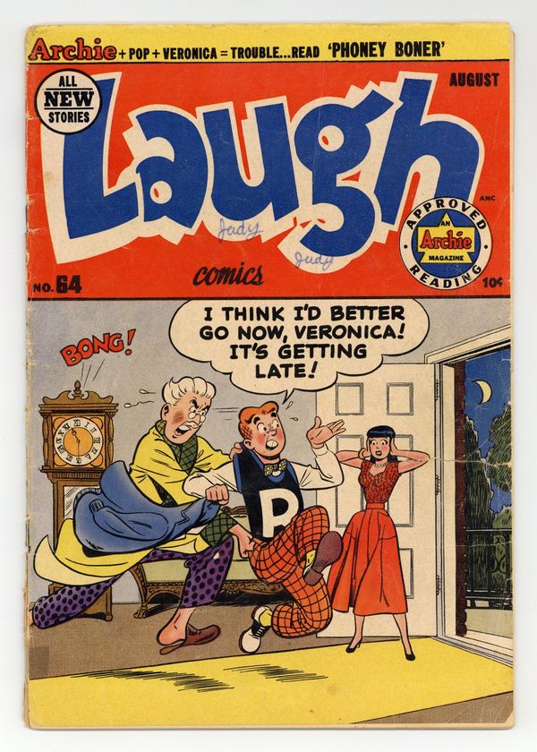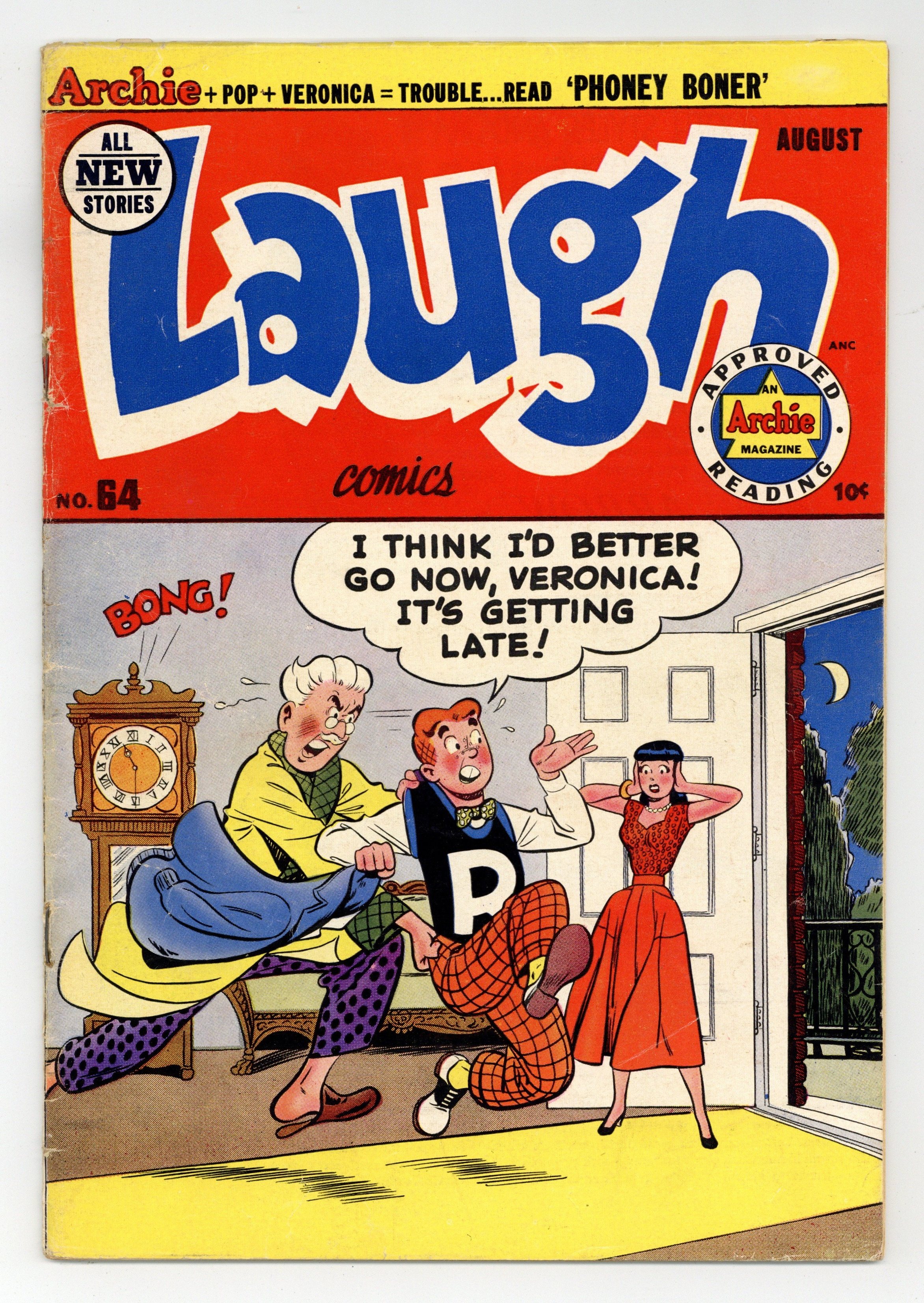 "Phoney Boner," art by Harry Lucey; Thinking Archie has lied to him in order to see Veronica, Fred heads to the park for their suspected rendezvous and runs into Muggs The Mugger. "In Search OF," script and art by Bill Woggon; Katy and Sis wade through four pages of dress designs submitted by readers in search of a plot for their comic book feature. "A Head of the Game"; Jughead gets a fifty dollar settlement from an insurance company for falling in front of Pop's Choc'lit Shoppe; When Reggie hears of it, he sets his sights on getting some of the money. "Lost and Found," script by Frank Doyle, pencils by Bill Vigoda; When Veronica learns that Archie is meeting Betty to get some of her pound cake, she strong-arms him into refusing Betty's cake and taking hers. "A Colorful Idea," art by Samm Schwartz; After ruining the silk she bought to make a present for Ferdie, Suzie adapts. "The Vest Things In Life," pencils by Joe Edwards; Seeing how jealous Wilbur is over the impression Slats' vest made on Laurie, Red secures his friend a vest of his own. "Give Him Air," art by Samm Schwartz; Suzie gets some bad news from a public scale. 36 pgs., full color. Cover price $0.10.