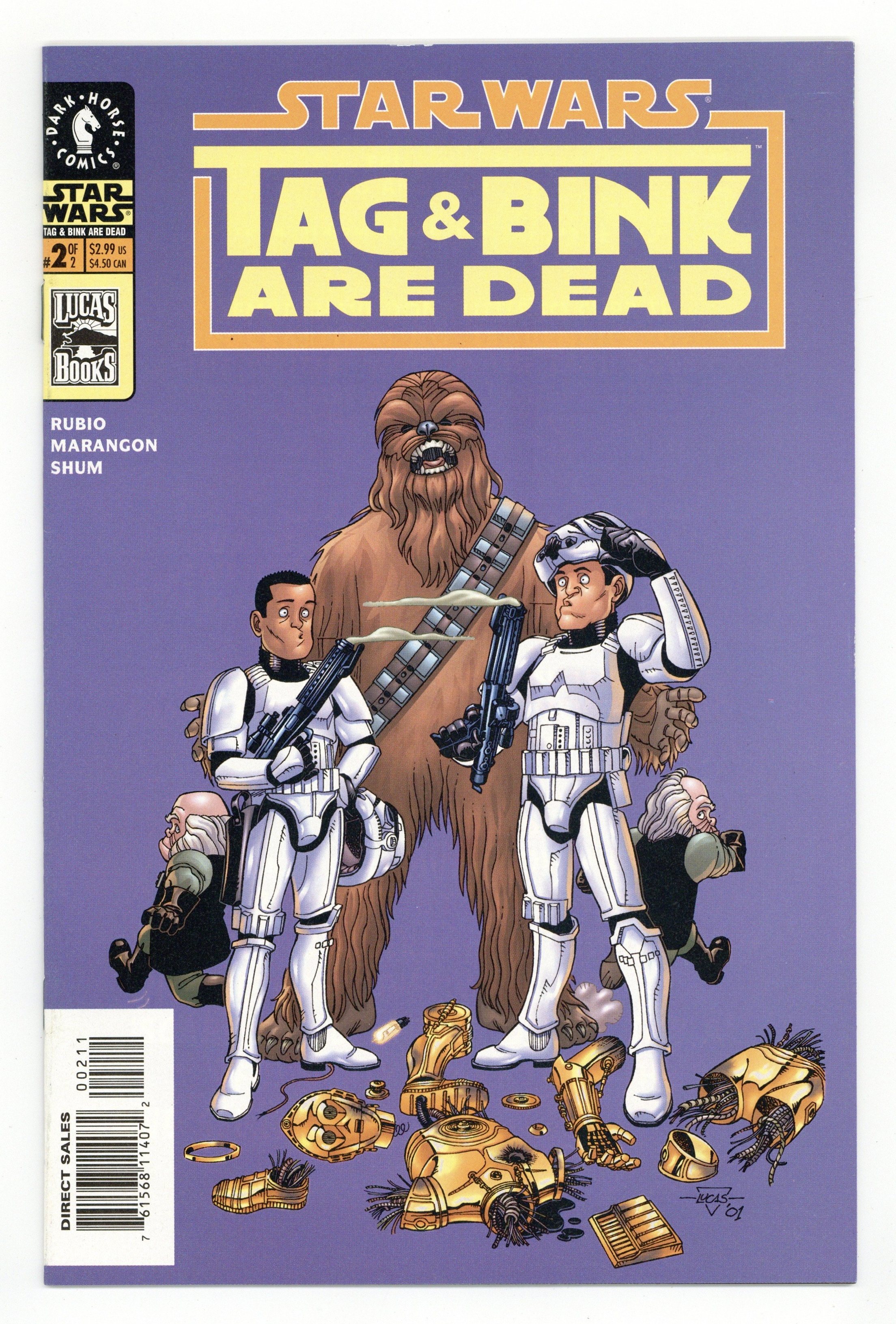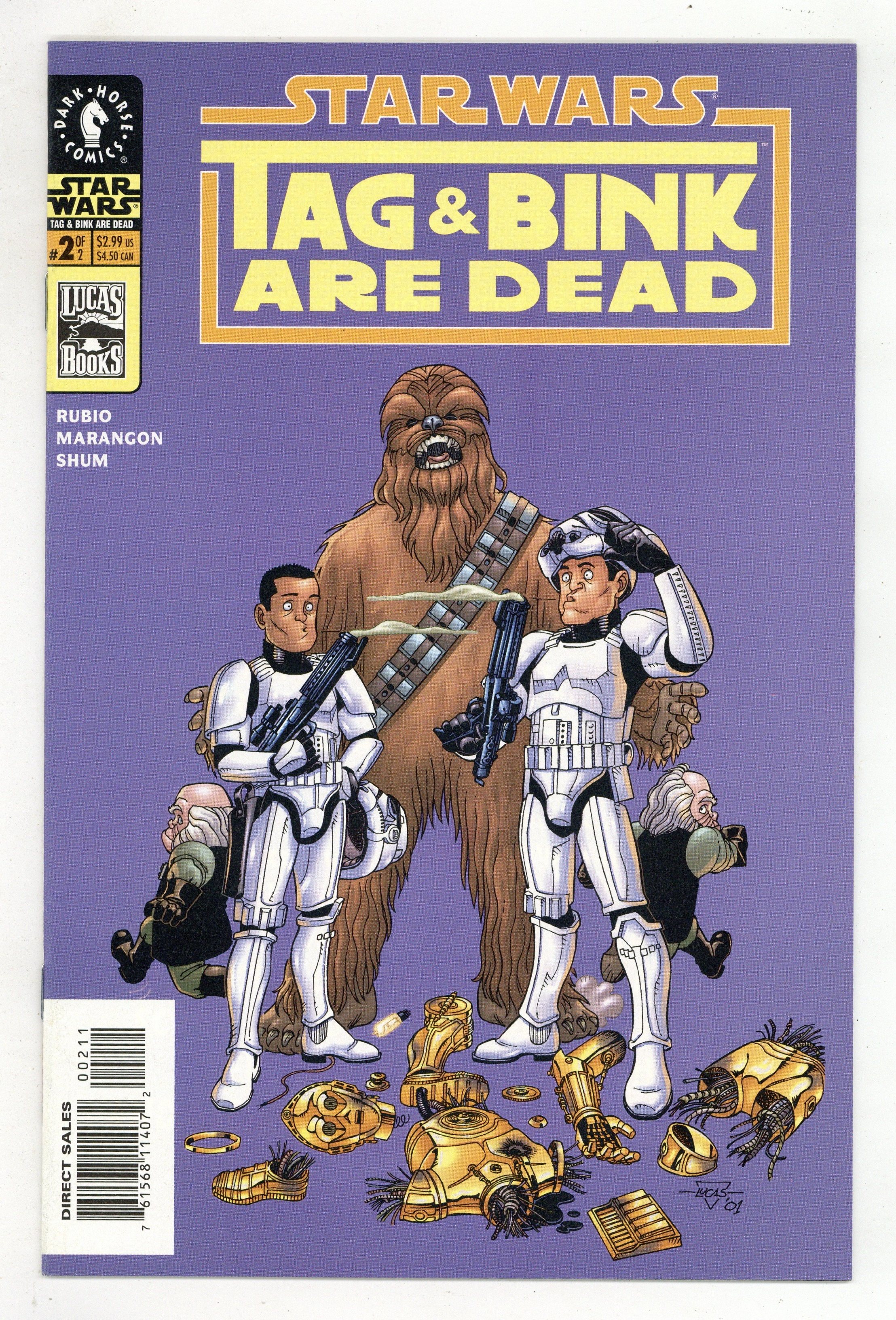 Tags: Star WarsPublished Nov 2001 by Dark Horse.$15.50by KEVIN RUBIO and LUCAS MARANGON; cover by LUCAS MARANGON Tag Greenly and Bink Otauna are dead. The two rebel soldiers chose to disguise themselves as Stormtroopers to escape the icy clutch of death. Eventually they found their way onto the Death Star where they (along with everyone else on the battle station) were blown to smithereens. That's how issue #1 of Tag and Bink Are Dead ended. So, if they're dead ? how exciting is the second issue going to be?! PLENTY! And it's HILARIOUS to boot! Make sure not to miss this final chapter in the lives of Tag & Bink! Written by Kevin Rubio (creator of the Internet film sensation Troops and the laugh-riot short stories "A Death Star is Born" and "Force Fiction" from Star Wars Tales) and illustrated by the masterful Lucas Marangon. On sale November 7 FC, 32pg (2 of 2) . . . $2.99 Cover price $2.99.
