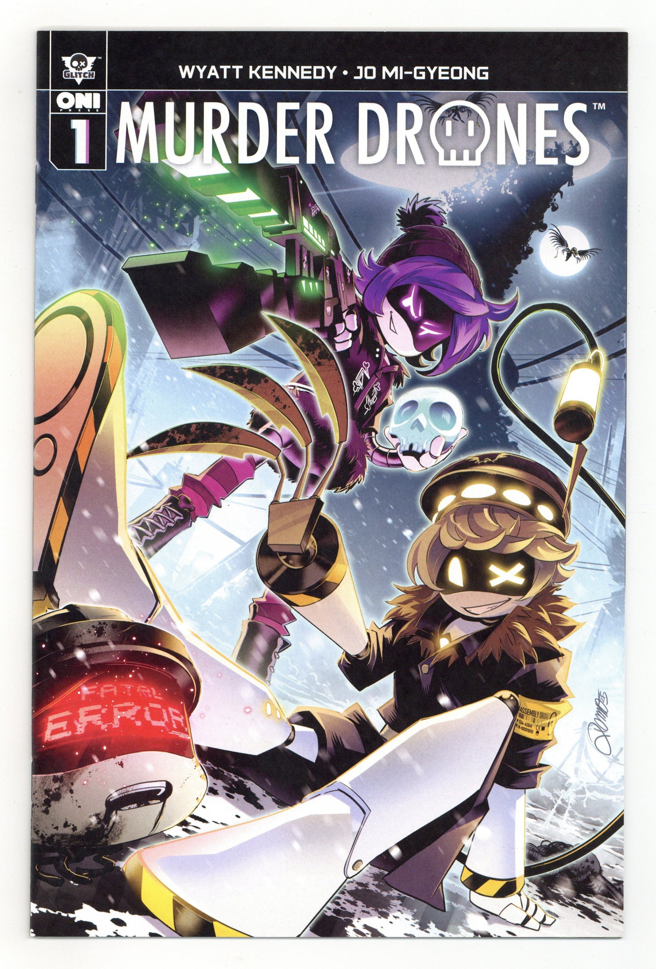 $18.00(W) Wyatt Kennedy (A) Jo Mi-Gyeong (CA) Alessio Zonno Based on Glitch Productions' global animation phenomenon created by Liam Vickers and now streaming on Prime Video, it's three cheers for 'destroy all humans' as all-star creators Wyatt Kennedy (Nights, Marvel Voices) and Jo Mi-Gyeong (Eve, The Dark Crystal: Age of Resistance) unleash the record-setting comics adaptation of the series that you have watched 330 million times: MURDER DRONES! In the far future on the desolate exoplanet designated Copper 9, the humans are long gone but the robotic worker drones they created to mine the planet's resources are still hard at work. Together, they have managed to forge their own makeshift society . . . or so they thought until a previously unknown kind of robot—the dreaded 'Murder Drones'—are activated by a long-forgotten human-scripted protocol to disassemble any worker that deviates from its original programming. But when a rebellious young worker drone named Uzi forms an unlikely alliance with two disassembly drones—Serial Designations N and V—can they, together, uncover the secrets of their origins . . . and stop the spread of the unsettling mechanical virus known as the Absolute Solver? Robots, violence, teen angst, mad science, love, loss, doors, hormones, and chaos! What more could you ask for? A pen, perhaps? It's a clicky pen! (Ask your kids. They'll get it!) 32 pages, full color, not rated. Cover price $4.99.