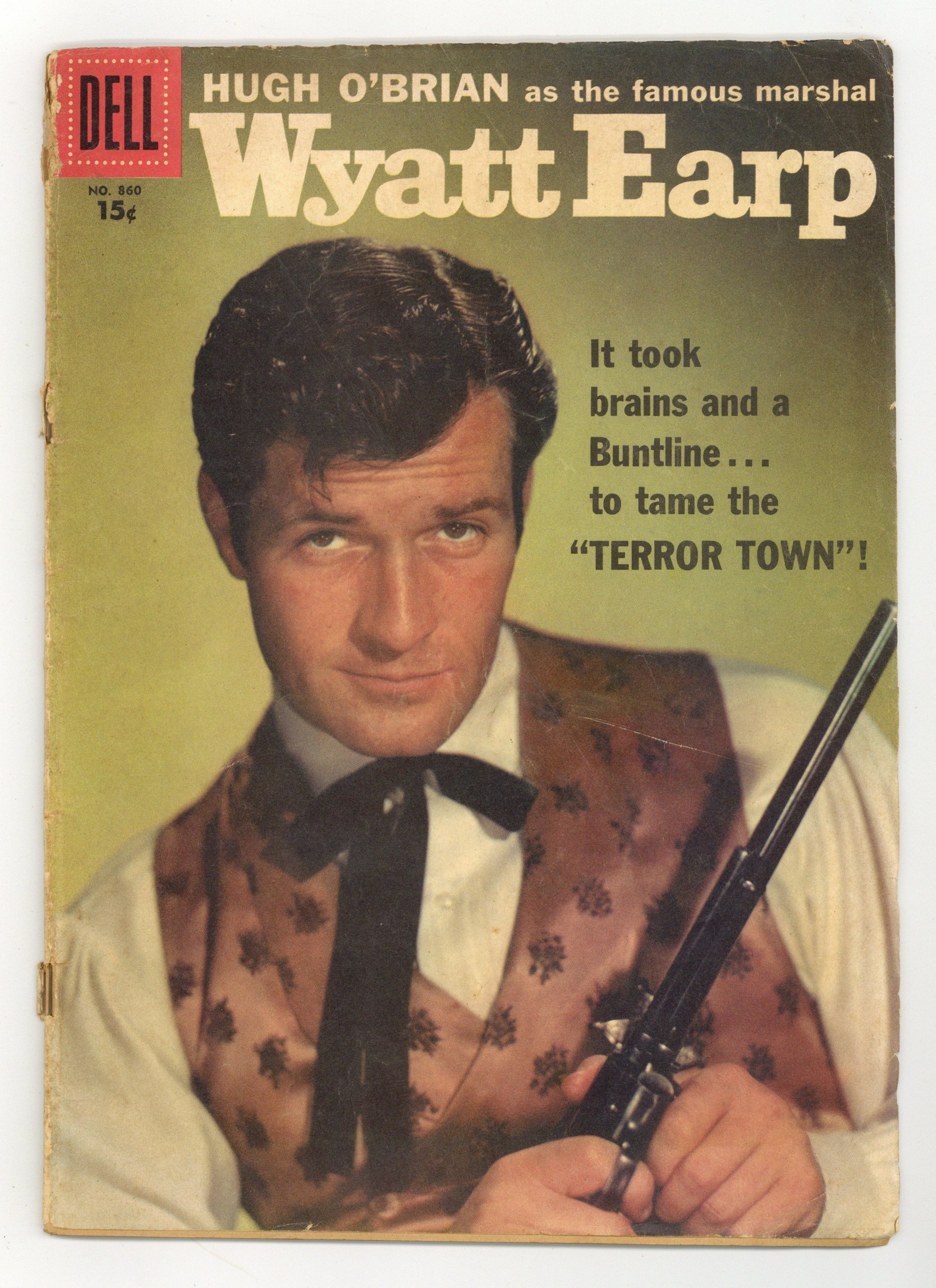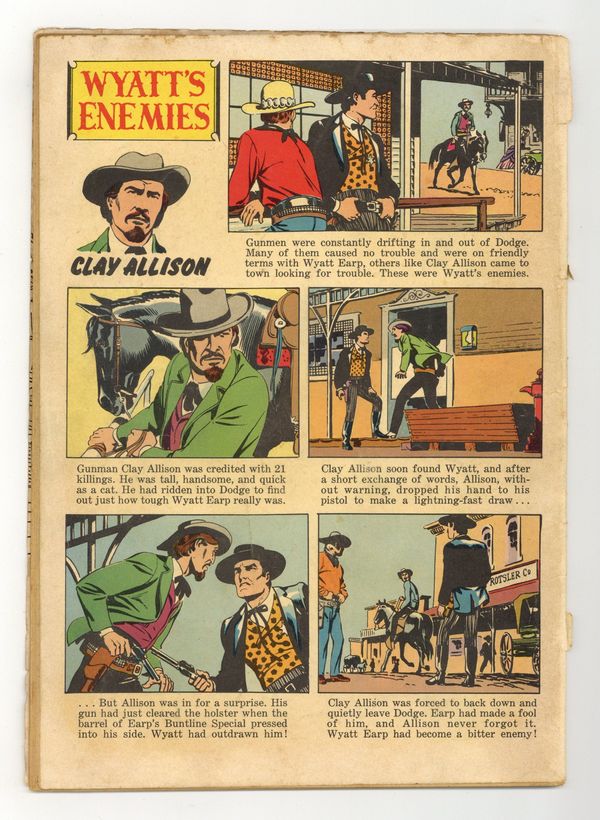 15ยข Edition. Indicia title is "WYATT EARP, No. 860." Based on the "Wyatt Earp" TV series. Cover photo of Wyatt Earp (as played by Hugh O'Brian). Terror Town, script by Eric Freiwald and Robert Schaefer, art by Russ Manning; After gunmen rob a stage and take the Mayor of Dodge City hostage, Wyatt Earp and his deputy track them to an old Army post on a high mesa. Doomsday at Dodge City, script by Eric Freiwald and Robert Schaefer, art by Russ Manning; Bank robber Loop Hackett comes to Dodge to settle a score with Wyatt Earp. Short biography of frontier law officer Bill Tilghman, art by Manning. An account of a showdown between Wyatt Earp and Clay Allison, art by Manning. 36 pages, full color. Cover price $0.10.