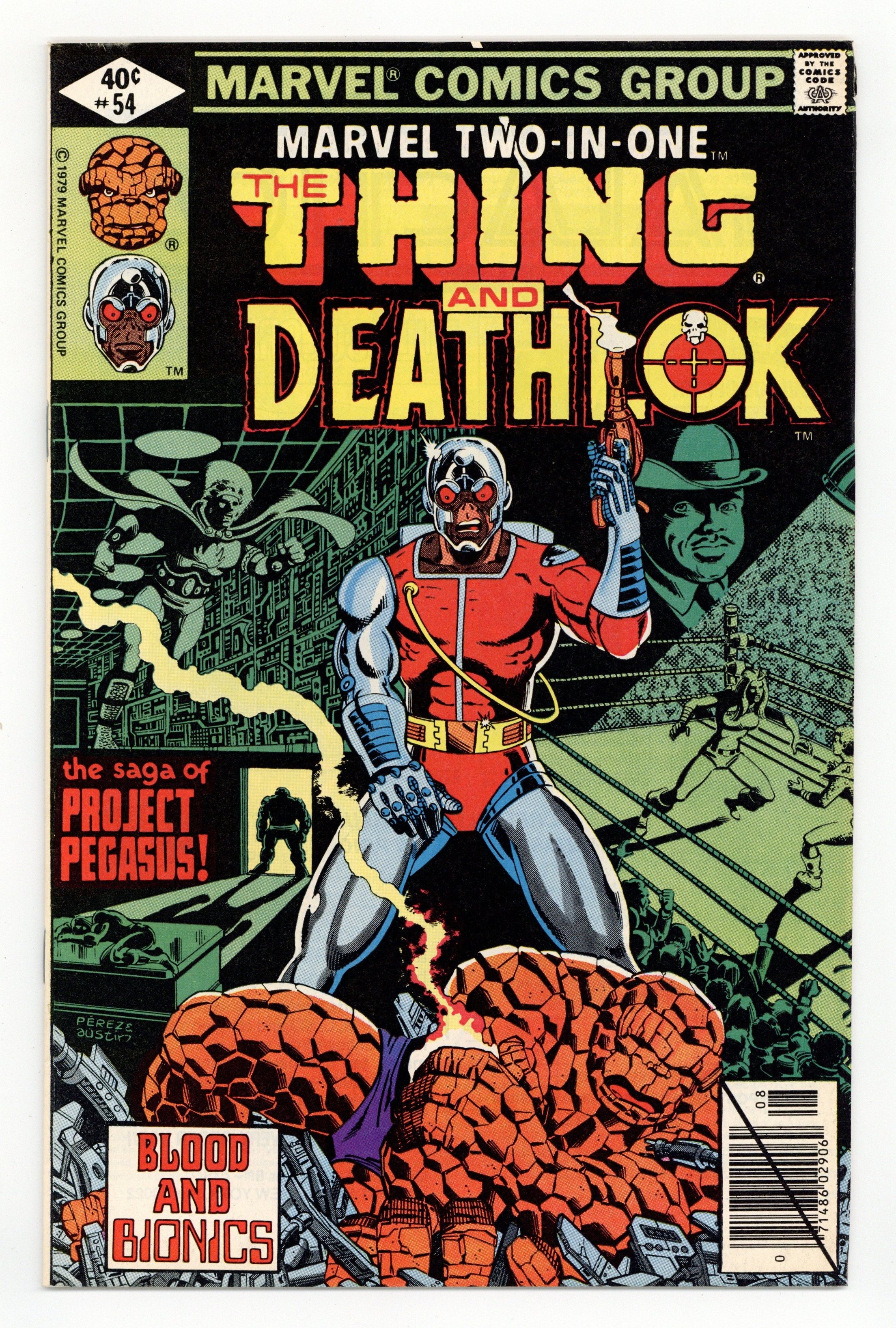 Direct Edition. Cover by George Pérez and Terry Austin. The Pegasus Project. Part 2 of 6. "Blood and Bionics!" Guest-starring Deathlok and Quasar. Thundra cameo. Story by Mark Gruenwald and Ralph Macchio. Art by John Byrne and Joe Sinnot. Can even the combined might of the Thing and Quasar take down the cybernetic killer from the future known as Deathlok? Plus beware, there is betrayal at Project: Pegasus. Cover price $0.40.