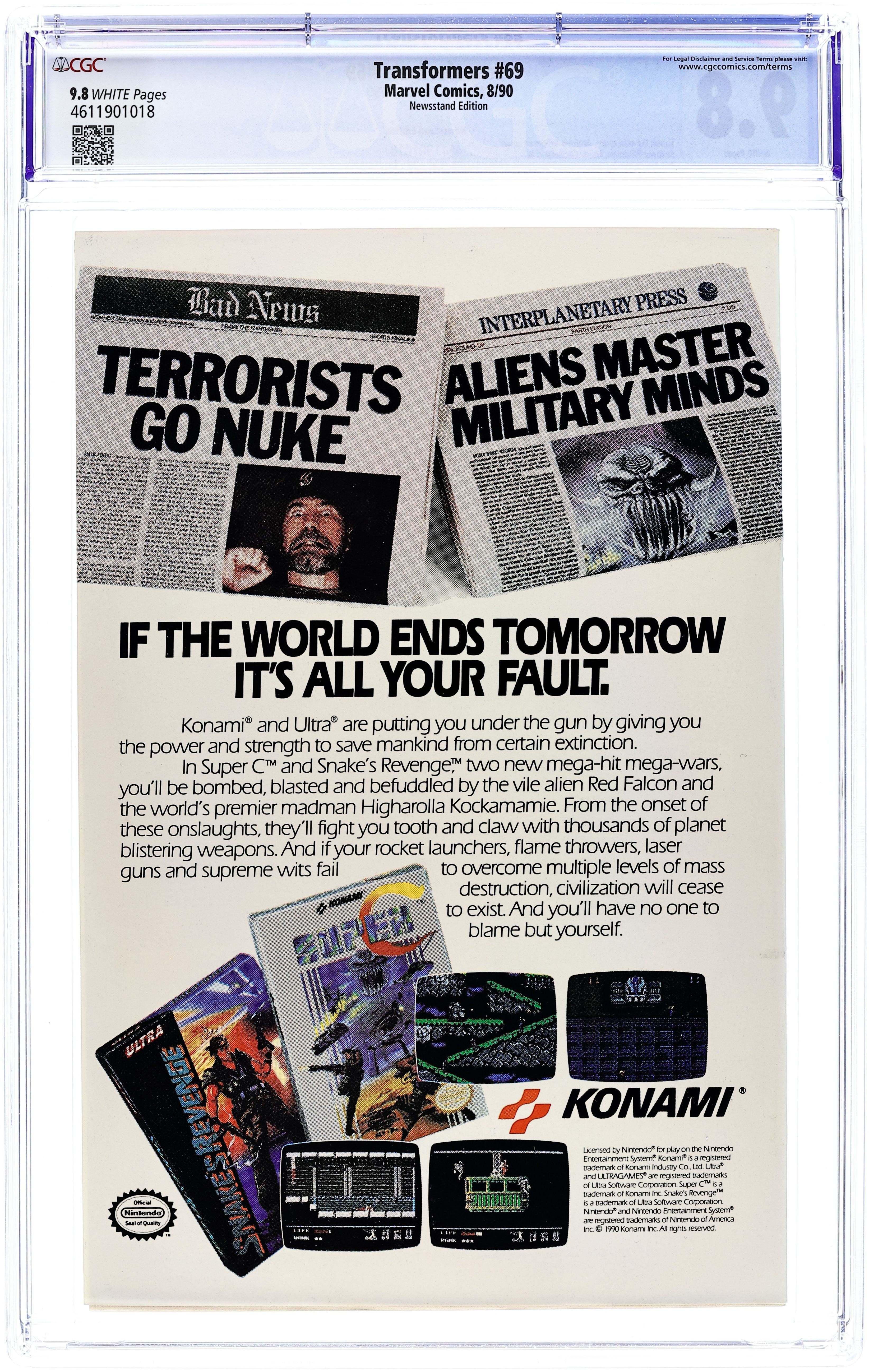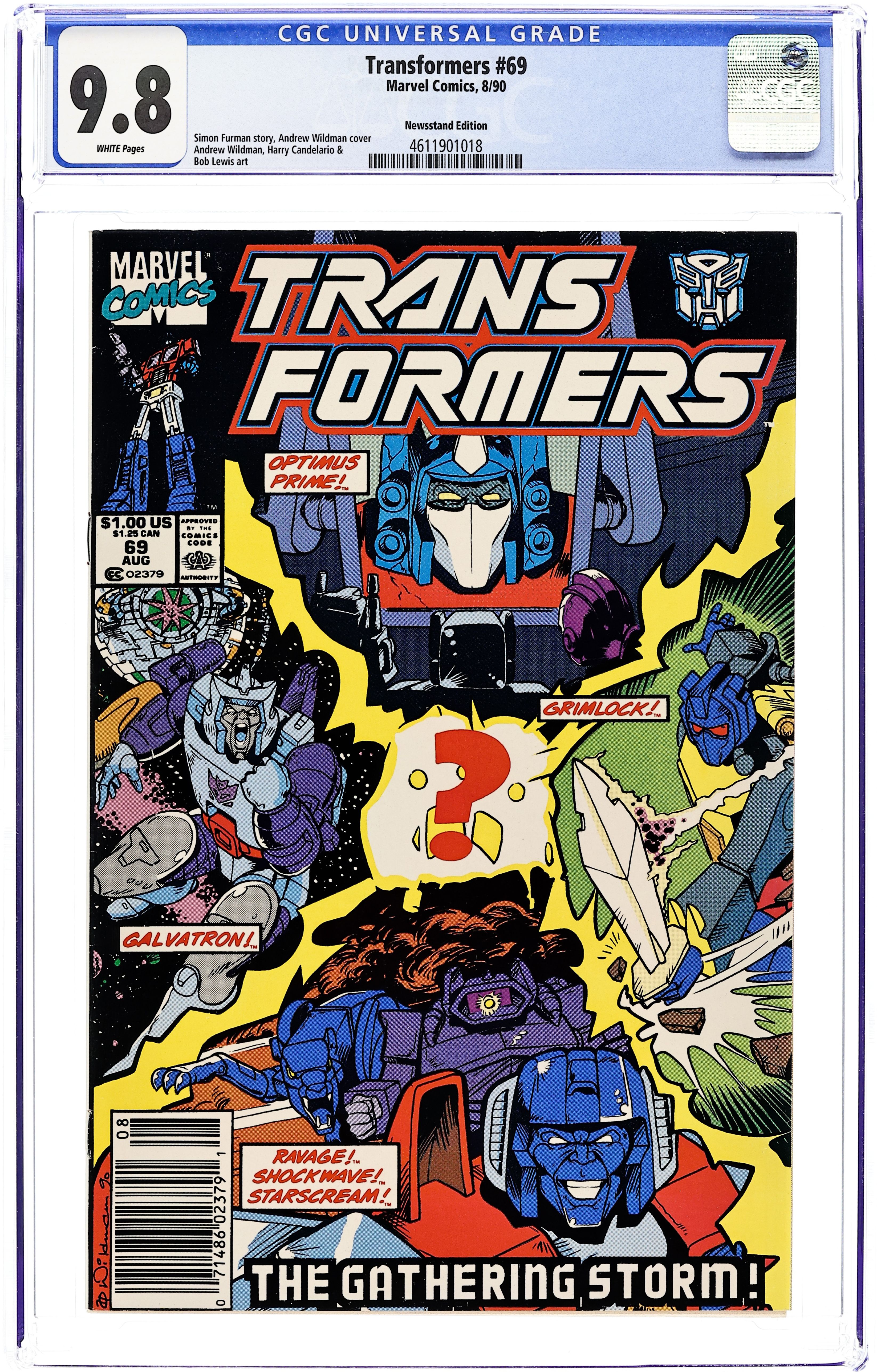 Newsstand Edition. Things are calm and relaxed on the Ark and all seems well. But Grimlock is worried that all of the calm and relaxation is blunting the Autobots battle readiness in Eye of the Storm. Script by Simon Furman and art by Andrew Wildman & Harry Candelario & Bob Lewis. Issue also has profile pages on Mindwipe Decepticon and Fastlane Autobot. Cover price $1.00.