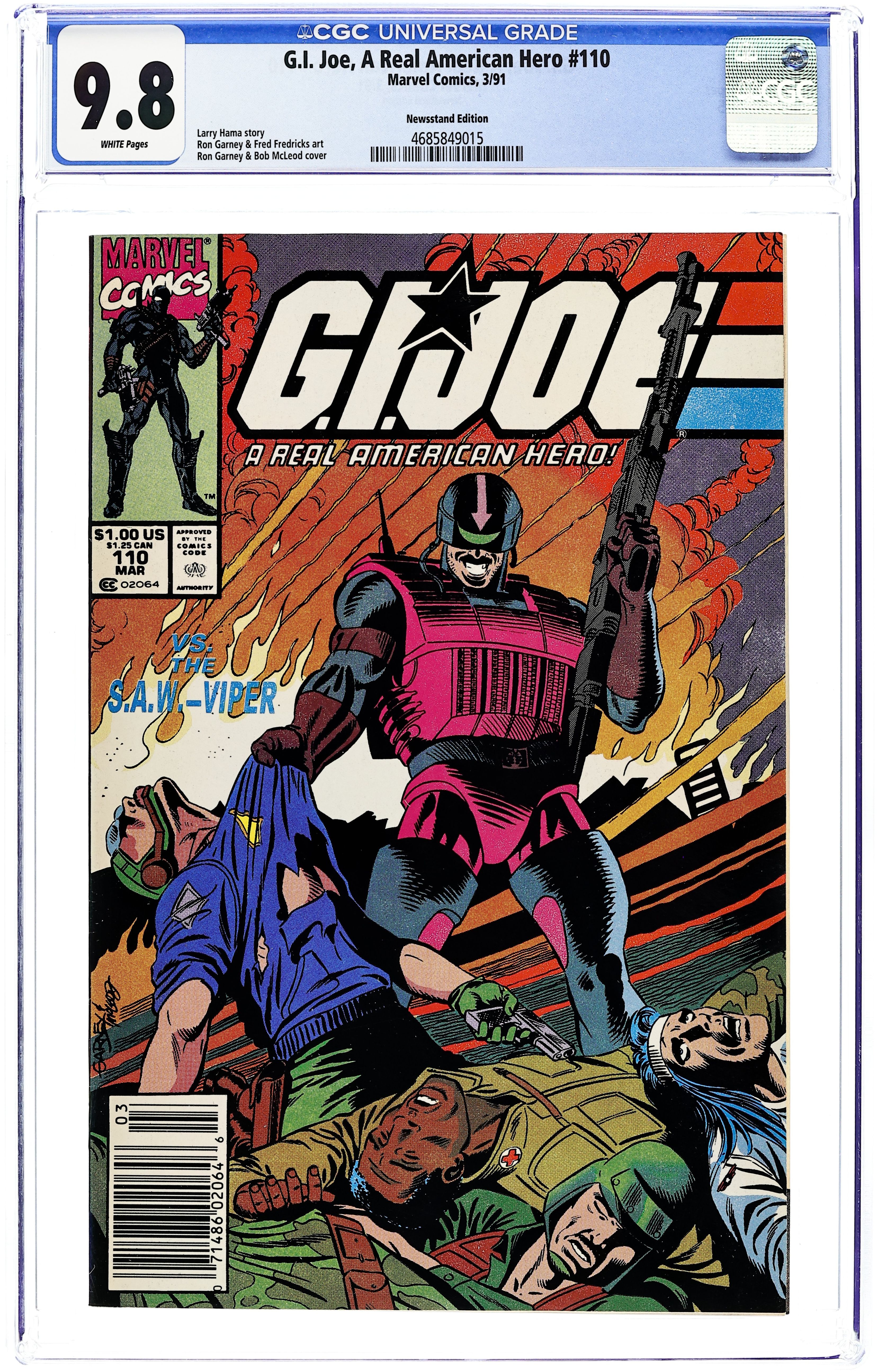 Newsstand Edition. In the aftermath of terrible losses, the Joes face a worsening Middle East situation, and Cobra Commander continues his own offensive at home. "Escalator to Armageddon" is written by Larry Hama, with art by Ron Garney and Fred Fredericks. Plus: a Lady Jaye dossier drawn by Michael Golden. Cover by Ron Garney and Bob McLeod. Cover price $1.00.