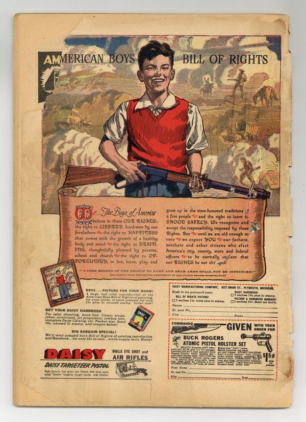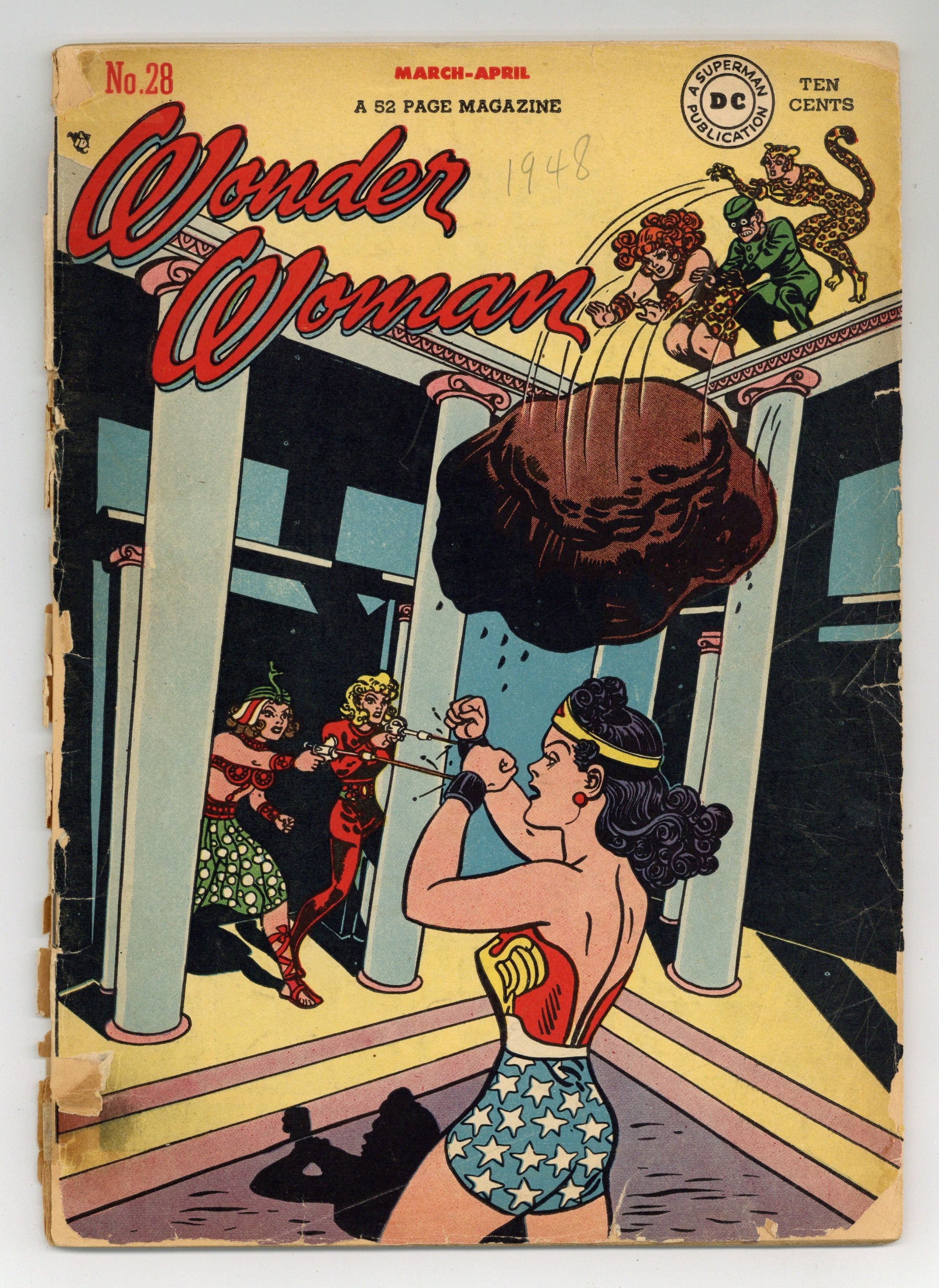 Cover by Harry G. Peter. "Villainy Incorporated" (Part 1), script by Joye Hummel (as Charles Moulton), art by Harry G. Peter; As Wonder Woman brings Saturian women to Transformation Island, one of them, Eviless, escapes and gets control of Wonder Woman's magic lasso. "Trap of Crimson Flame" (Part 2), script by Joye Hummel (as Charles Moulton), art by Harry G. Peter; Villainy, Inc. succeeds in capturing Queen Hippolyte and the rest of the Amazons, then summon Wonder Woman, planning to kill her and Queen Hippolyte. Wonder Women of History: two-page Elizabeth Barrett Browning bio, art by Robert Sale. Two-page text story, "Recoil" by Ted Udall. "In The Hands of the Merciless" (Part 3), script by Joye Hummel (as Charles Moulton), art by Harry G. Peter; The four remaining members of Villainy, Inc. have fled to the man's world with Hippolyte's jewels. 52 Pages, Full Color. Cover price $0.10.