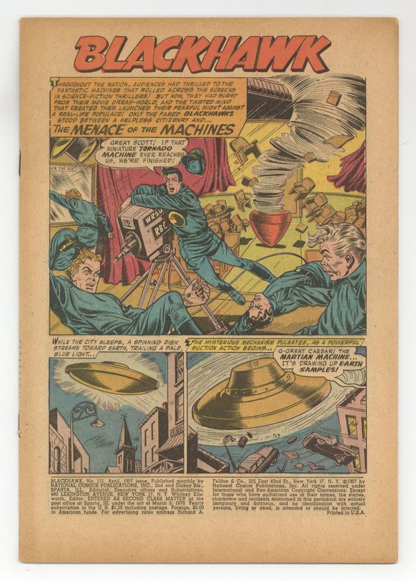 Cover by Dick Dillin & Charles Cuidera. Stories by unknown. Art by Dick Dillin, Charles Cuidera and Sheldon Moldoff. Three stories! "The Menace of the Machines" - A crazed film special effects genius creates miniature machines to steal for him and challenges the Blackhawks to stop him. Plus: "The Perils of Blackie, the Wonder Bird" - Blackie, the team's mascot hawk, is sent to retrieve a message from an undercover agent, then must evade the smugglers trying to keep the Blackhawks from receiving the message. And: "Trigger Craig's Magic Carpet" - Gangster Trigger Craig finds a magic flying carpet and embarks on a crime spree. 32 pages, full color. Cover price $0.10.