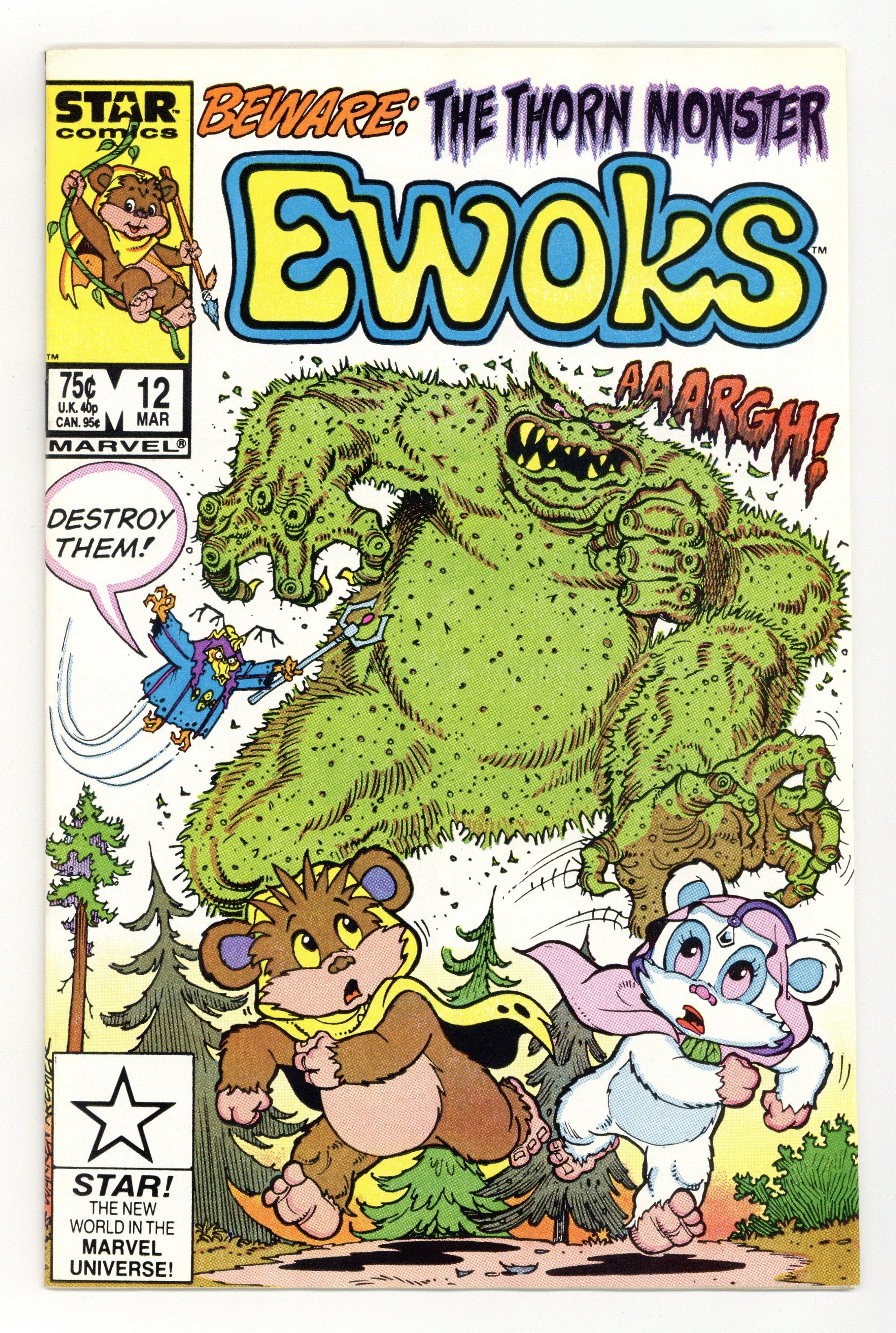 Tags: Star WarsPublished Mar 1987 by Marvel/Star Comics.$19.50The Thorn Monster - Written by Dave Manak. Art by Warren Kremer, Jon D'Agostino and Jacqueline Roettcher. Cover by Warren Kremer. Beware...the Thorn Monster! Characters in this issue: Wicket; Princess Kneesaa; Morag; Logray; Chief Chirpa. 32 pages, full color. Cover price $0.75.