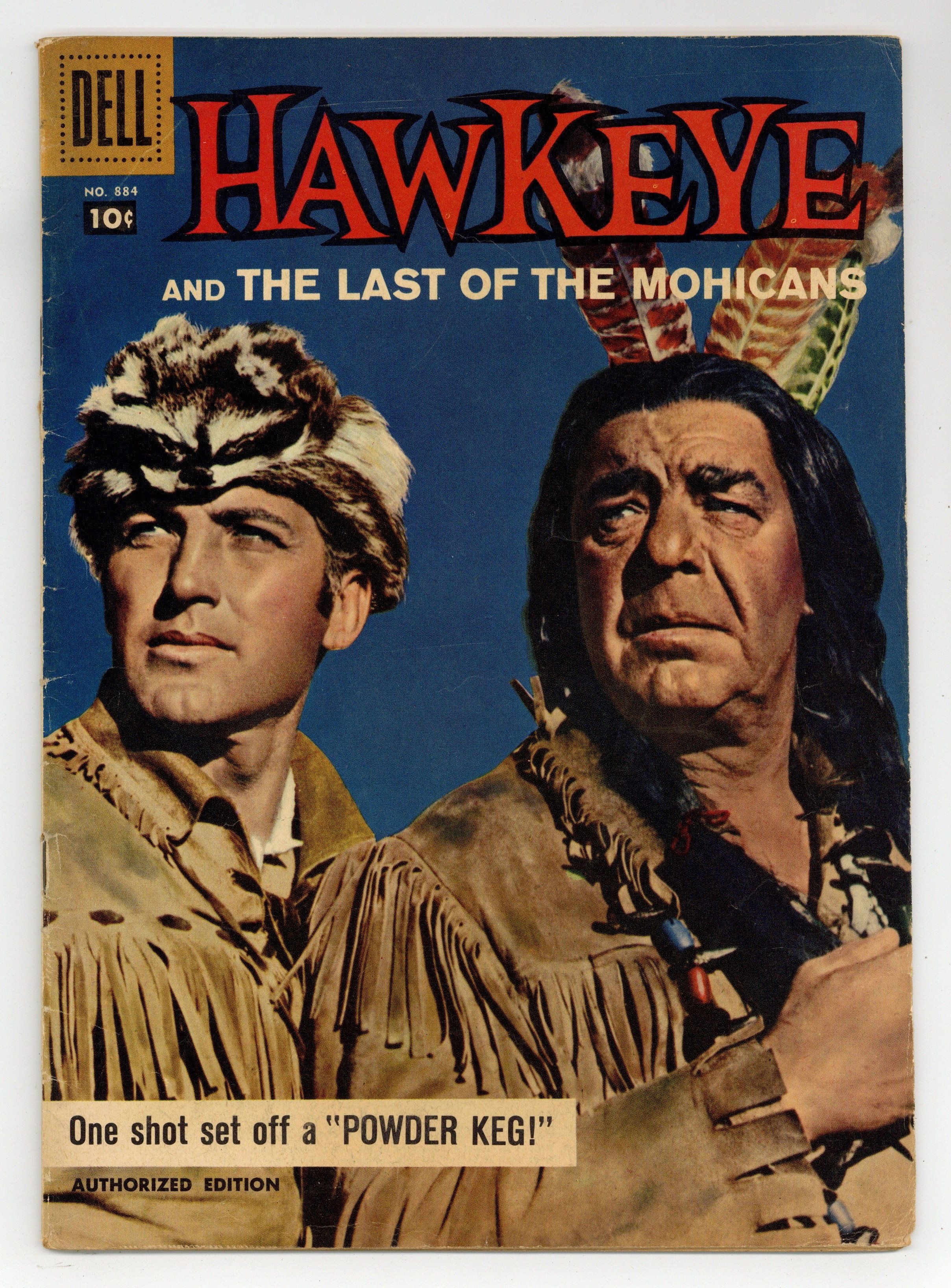 Indicia title is "HAWKEYE AND THE LAST OF THE MOHICANS, No. 884". Based on the syndicated TV series "Hawkeye and the Last of the Mohicans." Photo cover of John Hart (as Nat "Hawkeye" Cutler) and Lon Chaney, Jr. (as Chingachgook). One large action photo with short teaser for first story. False Witness; two white men, Jake Collins and Hans Bachus, engage Indians to help them with a racket; they sell wagons to settlers. Powder Keg; The leader of a fur-trading company makes a deal with Huron Indians to provide them with rifles and gunpowder in exchange for their furs; He gives the Indians rifles, but has no gunpowder. Facts about Indian alliances with the French and English in 18th Century North America. Facts about Indian methods of fighting the early settlers of North America. All interior art by Bob Jenney. 36 pages, full color. Cover price $0.10.